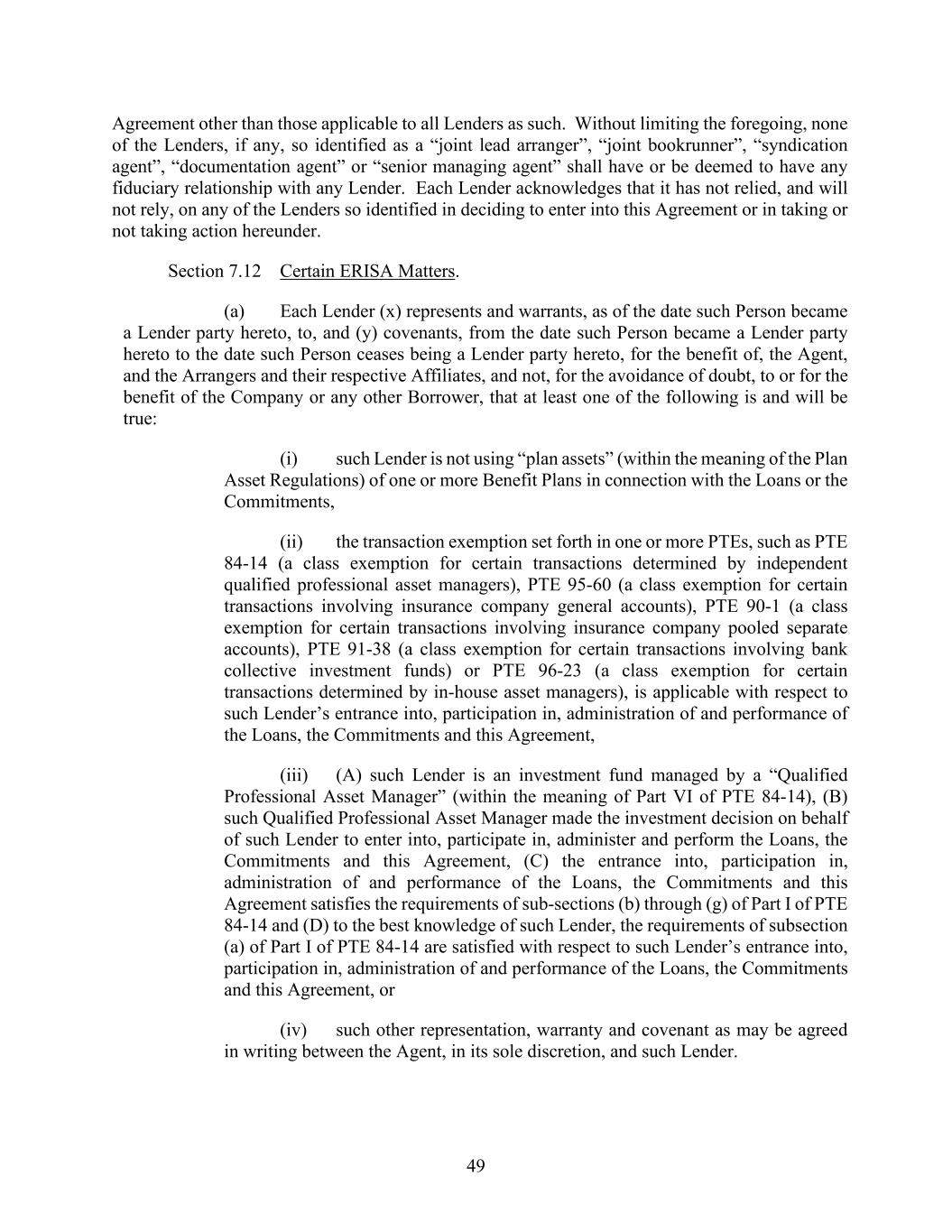 49 Agreement other than those applicable to all Lenders as such. Without limiting the foregoing, none of the Lenders, if any, so identified as a “joint lead arranger”, “joint bookrunner”, “syndication agent”, “documentation agent” or “senior managing agent” shall have or be deemed to have any fiduciary relationship with any Lender. Each Lender acknowledges that it has not relied, and will not rely, on any of the Lenders so identified in deciding to enter into this Agreement or in taking or not taking action hereunder. Section 7.12 Certain ERISA Matters. (a) Each Lender (x) represents and warrants, as of the date such Person became a Lender party hereto, to, and (y) covenants, from the date such Person became a Lender party hereto to the date such Person ceases being a Lender party hereto, for the benefit of, the Agent, and the Arrangers and their respective Affiliates, and not, for the avoidance of doubt, to or for the benefit of the Company or any other Borrower, that at least one of the following is and will be true: (i) such Lender is not using “plan assets” (within the meaning of the Plan Asset Regulations) of one or more Benefit Plans in connection with the Loans or the Commitments, (ii) the transaction exemption set forth in one or more PTEs, such as PTE 84-14 (a class exemption for certain transactions determined by independent qualified professional asset managers), PTE 95-60 (a class exemption for certain transactions involving insurance company general accounts), PTE 90-1 (a class exemption for certain transactions involving insurance company pooled separate accounts), PTE 91-38 (a class exemption for certain transactions involving bank collective investment funds) or PTE 96-23 (a class exemption for certain transactions determined by in-house asset managers), is applicable with respect to such Lender’s entrance into, participation in, administration of and performance of the Loans, the Commitments and this Agreement, (iii) (A) such Lender is an investment fund managed by a “Qualified Professional Asset Manager” (within the meaning of Part VI of PTE 84-14), (B) such Qualified Professional Asset Manager made the investment decision on behalf of such Lender to enter into, participate in, administer and perform the Loans, the Commitments and this Agreement, (C) the entrance into, participation in, administration of and performance of the Loans, the Commitments and this Agreement satisfies the requirements of sub-sections (b) through (g) of Part I of PTE 84-14 and (D) to the best knowledge of such Lender, the requirements of subsection (a) of Part I of PTE 84-14 are satisfied with respect to such Lender’s entrance into, participation in, administration of and performance of the Loans, the Commitments and this Agreement, or (iv) such other representation, warranty and covenant as may be agreed in writing between the Agent, in its sole discretion, and such Lender.