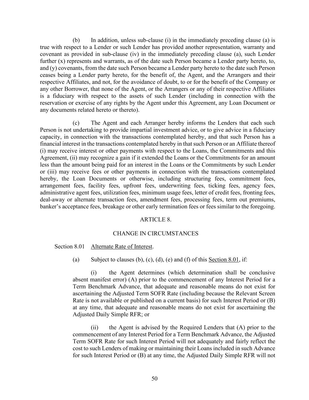 50 (b) In addition, unless sub-clause (i) in the immediately preceding clause (a) is true with respect to a Lender or such Lender has provided another representation, warranty and covenant as provided in sub-clause (iv) in the immediately preceding clause (a), such Lender further (x) represents and warrants, as of the date such Person became a Lender party hereto, to, and (y) covenants, from the date such Person became a Lender party hereto to the date such Person ceases being a Lender party hereto, for the benefit of, the Agent, and the Arrangers and their respective Affiliates, and not, for the avoidance of doubt, to or for the benefit of the Company or any other Borrower, that none of the Agent, or the Arrangers or any of their respective Affiliates is a fiduciary with respect to the assets of such Lender (including in connection with the reservation or exercise of any rights by the Agent under this Agreement, any Loan Document or any documents related hereto or thereto). (c) The Agent and each Arranger hereby informs the Lenders that each such Person is not undertaking to provide impartial investment advice, or to give advice in a fiduciary capacity, in connection with the transactions contemplated hereby, and that such Person has a financial interest in the transactions contemplated hereby in that such Person or an Affiliate thereof (i) may receive interest or other payments with respect to the Loans, the Commitments and this Agreement, (ii) may recognize a gain if it extended the Loans or the Commitments for an amount less than the amount being paid for an interest in the Loans or the Commitments by such Lender or (iii) may receive fees or other payments in connection with the transactions contemplated hereby, the Loan Documents or otherwise, including structuring fees, commitment fees, arrangement fees, facility fees, upfront fees, underwriting fees, ticking fees, agency fees, administrative agent fees, utilization fees, minimum usage fees, letter of credit fees, fronting fees, deal-away or alternate transaction fees, amendment fees, processing fees, term out premiums, banker’s acceptance fees, breakage or other early termination fees or fees similar to the foregoing. ARTICLE 8. CHANGE IN CIRCUMSTANCES Section 8.01 Alternate Rate of Interest. (a) Subject to clauses (b), (c), (d), (e) and (f) of this Section 8.01, if: (i) the Agent determines (which determination shall be conclusive absent manifest error) (A) prior to the commencement of any Interest Period for a Term Benchmark Advance, that adequate and reasonable means do not exist for ascertaining the Adjusted Term SOFR Rate (including because the Relevant Screen Rate is not available or published on a current basis) for such Interest Period or (B) at any time, that adequate and reasonable means do not exist for ascertaining the Adjusted Daily Simple RFR; or (ii) the Agent is advised by the Required Lenders that (A) prior to the commencement of any Interest Period for a Term Benchmark Advance, the Adjusted Term SOFR Rate for such Interest Period will not adequately and fairly reflect the cost to such Lenders of making or maintaining their Loans included in such Advance for such Interest Period or (B) at any time, the Adjusted Daily Simple RFR will not