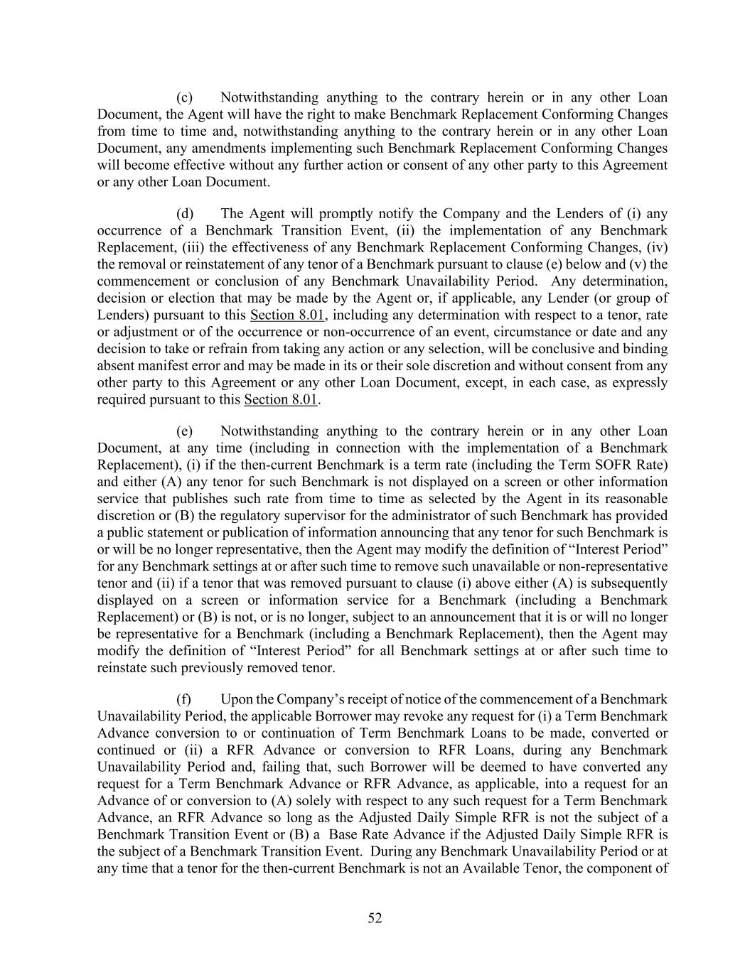 52 (c) Notwithstanding anything to the contrary herein or in any other Loan Document, the Agent will have the right to make Benchmark Replacement Conforming Changes from time to time and, notwithstanding anything to the contrary herein or in any other Loan Document, any amendments implementing such Benchmark Replacement Conforming Changes will become effective without any further action or consent of any other party to this Agreement or any other Loan Document. (d) The Agent will promptly notify the Company and the Lenders of (i) any occurrence of a Benchmark Transition Event, (ii) the implementation of any Benchmark Replacement, (iii) the effectiveness of any Benchmark Replacement Conforming Changes, (iv) the removal or reinstatement of any tenor of a Benchmark pursuant to clause (e) below and (v) the commencement or conclusion of any Benchmark Unavailability Period. Any determination, decision or election that may be made by the Agent or, if applicable, any Lender (or group of Lenders) pursuant to this Section 8.01, including any determination with respect to a tenor, rate or adjustment or of the occurrence or non-occurrence of an event, circumstance or date and any decision to take or refrain from taking any action or any selection, will be conclusive and binding absent manifest error and may be made in its or their sole discretion and without consent from any other party to this Agreement or any other Loan Document, except, in each case, as expressly required pursuant to this Section 8.01. (e) Notwithstanding anything to the contrary herein or in any other Loan Document, at any time (including in connection with the implementation of a Benchmark Replacement), (i) if the then-current Benchmark is a term rate (including the Term SOFR Rate) and either (A) any tenor for such Benchmark is not displayed on a screen or other information service that publishes such rate from time to time as selected by the Agent in its reasonable discretion or (B) the regulatory supervisor for the administrator of such Benchmark has provided a public statement or publication of information announcing that any tenor for such Benchmark is or will be no longer representative, then the Agent may modify the definition of “Interest Period” for any Benchmark settings at or after such time to remove such unavailable or non-representative tenor and (ii) if a tenor that was removed pursuant to clause (i) above either (A) is subsequently displayed on a screen or information service for a Benchmark (including a Benchmark Replacement) or (B) is not, or is no longer, subject to an announcement that it is or will no longer be representative for a Benchmark (including a Benchmark Replacement), then the Agent may modify the definition of “Interest Period” for all Benchmark settings at or after such time to reinstate such previously removed tenor. (f) Upon the Company’s receipt of notice of the commencement of a Benchmark Unavailability Period, the applicable Borrower may revoke any request for (i) a Term Benchmark Advance conversion to or continuation of Term Benchmark Loans to be made, converted or continued or (ii) a RFR Advance or conversion to RFR Loans, during any Benchmark Unavailability Period and, failing that, such Borrower will be deemed to have converted any request for a Term Benchmark Advance or RFR Advance, as applicable, into a request for an Advance of or conversion to (A) solely with respect to any such request for a Term Benchmark Advance, an RFR Advance so long as the Adjusted Daily Simple RFR is not the subject of a Benchmark Transition Event or (B) a Base Rate Advance if the Adjusted Daily Simple RFR is the subject of a Benchmark Transition Event. During any Benchmark Unavailability Period or at any time that a tenor for the then-current Benchmark is not an Available Tenor, the component of