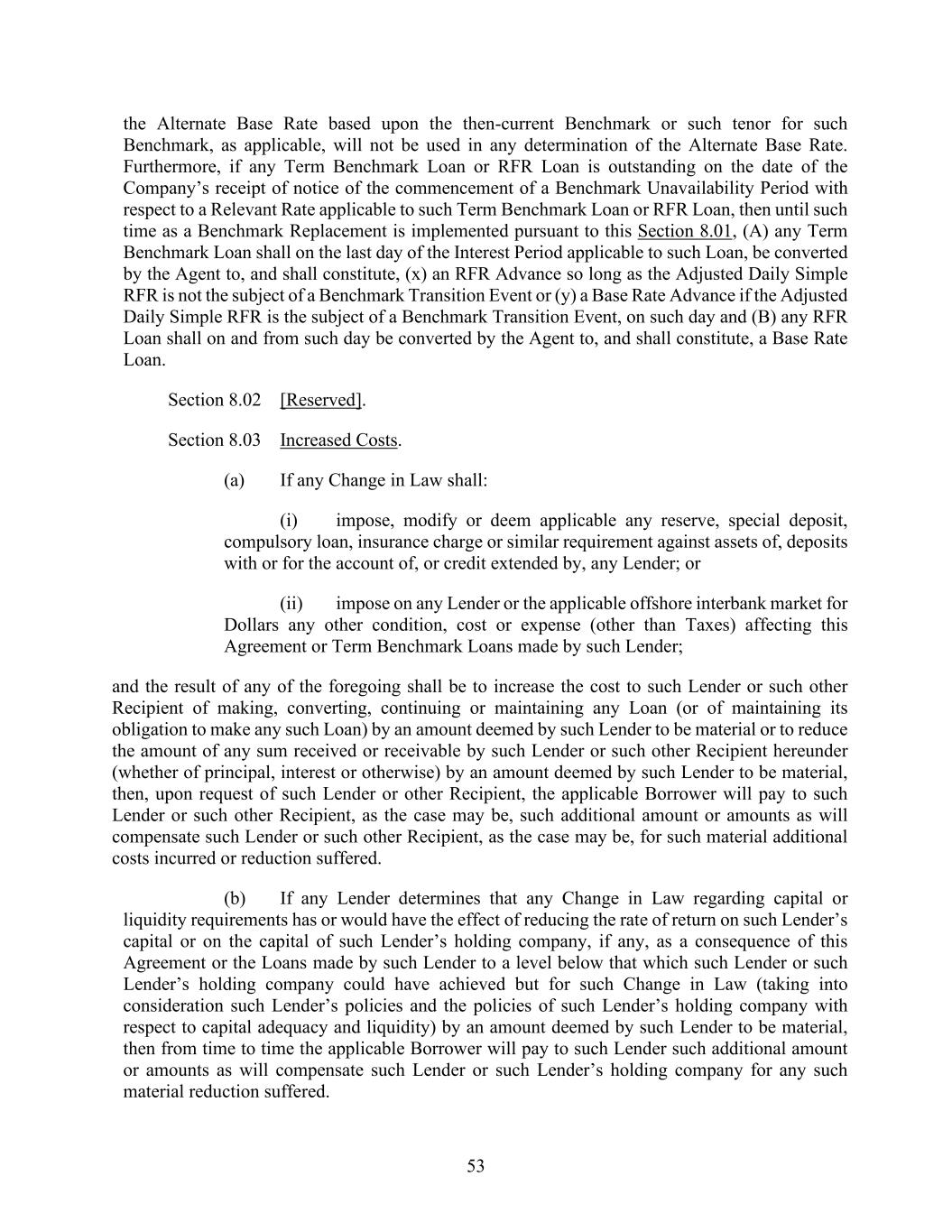 53 the Alternate Base Rate based upon the then-current Benchmark or such tenor for such Benchmark, as applicable, will not be used in any determination of the Alternate Base Rate. Furthermore, if any Term Benchmark Loan or RFR Loan is outstanding on the date of the Company’s receipt of notice of the commencement of a Benchmark Unavailability Period with respect to a Relevant Rate applicable to such Term Benchmark Loan or RFR Loan, then until such time as a Benchmark Replacement is implemented pursuant to this Section 8.01, (A) any Term Benchmark Loan shall on the last day of the Interest Period applicable to such Loan, be converted by the Agent to, and shall constitute, (x) an RFR Advance so long as the Adjusted Daily Simple RFR is not the subject of a Benchmark Transition Event or (y) a Base Rate Advance if the Adjusted Daily Simple RFR is the subject of a Benchmark Transition Event, on such day and (B) any RFR Loan shall on and from such day be converted by the Agent to, and shall constitute, a Base Rate Loan. Section 8.02 [Reserved]. Section 8.03 Increased Costs. (a) If any Change in Law shall: (i) impose, modify or deem applicable any reserve, special deposit, compulsory loan, insurance charge or similar requirement against assets of, deposits with or for the account of, or credit extended by, any Lender; or (ii) impose on any Lender or the applicable offshore interbank market for Dollars any other condition, cost or expense (other than Taxes) affecting this Agreement or Term Benchmark Loans made by such Lender; and the result of any of the foregoing shall be to increase the cost to such Lender or such other Recipient of making, converting, continuing or maintaining any Loan (or of maintaining its obligation to make any such Loan) by an amount deemed by such Lender to be material or to reduce the amount of any sum received or receivable by such Lender or such other Recipient hereunder (whether of principal, interest or otherwise) by an amount deemed by such Lender to be material, then, upon request of such Lender or other Recipient, the applicable Borrower will pay to such Lender or such other Recipient, as the case may be, such additional amount or amounts as will compensate such Lender or such other Recipient, as the case may be, for such material additional costs incurred or reduction suffered. (b) If any Lender determines that any Change in Law regarding capital or liquidity requirements has or would have the effect of reducing the rate of return on such Lender’s capital or on the capital of such Lender’s holding company, if any, as a consequence of this Agreement or the Loans made by such Lender to a level below that which such Lender or such Lender’s holding company could have achieved but for such Change in Law (taking into consideration such Lender’s policies and the policies of such Lender’s holding company with respect to capital adequacy and liquidity) by an amount deemed by such Lender to be material, then from time to time the applicable Borrower will pay to such Lender such additional amount or amounts as will compensate such Lender or such Lender’s holding company for any such material reduction suffered.