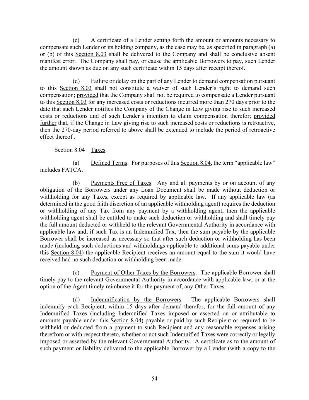 54 (c) A certificate of a Lender setting forth the amount or amounts necessary to compensate such Lender or its holding company, as the case may be, as specified in paragraph (a) or (b) of this Section 8.03 shall be delivered to the Company and shall be conclusive absent manifest error. The Company shall pay, or cause the applicable Borrowers to pay, such Lender the amount shown as due on any such certificate within 15 days after receipt thereof. (d) Failure or delay on the part of any Lender to demand compensation pursuant to this Section 8.03 shall not constitute a waiver of such Lender’s right to demand such compensation; provided that the Company shall not be required to compensate a Lender pursuant to this Section 8.03 for any increased costs or reductions incurred more than 270 days prior to the date that such Lender notifies the Company of the Change in Law giving rise to such increased costs or reductions and of such Lender’s intention to claim compensation therefor; provided further that, if the Change in Law giving rise to such increased costs or reductions is retroactive, then the 270-day period referred to above shall be extended to include the period of retroactive effect thereof . Section 8.04 Taxes. (a) Defined Terms. For purposes of this Section 8.04, the term “applicable law” includes FATCA. (b) Payments Free of Taxes. Any and all payments by or on account of any obligation of the Borrowers under any Loan Document shall be made without deduction or withholding for any Taxes, except as required by applicable law. If any applicable law (as determined in the good faith discretion of an applicable withholding agent) requires the deduction or withholding of any Tax from any payment by a withholding agent, then the applicable withholding agent shall be entitled to make such deduction or withholding and shall timely pay the full amount deducted or withheld to the relevant Governmental Authority in accordance with applicable law and, if such Tax is an Indemnified Tax, then the sum payable by the applicable Borrower shall be increased as necessary so that after such deduction or withholding has been made (including such deductions and withholdings applicable to additional sums payable under this Section 8.04) the applicable Recipient receives an amount equal to the sum it would have received had no such deduction or withholding been made. (c) Payment of Other Taxes by the Borrowers. The applicable Borrower shall timely pay to the relevant Governmental Authority in accordance with applicable law, or at the option of the Agent timely reimburse it for the payment of, any Other Taxes. (d) Indemnification by the Borrowers. The applicable Borrowers shall indemnify each Recipient, within 15 days after demand therefor, for the full amount of any Indemnified Taxes (including Indemnified Taxes imposed or asserted on or attributable to amounts payable under this Section 8.04) payable or paid by such Recipient or required to be withheld or deducted from a payment to such Recipient and any reasonable expenses arising therefrom or with respect thereto, whether or not such Indemnified Taxes were correctly or legally imposed or asserted by the relevant Governmental Authority. A certificate as to the amount of such payment or liability delivered to the applicable Borrower by a Lender (with a copy to the