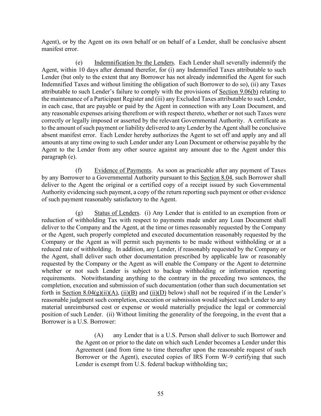 55 Agent), or by the Agent on its own behalf or on behalf of a Lender, shall be conclusive absent manifest error. (e) Indemnification by the Lenders. Each Lender shall severally indemnify the Agent, within 10 days after demand therefor, for (i) any Indemnified Taxes attributable to such Lender (but only to the extent that any Borrower has not already indemnified the Agent for such Indemnified Taxes and without limiting the obligation of such Borrower to do so), (ii) any Taxes attributable to such Lender’s failure to comply with the provisions of Section 9.06(b) relating to the maintenance of a Participant Register and (iii) any Excluded Taxes attributable to such Lender, in each case, that are payable or paid by the Agent in connection with any Loan Document, and any reasonable expenses arising therefrom or with respect thereto, whether or not such Taxes were correctly or legally imposed or asserted by the relevant Governmental Authority. A certificate as to the amount of such payment or liability delivered to any Lender by the Agent shall be conclusive absent manifest error. Each Lender hereby authorizes the Agent to set off and apply any and all amounts at any time owing to such Lender under any Loan Document or otherwise payable by the Agent to the Lender from any other source against any amount due to the Agent under this paragraph (e). (f) Evidence of Payments. As soon as practicable after any payment of Taxes by any Borrower to a Governmental Authority pursuant to this Section 8.04, such Borrower shall deliver to the Agent the original or a certified copy of a receipt issued by such Governmental Authority evidencing such payment, a copy of the return reporting such payment or other evidence of such payment reasonably satisfactory to the Agent. (g) Status of Lenders. (i) Any Lender that is entitled to an exemption from or reduction of withholding Tax with respect to payments made under any Loan Document shall deliver to the Company and the Agent, at the time or times reasonably requested by the Company or the Agent, such properly completed and executed documentation reasonably requested by the Company or the Agent as will permit such payments to be made without withholding or at a reduced rate of withholding. In addition, any Lender, if reasonably requested by the Company or the Agent, shall deliver such other documentation prescribed by applicable law or reasonably requested by the Company or the Agent as will enable the Company or the Agent to determine whether or not such Lender is subject to backup withholding or information reporting requirements. Notwithstanding anything to the contrary in the preceding two sentences, the completion, execution and submission of such documentation (other than such documentation set forth in Section 8.04(g)(ii)(A), (ii)(B) and (ii)(D) below) shall not be required if in the Lender’s reasonable judgment such completion, execution or submission would subject such Lender to any material unreimbursed cost or expense or would materially prejudice the legal or commercial position of such Lender. (ii) Without limiting the generality of the foregoing, in the event that a Borrower is a U.S. Borrower: (A) any Lender that is a U.S. Person shall deliver to such Borrower and the Agent on or prior to the date on which such Lender becomes a Lender under this Agreement (and from time to time thereafter upon the reasonable request of such Borrower or the Agent), executed copies of IRS Form W-9 certifying that such Lender is exempt from U.S. federal backup withholding tax;