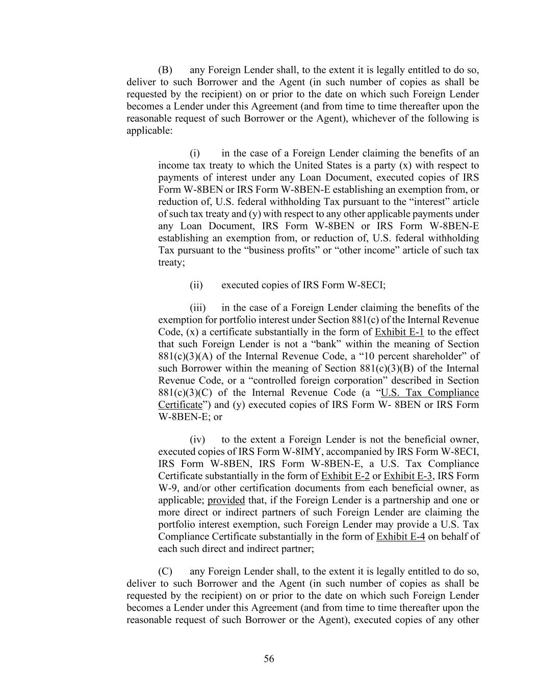 56 (B) any Foreign Lender shall, to the extent it is legally entitled to do so, deliver to such Borrower and the Agent (in such number of copies as shall be requested by the recipient) on or prior to the date on which such Foreign Lender becomes a Lender under this Agreement (and from time to time thereafter upon the reasonable request of such Borrower or the Agent), whichever of the following is applicable: (i) in the case of a Foreign Lender claiming the benefits of an income tax treaty to which the United States is a party (x) with respect to payments of interest under any Loan Document, executed copies of IRS Form W-8BEN or IRS Form W-8BEN-E establishing an exemption from, or reduction of, U.S. federal withholding Tax pursuant to the “interest” article of such tax treaty and (y) with respect to any other applicable payments under any Loan Document, IRS Form W-8BEN or IRS Form W-8BEN-E establishing an exemption from, or reduction of, U.S. federal withholding Tax pursuant to the “business profits” or “other income” article of such tax treaty; (ii) executed copies of IRS Form W-8ECI; (iii) in the case of a Foreign Lender claiming the benefits of the exemption for portfolio interest under Section 881(c) of the Internal Revenue Code, (x) a certificate substantially in the form of Exhibit E-1 to the effect that such Foreign Lender is not a “bank” within the meaning of Section 881(c)(3)(A) of the Internal Revenue Code, a “10 percent shareholder” of such Borrower within the meaning of Section 881(c)(3)(B) of the Internal Revenue Code, or a “controlled foreign corporation” described in Section 881(c)(3)(C) of the Internal Revenue Code (a “U.S. Tax Compliance Certificate”) and (y) executed copies of IRS Form W- 8BEN or IRS Form W-8BEN-E; or (iv) to the extent a Foreign Lender is not the beneficial owner, executed copies of IRS Form W-8IMY, accompanied by IRS Form W-8ECI, IRS Form W-8BEN, IRS Form W-8BEN-E, a U.S. Tax Compliance Certificate substantially in the form of Exhibit E-2 or Exhibit E-3, IRS Form W-9, and/or other certification documents from each beneficial owner, as applicable; provided that, if the Foreign Lender is a partnership and one or more direct or indirect partners of such Foreign Lender are claiming the portfolio interest exemption, such Foreign Lender may provide a U.S. Tax Compliance Certificate substantially in the form of Exhibit E-4 on behalf of each such direct and indirect partner; (C) any Foreign Lender shall, to the extent it is legally entitled to do so, deliver to such Borrower and the Agent (in such number of copies as shall be requested by the recipient) on or prior to the date on which such Foreign Lender becomes a Lender under this Agreement (and from time to time thereafter upon the reasonable request of such Borrower or the Agent), executed copies of any other