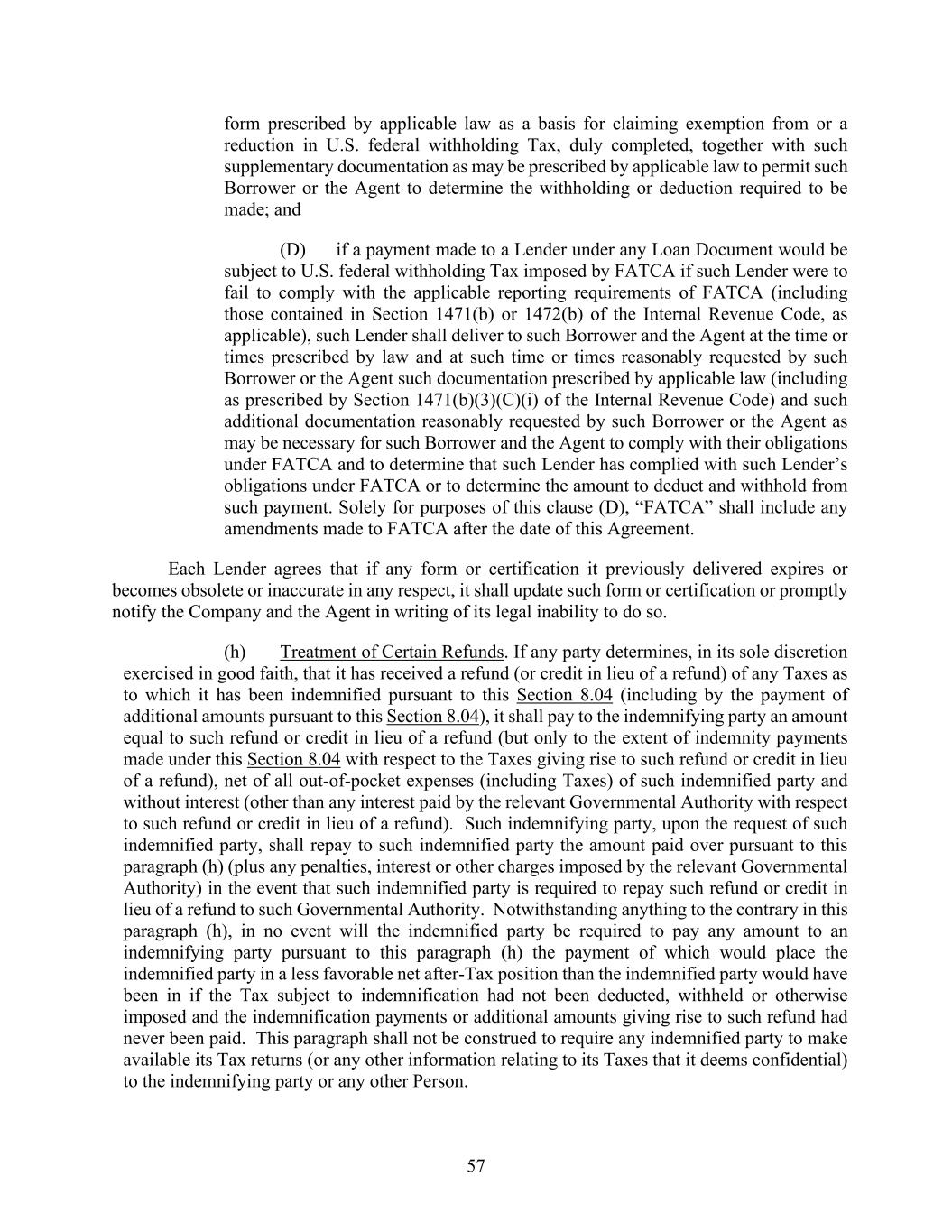57 form prescribed by applicable law as a basis for claiming exemption from or a reduction in U.S. federal withholding Tax, duly completed, together with such supplementary documentation as may be prescribed by applicable law to permit such Borrower or the Agent to determine the withholding or deduction required to be made; and (D) if a payment made to a Lender under any Loan Document would be subject to U.S. federal withholding Tax imposed by FATCA if such Lender were to fail to comply with the applicable reporting requirements of FATCA (including those contained in Section 1471(b) or 1472(b) of the Internal Revenue Code, as applicable), such Lender shall deliver to such Borrower and the Agent at the time or times prescribed by law and at such time or times reasonably requested by such Borrower or the Agent such documentation prescribed by applicable law (including as prescribed by Section 1471(b)(3)(C)(i) of the Internal Revenue Code) and such additional documentation reasonably requested by such Borrower or the Agent as may be necessary for such Borrower and the Agent to comply with their obligations under FATCA and to determine that such Lender has complied with such Lender’s obligations under FATCA or to determine the amount to deduct and withhold from such payment. Solely for purposes of this clause (D), “FATCA” shall include any amendments made to FATCA after the date of this Agreement. Each Lender agrees that if any form or certification it previously delivered expires or becomes obsolete or inaccurate in any respect, it shall update such form or certification or promptly notify the Company and the Agent in writing of its legal inability to do so. (h) Treatment of Certain Refunds. If any party determines, in its sole discretion exercised in good faith, that it has received a refund (or credit in lieu of a refund) of any Taxes as to which it has been indemnified pursuant to this Section 8.04 (including by the payment of additional amounts pursuant to this Section 8.04), it shall pay to the indemnifying party an amount equal to such refund or credit in lieu of a refund (but only to the extent of indemnity payments made under this Section 8.04 with respect to the Taxes giving rise to such refund or credit in lieu of a refund), net of all out-of-pocket expenses (including Taxes) of such indemnified party and without interest (other than any interest paid by the relevant Governmental Authority with respect to such refund or credit in lieu of a refund). Such indemnifying party, upon the request of such indemnified party, shall repay to such indemnified party the amount paid over pursuant to this paragraph (h) (plus any penalties, interest or other charges imposed by the relevant Governmental Authority) in the event that such indemnified party is required to repay such refund or credit in lieu of a refund to such Governmental Authority. Notwithstanding anything to the contrary in this paragraph (h), in no event will the indemnified party be required to pay any amount to an indemnifying party pursuant to this paragraph (h) the payment of which would place the indemnified party in a less favorable net after-Tax position than the indemnified party would have been in if the Tax subject to indemnification had not been deducted, withheld or otherwise imposed and the indemnification payments or additional amounts giving rise to such refund had never been paid. This paragraph shall not be construed to require any indemnified party to make available its Tax returns (or any other information relating to its Taxes that it deems confidential) to the indemnifying party or any other Person.
