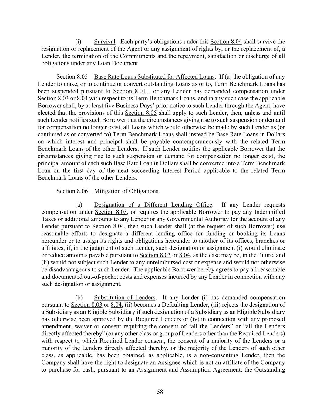 58 (i) Survival. Each party’s obligations under this Section 8.04 shall survive the resignation or replacement of the Agent or any assignment of rights by, or the replacement of, a Lender, the termination of the Commitments and the repayment, satisfaction or discharge of all obligations under any Loan Document Section 8.05 Base Rate Loans Substituted for Affected Loans. If (a) the obligation of any Lender to make, or to continue or convert outstanding Loans as or to, Term Benchmark Loans has been suspended pursuant to Section 8.01.1 or any Lender has demanded compensation under Section 8.03 or 8.04 with respect to its Term Benchmark Loans, and in any such case the applicable Borrower shall, by at least five Business Days’ prior notice to such Lender through the Agent, have elected that the provisions of this Section 8.05 shall apply to such Lender, then, unless and until such Lender notifies such Borrower that the circumstances giving rise to such suspension or demand for compensation no longer exist, all Loans which would otherwise be made by such Lender as (or continued as or converted to) Term Benchmark Loans shall instead be Base Rate Loans in Dollars on which interest and principal shall be payable contemporaneously with the related Term Benchmark Loans of the other Lenders. If such Lender notifies the applicable Borrower that the circumstances giving rise to such suspension or demand for compensation no longer exist, the principal amount of each such Base Rate Loan in Dollars shall be converted into a Term Benchmark Loan on the first day of the next succeeding Interest Period applicable to the related Term Benchmark Loans of the other Lenders. Section 8.06 Mitigation of Obligations. (a) Designation of a Different Lending Office. If any Lender requests compensation under Section 8.03, or requires the applicable Borrower to pay any Indemnified Taxes or additional amounts to any Lender or any Governmental Authority for the account of any Lender pursuant to Section 8.04, then such Lender shall (at the request of such Borrower) use reasonable efforts to designate a different lending office for funding or booking its Loans hereunder or to assign its rights and obligations hereunder to another of its offices, branches or affiliates, if, in the judgment of such Lender, such designation or assignment (i) would eliminate or reduce amounts payable pursuant to Section 8.03 or 8.04, as the case may be, in the future, and (ii) would not subject such Lender to any unreimbursed cost or expense and would not otherwise be disadvantageous to such Lender. The applicable Borrower hereby agrees to pay all reasonable and documented out-of-pocket costs and expenses incurred by any Lender in connection with any such designation or assignment. (b) Substitution of Lenders. If any Lender (i) has demanded compensation pursuant to Section 8.03 or 8.04, (ii) becomes a Defaulting Lender, (iii) rejects the designation of a Subsidiary as an Eligible Subsidiary if such designation of a Subsidiary as an Eligible Subsidiary has otherwise been approved by the Required Lenders or (iv) in connection with any proposed amendment, waiver or consent requiring the consent of “all the Lenders” or “all the Lenders directly affected thereby” (or any other class or group of Lenders other than the Required Lenders) with respect to which Required Lender consent, the consent of a majority of the Lenders or a majority of the Lenders directly affected thereby, or the majority of the Lenders of such other class, as applicable, has been obtained, as applicable, is a non-consenting Lender, then the Company shall have the right to designate an Assignee which is not an affiliate of the Company to purchase for cash, pursuant to an Assignment and Assumption Agreement, the Outstanding