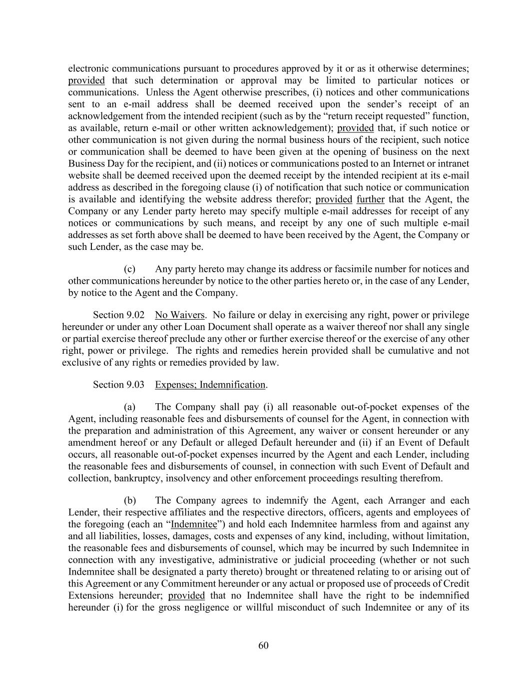 60 electronic communications pursuant to procedures approved by it or as it otherwise determines; provided that such determination or approval may be limited to particular notices or communications. Unless the Agent otherwise prescribes, (i) notices and other communications sent to an e-mail address shall be deemed received upon the sender’s receipt of an acknowledgement from the intended recipient (such as by the “return receipt requested” function, as available, return e-mail or other written acknowledgement); provided that, if such notice or other communication is not given during the normal business hours of the recipient, such notice or communication shall be deemed to have been given at the opening of business on the next Business Day for the recipient, and (ii) notices or communications posted to an Internet or intranet website shall be deemed received upon the deemed receipt by the intended recipient at its e-mail address as described in the foregoing clause (i) of notification that such notice or communication is available and identifying the website address therefor; provided further that the Agent, the Company or any Lender party hereto may specify multiple e-mail addresses for receipt of any notices or communications by such means, and receipt by any one of such multiple e-mail addresses as set forth above shall be deemed to have been received by the Agent, the Company or such Lender, as the case may be. (c) Any party hereto may change its address or facsimile number for notices and other communications hereunder by notice to the other parties hereto or, in the case of any Lender, by notice to the Agent and the Company. Section 9.02 No Waivers. No failure or delay in exercising any right, power or privilege hereunder or under any other Loan Document shall operate as a waiver thereof nor shall any single or partial exercise thereof preclude any other or further exercise thereof or the exercise of any other right, power or privilege. The rights and remedies herein provided shall be cumulative and not exclusive of any rights or remedies provided by law. Section 9.03 Expenses; Indemnification. (a) The Company shall pay (i) all reasonable out-of-pocket expenses of the Agent, including reasonable fees and disbursements of counsel for the Agent, in connection with the preparation and administration of this Agreement, any waiver or consent hereunder or any amendment hereof or any Default or alleged Default hereunder and (ii) if an Event of Default occurs, all reasonable out-of-pocket expenses incurred by the Agent and each Lender, including the reasonable fees and disbursements of counsel, in connection with such Event of Default and collection, bankruptcy, insolvency and other enforcement proceedings resulting therefrom. (b) The Company agrees to indemnify the Agent, each Arranger and each Lender, their respective affiliates and the respective directors, officers, agents and employees of the foregoing (each an “Indemnitee”) and hold each Indemnitee harmless from and against any and all liabilities, losses, damages, costs and expenses of any kind, including, without limitation, the reasonable fees and disbursements of counsel, which may be incurred by such Indemnitee in connection with any investigative, administrative or judicial proceeding (whether or not such Indemnitee shall be designated a party thereto) brought or threatened relating to or arising out of this Agreement or any Commitment hereunder or any actual or proposed use of proceeds of Credit Extensions hereunder; provided that no Indemnitee shall have the right to be indemnified hereunder (i) for the gross negligence or willful misconduct of such Indemnitee or any of its