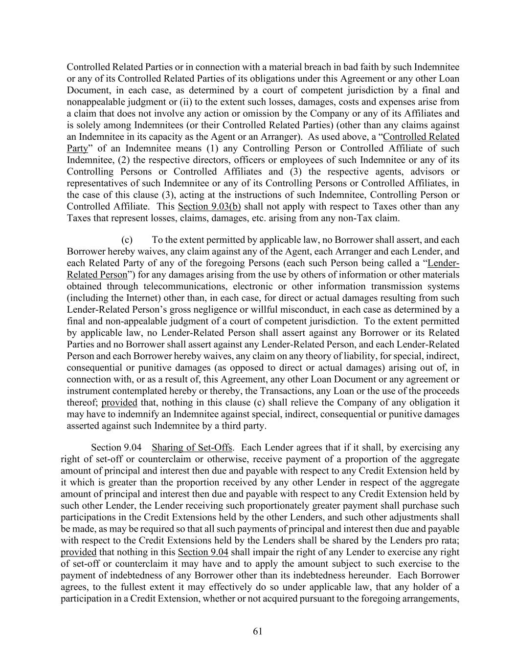 61 Controlled Related Parties or in connection with a material breach in bad faith by such Indemnitee or any of its Controlled Related Parties of its obligations under this Agreement or any other Loan Document, in each case, as determined by a court of competent jurisdiction by a final and nonappealable judgment or (ii) to the extent such losses, damages, costs and expenses arise from a claim that does not involve any action or omission by the Company or any of its Affiliates and is solely among Indemnitees (or their Controlled Related Parties) (other than any claims against an Indemnitee in its capacity as the Agent or an Arranger). As used above, a “Controlled Related Party” of an Indemnitee means (1) any Controlling Person or Controlled Affiliate of such Indemnitee, (2) the respective directors, officers or employees of such Indemnitee or any of its Controlling Persons or Controlled Affiliates and (3) the respective agents, advisors or representatives of such Indemnitee or any of its Controlling Persons or Controlled Affiliates, in the case of this clause (3), acting at the instructions of such Indemnitee, Controlling Person or Controlled Affiliate. This Section 9.03(b) shall not apply with respect to Taxes other than any Taxes that represent losses, claims, damages, etc. arising from any non-Tax claim. (c) To the extent permitted by applicable law, no Borrower shall assert, and each Borrower hereby waives, any claim against any of the Agent, each Arranger and each Lender, and each Related Party of any of the foregoing Persons (each such Person being called a “Lender- Related Person”) for any damages arising from the use by others of information or other materials obtained through telecommunications, electronic or other information transmission systems (including the Internet) other than, in each case, for direct or actual damages resulting from such Lender-Related Person’s gross negligence or willful misconduct, in each case as determined by a final and non-appealable judgment of a court of competent jurisdiction. To the extent permitted by applicable law, no Lender-Related Person shall assert against any Borrower or its Related Parties and no Borrower shall assert against any Lender-Related Person, and each Lender-Related Person and each Borrower hereby waives, any claim on any theory of liability, for special, indirect, consequential or punitive damages (as opposed to direct or actual damages) arising out of, in connection with, or as a result of, this Agreement, any other Loan Document or any agreement or instrument contemplated hereby or thereby, the Transactions, any Loan or the use of the proceeds thereof; provided that, nothing in this clause (c) shall relieve the Company of any obligation it may have to indemnify an Indemnitee against special, indirect, consequential or punitive damages asserted against such Indemnitee by a third party. Section 9.04 Sharing of Set-Offs. Each Lender agrees that if it shall, by exercising any right of set-off or counterclaim or otherwise, receive payment of a proportion of the aggregate amount of principal and interest then due and payable with respect to any Credit Extension held by it which is greater than the proportion received by any other Lender in respect of the aggregate amount of principal and interest then due and payable with respect to any Credit Extension held by such other Lender, the Lender receiving such proportionately greater payment shall purchase such participations in the Credit Extensions held by the other Lenders, and such other adjustments shall be made, as may be required so that all such payments of principal and interest then due and payable with respect to the Credit Extensions held by the Lenders shall be shared by the Lenders pro rata; provided that nothing in this Section 9.04 shall impair the right of any Lender to exercise any right of set-off or counterclaim it may have and to apply the amount subject to such exercise to the payment of indebtedness of any Borrower other than its indebtedness hereunder. Each Borrower agrees, to the fullest extent it may effectively do so under applicable law, that any holder of a participation in a Credit Extension, whether or not acquired pursuant to the foregoing arrangements,