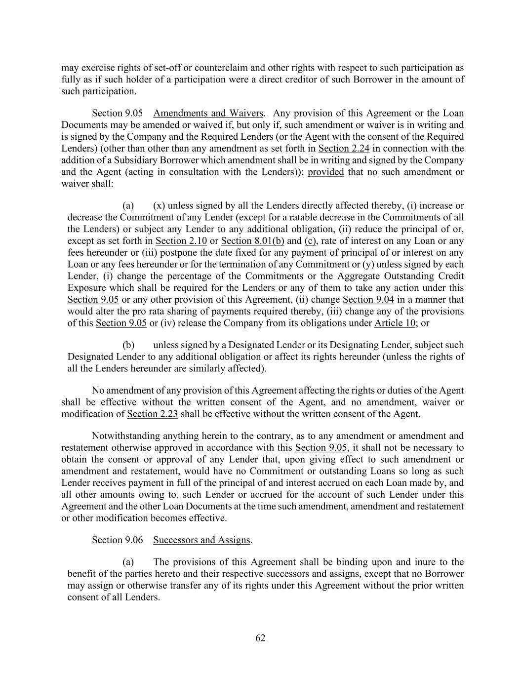 62 may exercise rights of set-off or counterclaim and other rights with respect to such participation as fully as if such holder of a participation were a direct creditor of such Borrower in the amount of such participation. Section 9.05 Amendments and Waivers. Any provision of this Agreement or the Loan Documents may be amended or waived if, but only if, such amendment or waiver is in writing and is signed by the Company and the Required Lenders (or the Agent with the consent of the Required Lenders) (other than other than any amendment as set forth in Section 2.24 in connection with the addition of a Subsidiary Borrower which amendment shall be in writing and signed by the Company and the Agent (acting in consultation with the Lenders)); provided that no such amendment or waiver shall: (a) (x) unless signed by all the Lenders directly affected thereby, (i) increase or decrease the Commitment of any Lender (except for a ratable decrease in the Commitments of all the Lenders) or subject any Lender to any additional obligation, (ii) reduce the principal of or, except as set forth in Section 2.10 or Section 8.01(b) and (c), rate of interest on any Loan or any fees hereunder or (iii) postpone the date fixed for any payment of principal of or interest on any Loan or any fees hereunder or for the termination of any Commitment or (y) unless signed by each Lender, (i) change the percentage of the Commitments or the Aggregate Outstanding Credit Exposure which shall be required for the Lenders or any of them to take any action under this Section 9.05 or any other provision of this Agreement, (ii) change Section 9.04 in a manner that would alter the pro rata sharing of payments required thereby, (iii) change any of the provisions of this Section 9.05 or (iv) release the Company from its obligations under Article 10; or (b) unless signed by a Designated Lender or its Designating Lender, subject such Designated Lender to any additional obligation or affect its rights hereunder (unless the rights of all the Lenders hereunder are similarly affected). No amendment of any provision of this Agreement affecting the rights or duties of the Agent shall be effective without the written consent of the Agent, and no amendment, waiver or modification of Section 2.23 shall be effective without the written consent of the Agent. Notwithstanding anything herein to the contrary, as to any amendment or amendment and restatement otherwise approved in accordance with this Section 9.05, it shall not be necessary to obtain the consent or approval of any Lender that, upon giving effect to such amendment or amendment and restatement, would have no Commitment or outstanding Loans so long as such Lender receives payment in full of the principal of and interest accrued on each Loan made by, and all other amounts owing to, such Lender or accrued for the account of such Lender under this Agreement and the other Loan Documents at the time such amendment, amendment and restatement or other modification becomes effective. Section 9.06 Successors and Assigns. (a) The provisions of this Agreement shall be binding upon and inure to the benefit of the parties hereto and their respective successors and assigns, except that no Borrower may assign or otherwise transfer any of its rights under this Agreement without the prior written consent of all Lenders.