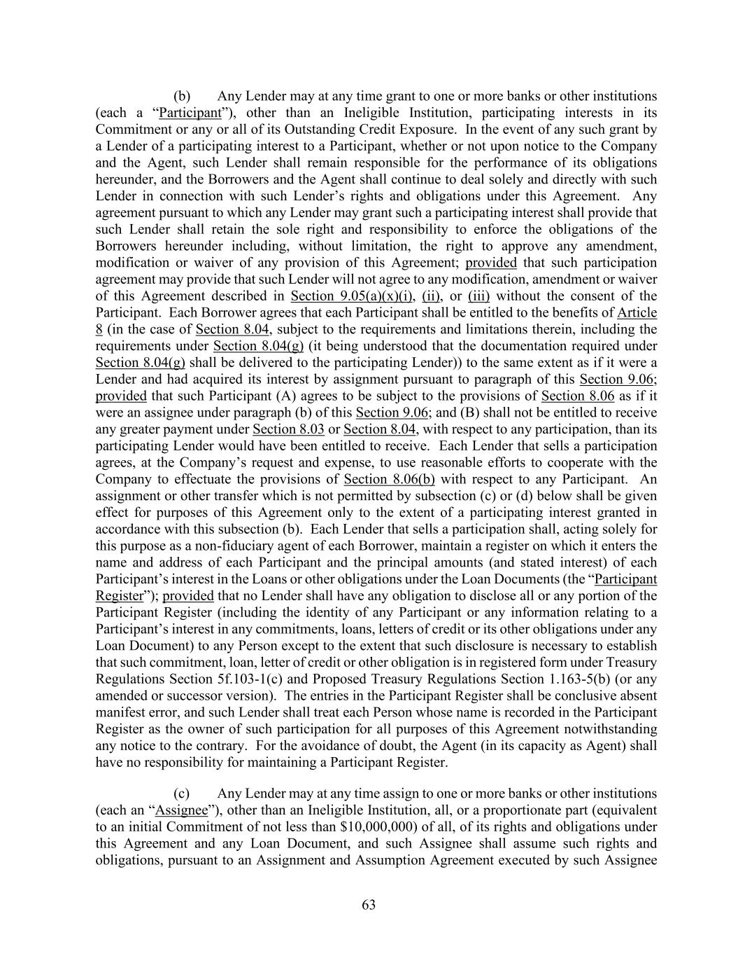 63 (b) Any Lender may at any time grant to one or more banks or other institutions (each a “Participant”), other than an Ineligible Institution, participating interests in its Commitment or any or all of its Outstanding Credit Exposure. In the event of any such grant by a Lender of a participating interest to a Participant, whether or not upon notice to the Company and the Agent, such Lender shall remain responsible for the performance of its obligations hereunder, and the Borrowers and the Agent shall continue to deal solely and directly with such Lender in connection with such Lender’s rights and obligations under this Agreement. Any agreement pursuant to which any Lender may grant such a participating interest shall provide that such Lender shall retain the sole right and responsibility to enforce the obligations of the Borrowers hereunder including, without limitation, the right to approve any amendment, modification or waiver of any provision of this Agreement; provided that such participation agreement may provide that such Lender will not agree to any modification, amendment or waiver of this Agreement described in Section 9.05(a)(x)(i), (ii), or (iii) without the consent of the Participant. Each Borrower agrees that each Participant shall be entitled to the benefits of Article 8 (in the case of Section 8.04, subject to the requirements and limitations therein, including the requirements under Section 8.04(g) (it being understood that the documentation required under Section 8.04(g) shall be delivered to the participating Lender)) to the same extent as if it were a Lender and had acquired its interest by assignment pursuant to paragraph of this Section 9.06; provided that such Participant (A) agrees to be subject to the provisions of Section 8.06 as if it were an assignee under paragraph (b) of this Section 9.06; and (B) shall not be entitled to receive any greater payment under Section 8.03 or Section 8.04, with respect to any participation, than its participating Lender would have been entitled to receive. Each Lender that sells a participation agrees, at the Company’s request and expense, to use reasonable efforts to cooperate with the Company to effectuate the provisions of Section 8.06(b) with respect to any Participant. An assignment or other transfer which is not permitted by subsection (c) or (d) below shall be given effect for purposes of this Agreement only to the extent of a participating interest granted in accordance with this subsection (b). Each Lender that sells a participation shall, acting solely for this purpose as a non-fiduciary agent of each Borrower, maintain a register on which it enters the name and address of each Participant and the principal amounts (and stated interest) of each Participant’s interest in the Loans or other obligations under the Loan Documents (the “Participant Register”); provided that no Lender shall have any obligation to disclose all or any portion of the Participant Register (including the identity of any Participant or any information relating to a Participant’s interest in any commitments, loans, letters of credit or its other obligations under any Loan Document) to any Person except to the extent that such disclosure is necessary to establish that such commitment, loan, letter of credit or other obligation is in registered form under Treasury Regulations Section 5f.103-1(c) and Proposed Treasury Regulations Section 1.163-5(b) (or any amended or successor version). The entries in the Participant Register shall be conclusive absent manifest error, and such Lender shall treat each Person whose name is recorded in the Participant Register as the owner of such participation for all purposes of this Agreement notwithstanding any notice to the contrary. For the avoidance of doubt, the Agent (in its capacity as Agent) shall have no responsibility for maintaining a Participant Register. (c) Any Lender may at any time assign to one or more banks or other institutions (each an “Assignee”), other than an Ineligible Institution, all, or a proportionate part (equivalent to an initial Commitment of not less than $10,000,000) of all, of its rights and obligations under this Agreement and any Loan Document, and such Assignee shall assume such rights and obligations, pursuant to an Assignment and Assumption Agreement executed by such Assignee