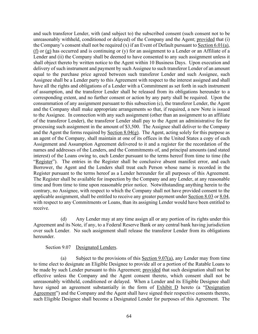 64 and such transferor Lender, with (and subject to) the subscribed consent (such consent not to be unreasonably withheld, conditioned or delayed) of the Company and the Agent; provided that (i) the Company’s consent shall not be required (x) if an Event of Default pursuant to Section 6.01(a), (f) or (g) has occurred and is continuing or (y) for an assignment to a Lender or an Affiliate of a Lender and (ii) the Company shall be deemed to have consented to any such assignment unless it shall object thereto by written notice to the Agent within 10 Business Days. Upon execution and delivery of such instrument and payment by such Assignee to such transferor Lender of an amount equal to the purchase price agreed between such transferor Lender and such Assignee, such Assignee shall be a Lender party to this Agreement with respect to the interest assigned and shall have all the rights and obligations of a Lender with a Commitment as set forth in such instrument of assumption, and the transferor Lender shall be released from its obligations hereunder to a corresponding extent, and no further consent or action by any party shall be required. Upon the consummation of any assignment pursuant to this subsection (c), the transferor Lender, the Agent and the Company shall make appropriate arrangements so that, if required, a new Note is issued to the Assignee. In connection with any such assignment (other than an assignment to an affiliate of the transferor Lender), the transferor Lender shall pay to the Agent an administrative fee for processing such assignment in the amount of $3,500. The Assignee shall deliver to the Company and the Agent the forms required by Section 8.04(g). The Agent, acting solely for this purpose as an agent of the Company, shall maintain at one of its offices in the United States a copy of each Assignment and Assumption Agreement delivered to it and a register for the recordation of the names and addresses of the Lenders, and the Commitments of, and principal amounts (and stated interest) of the Loans owing to, each Lender pursuant to the terms hereof from time to time (the “Register”). The entries in the Register shall be conclusive absent manifest error, and each Borrower, the Agent and the Lenders shall treat each Person whose name is recorded in the Register pursuant to the terms hereof as a Lender hereunder for all purposes of this Agreement. The Register shall be available for inspection by the Company and any Lender, at any reasonable time and from time to time upon reasonable prior notice. Notwithstanding anything herein to the contrary, no Assignee, with respect to which the Company shall not have provided consent to the applicable assignment, shall be entitled to receive any greater payment under Section 8.03 or 8.04, with respect to any Commitments or Loans, than its assigning Lender would have been entitled to receive. (d) Any Lender may at any time assign all or any portion of its rights under this Agreement and its Note, if any, to a Federal Reserve Bank or any central bank having jurisdiction over such Lender. No such assignment shall release the transferor Lender from its obligations hereunder. Section 9.07 Designated Lenders. (a) Subject to the provisions of this Section 9.07(a), any Lender may from time to time elect to designate an Eligible Designee to provide all or a portion of the Ratable Loans to be made by such Lender pursuant to this Agreement; provided that such designation shall not be effective unless the Company and the Agent consent thereto, which consent shall not be unreasonably withheld, conditioned or delayed. When a Lender and its Eligible Designee shall have signed an agreement substantially in the form of Exhibit D hereto (a “Designation Agreement”) and the Company and the Agent shall have signed their respective consents thereto, such Eligible Designee shall become a Designated Lender for purposes of this Agreement. The