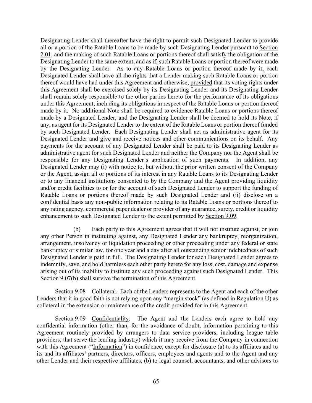 65 Designating Lender shall thereafter have the right to permit such Designated Lender to provide all or a portion of the Ratable Loans to be made by such Designating Lender pursuant to Section 2.01, and the making of such Ratable Loans or portions thereof shall satisfy the obligation of the Designating Lender to the same extent, and as if, such Ratable Loans or portion thereof were made by the Designating Lender. As to any Ratable Loans or portion thereof made by it, each Designated Lender shall have all the rights that a Lender making such Ratable Loans or portion thereof would have had under this Agreement and otherwise; provided that its voting rights under this Agreement shall be exercised solely by its Designating Lender and its Designating Lender shall remain solely responsible to the other parties hereto for the performance of its obligations under this Agreement, including its obligations in respect of the Ratable Loans or portion thereof made by it. No additional Note shall be required to evidence Ratable Loans or portions thereof made by a Designated Lender; and the Designating Lender shall be deemed to hold its Note, if any, as agent for its Designated Lender to the extent of the Ratable Loans or portion thereof funded by such Designated Lender. Each Designating Lender shall act as administrative agent for its Designated Lender and give and receive notices and other communications on its behalf. Any payments for the account of any Designated Lender shall be paid to its Designating Lender as administrative agent for such Designated Lender and neither the Company nor the Agent shall be responsible for any Designating Lender’s application of such payments. In addition, any Designated Lender may (i) with notice to, but without the prior written consent of the Company or the Agent, assign all or portions of its interest in any Ratable Loans to its Designating Lender or to any financial institutions consented to by the Company and the Agent providing liquidity and/or credit facilities to or for the account of such Designated Lender to support the funding of Ratable Loans or portions thereof made by such Designated Lender and (ii) disclose on a confidential basis any non-public information relating to its Ratable Loans or portions thereof to any rating agency, commercial paper dealer or provider of any guarantee, surety, credit or liquidity enhancement to such Designated Lender to the extent permitted by Section 9.09. (b) Each party to this Agreement agrees that it will not institute against, or join any other Person in instituting against, any Designated Lender any bankruptcy, reorganization, arrangement, insolvency or liquidation proceeding or other proceeding under any federal or state bankruptcy or similar law, for one year and a day after all outstanding senior indebtedness of such Designated Lender is paid in full. The Designating Lender for each Designated Lender agrees to indemnify, save, and hold harmless each other party hereto for any loss, cost, damage and expense arising out of its inability to institute any such proceeding against such Designated Lender. This Section 9.07(b) shall survive the termination of this Agreement. Section 9.08 Collateral. Each of the Lenders represents to the Agent and each of the other Lenders that it in good faith is not relying upon any “margin stock” (as defined in Regulation U) as collateral in the extension or maintenance of the credit provided for in this Agreement. Section 9.09 Confidentiality. The Agent and the Lenders each agree to hold any confidential information (other than, for the avoidance of doubt, information pertaining to this Agreement routinely provided by arrangers to data service providers, including league table providers, that serve the lending industry) which it may receive from the Company in connection with this Agreement (“Information”) in confidence, except for disclosure (a) to its affiliates and to its and its affiliates’ partners, directors, officers, employees and agents and to the Agent and any other Lender and their respective affiliates, (b) to legal counsel, accountants, and other advisors to