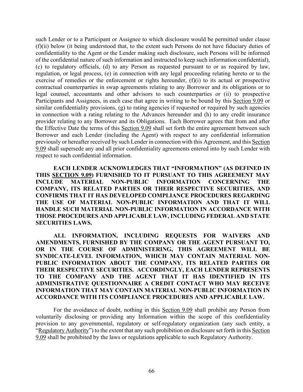 66 such Lender or to a Participant or Assignee to which disclosure would be permitted under clause (f)(ii) below (it being understood that, to the extent such Persons do not have fiduciary duties of confidentiality to the Agent or the Lender making such disclosure, such Persons will be informed of the confidential nature of such information and instructed to keep such information confidential), (c) to regulatory officials, (d) to any Person as requested pursuant to or as required by law, regulation, or legal process, (e) in connection with any legal proceeding relating hereto or to the exercise of remedies or the enforcement or rights hereunder, (f)(i) to its actual or prospective contractual counterparties in swap agreements relating to any Borrower and its obligations or to legal counsel, accountants and other advisors to such counterparties or (ii) to prospective Participants and Assignees, in each case that agree in writing to be bound by this Section 9.09 or similar confidentiality provisions, (g) to rating agencies if requested or required by such agencies in connection with a rating relating to the Advances hereunder and (h) to any credit insurance provider relating to any Borrower and its Obligations. Each Borrower agrees that from and after the Effective Date the terms of this Section 9.09 shall set forth the entire agreement between such Borrower and each Lender (including the Agent) with respect to any confidential information previously or hereafter received by such Lender in connection with this Agreement, and this Section 9.09 shall supersede any and all prior confidentiality agreements entered into by such Lender with respect to such confidential information. EACH LENDER ACKNOWLEDGES THAT “INFORMATION” (AS DEFINED IN THIS SECTION 9.09) FURNISHED TO IT PURSUANT TO THIS AGREEMENT MAY INCLUDE MATERIAL NON-PUBLIC INFORMATION CONCERNING THE COMPANY, ITS RELATED PARTIES OR THEIR RESPECTIVE SECURITIES, AND CONFIRMS THAT IT HAS DEVELOPED COMPLIANCE PROCEDURES REGARDING THE USE OF MATERIAL NON-PUBLIC INFORMATION AND THAT IT WILL HANDLE SUCH MATERIAL NON-PUBLIC INFORMATION IN ACCORDANCE WITH THOSE PROCEDURES AND APPLICABLE LAW, INCLUDING FEDERAL AND STATE SECURITIES LAWS. ALL INFORMATION, INCLUDING REQUESTS FOR WAIVERS AND AMENDMENTS, FURNISHED BY THE COMPANY OR THE AGENT PURSUANT TO, OR IN THE COURSE OF ADMINISTERING, THIS AGREEMENT WILL BE SYNDICATE-LEVEL INFORMATION, WHICH MAY CONTAIN MATERIAL NON- PUBLIC INFORMATION ABOUT THE COMPANY, ITS RELATED PARTIES OR THEIR RESPECTIVE SECURITIES. ACCORDINGLY, EACH LENDER REPRESENTS TO THE COMPANY AND THE AGENT THAT IT HAS IDENTIFIED IN ITS ADMINISTRATIVE QUESTIONNAIRE A CREDIT CONTACT WHO MAY RECEIVE INFORMATION THAT MAY CONTAIN MATERIAL NON-PUBLIC INFORMATION IN ACCORDANCE WITH ITS COMPLIANCE PROCEDURES AND APPLICABLE LAW. For the avoidance of doubt, nothing in this Section 9.09 shall prohibit any Person from voluntarily disclosing or providing any Information within the scope of this confidentiality provision to any governmental, regulatory or self-regulatory organization (any such entity, a “Regulatory Authority”) to the extent that any such prohibition on disclosure set forth in this Section 9.09 shall be prohibited by the laws or regulations applicable to such Regulatory Authority.