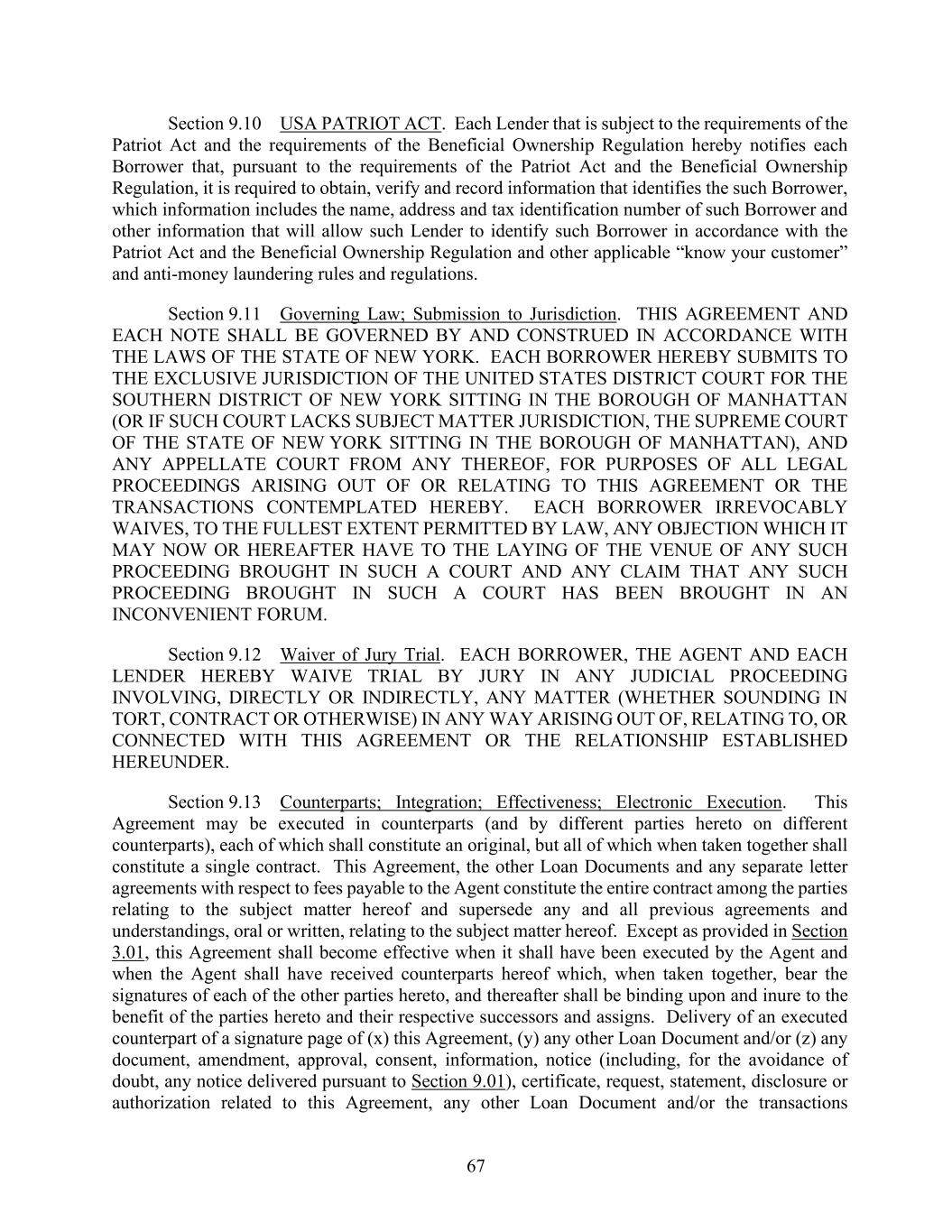 67 Section 9.10 USA PATRIOT ACT. Each Lender that is subject to the requirements of the Patriot Act and the requirements of the Beneficial Ownership Regulation hereby notifies each Borrower that, pursuant to the requirements of the Patriot Act and the Beneficial Ownership Regulation, it is required to obtain, verify and record information that identifies the such Borrower, which information includes the name, address and tax identification number of such Borrower and other information that will allow such Lender to identify such Borrower in accordance with the Patriot Act and the Beneficial Ownership Regulation and other applicable “know your customer” and anti-money laundering rules and regulations. Section 9.11 Governing Law; Submission to Jurisdiction. THIS AGREEMENT AND EACH NOTE SHALL BE GOVERNED BY AND CONSTRUED IN ACCORDANCE WITH THE LAWS OF THE STATE OF NEW YORK. EACH BORROWER HEREBY SUBMITS TO THE EXCLUSIVE JURISDICTION OF THE UNITED STATES DISTRICT COURT FOR THE SOUTHERN DISTRICT OF NEW YORK SITTING IN THE BOROUGH OF MANHATTAN (OR IF SUCH COURT LACKS SUBJECT MATTER JURISDICTION, THE SUPREME COURT OF THE STATE OF NEW YORK SITTING IN THE BOROUGH OF MANHATTAN), AND ANY APPELLATE COURT FROM ANY THEREOF, FOR PURPOSES OF ALL LEGAL PROCEEDINGS ARISING OUT OF OR RELATING TO THIS AGREEMENT OR THE TRANSACTIONS CONTEMPLATED HEREBY. EACH BORROWER IRREVOCABLY WAIVES, TO THE FULLEST EXTENT PERMITTED BY LAW, ANY OBJECTION WHICH IT MAY NOW OR HEREAFTER HAVE TO THE LAYING OF THE VENUE OF ANY SUCH PROCEEDING BROUGHT IN SUCH A COURT AND ANY CLAIM THAT ANY SUCH PROCEEDING BROUGHT IN SUCH A COURT HAS BEEN BROUGHT IN AN INCONVENIENT FORUM. Section 9.12 Waiver of Jury Trial. EACH BORROWER, THE AGENT AND EACH LENDER HEREBY WAIVE TRIAL BY JURY IN ANY JUDICIAL PROCEEDING INVOLVING, DIRECTLY OR INDIRECTLY, ANY MATTER (WHETHER SOUNDING IN TORT, CONTRACT OR OTHERWISE) IN ANY WAY ARISING OUT OF, RELATING TO, OR CONNECTED WITH THIS AGREEMENT OR THE RELATIONSHIP ESTABLISHED HEREUNDER. Section 9.13 Counterparts; Integration; Effectiveness; Electronic Execution. This Agreement may be executed in counterparts (and by different parties hereto on different counterparts), each of which shall constitute an original, but all of which when taken together shall constitute a single contract. This Agreement, the other Loan Documents and any separate letter agreements with respect to fees payable to the Agent constitute the entire contract among the parties relating to the subject matter hereof and supersede any and all previous agreements and understandings, oral or written, relating to the subject matter hereof. Except as provided in Section 3.01, this Agreement shall become effective when it shall have been executed by the Agent and when the Agent shall have received counterparts hereof which, when taken together, bear the signatures of each of the other parties hereto, and thereafter shall be binding upon and inure to the benefit of the parties hereto and their respective successors and assigns. Delivery of an executed counterpart of a signature page of (x) this Agreement, (y) any other Loan Document and/or (z) any document, amendment, approval, consent, information, notice (including, for the avoidance of doubt, any notice delivered pursuant to Section 9.01), certificate, request, statement, disclosure or authorization related to this Agreement, any other Loan Document and/or the transactions