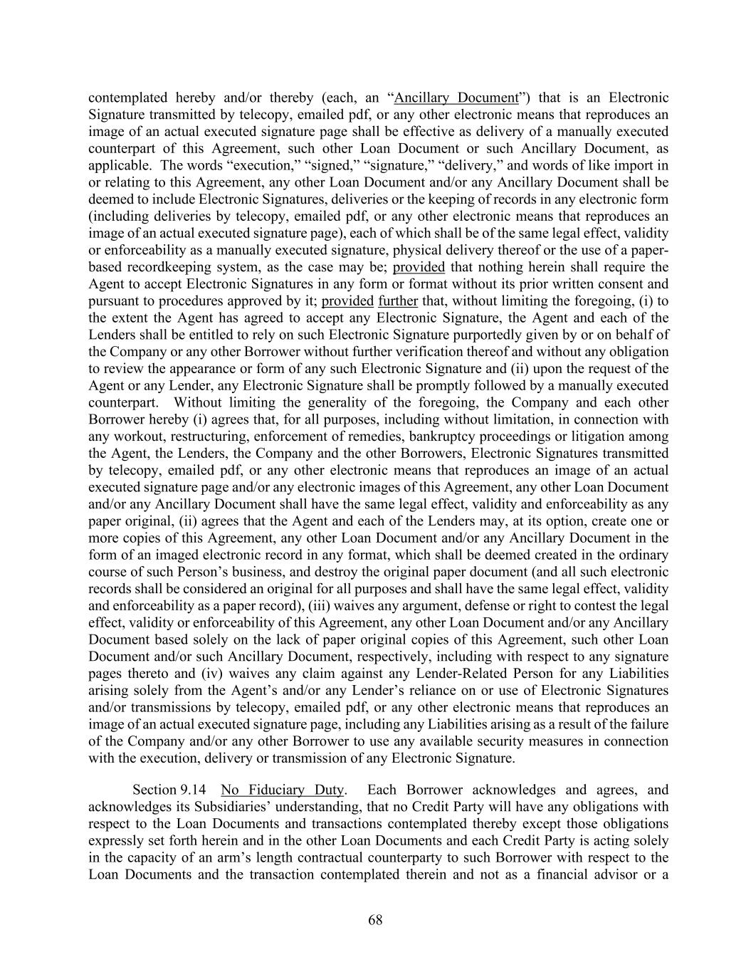 68 contemplated hereby and/or thereby (each, an “Ancillary Document”) that is an Electronic Signature transmitted by telecopy, emailed pdf, or any other electronic means that reproduces an image of an actual executed signature page shall be effective as delivery of a manually executed counterpart of this Agreement, such other Loan Document or such Ancillary Document, as applicable. The words “execution,” “signed,” “signature,” “delivery,” and words of like import in or relating to this Agreement, any other Loan Document and/or any Ancillary Document shall be deemed to include Electronic Signatures, deliveries or the keeping of records in any electronic form (including deliveries by telecopy, emailed pdf, or any other electronic means that reproduces an image of an actual executed signature page), each of which shall be of the same legal effect, validity or enforceability as a manually executed signature, physical delivery thereof or the use of a paper- based recordkeeping system, as the case may be; provided that nothing herein shall require the Agent to accept Electronic Signatures in any form or format without its prior written consent and pursuant to procedures approved by it; provided further that, without limiting the foregoing, (i) to the extent the Agent has agreed to accept any Electronic Signature, the Agent and each of the Lenders shall be entitled to rely on such Electronic Signature purportedly given by or on behalf of the Company or any other Borrower without further verification thereof and without any obligation to review the appearance or form of any such Electronic Signature and (ii) upon the request of the Agent or any Lender, any Electronic Signature shall be promptly followed by a manually executed counterpart. Without limiting the generality of the foregoing, the Company and each other Borrower hereby (i) agrees that, for all purposes, including without limitation, in connection with any workout, restructuring, enforcement of remedies, bankruptcy proceedings or litigation among the Agent, the Lenders, the Company and the other Borrowers, Electronic Signatures transmitted by telecopy, emailed pdf, or any other electronic means that reproduces an image of an actual executed signature page and/or any electronic images of this Agreement, any other Loan Document and/or any Ancillary Document shall have the same legal effect, validity and enforceability as any paper original, (ii) agrees that the Agent and each of the Lenders may, at its option, create one or more copies of this Agreement, any other Loan Document and/or any Ancillary Document in the form of an imaged electronic record in any format, which shall be deemed created in the ordinary course of such Person’s business, and destroy the original paper document (and all such electronic records shall be considered an original for all purposes and shall have the same legal effect, validity and enforceability as a paper record), (iii) waives any argument, defense or right to contest the legal effect, validity or enforceability of this Agreement, any other Loan Document and/or any Ancillary Document based solely on the lack of paper original copies of this Agreement, such other Loan Document and/or such Ancillary Document, respectively, including with respect to any signature pages thereto and (iv) waives any claim against any Lender-Related Person for any Liabilities arising solely from the Agent’s and/or any Lender’s reliance on or use of Electronic Signatures and/or transmissions by telecopy, emailed pdf, or any other electronic means that reproduces an image of an actual executed signature page, including any Liabilities arising as a result of the failure of the Company and/or any other Borrower to use any available security measures in connection with the execution, delivery or transmission of any Electronic Signature. Section 9.14 No Fiduciary Duty. Each Borrower acknowledges and agrees, and acknowledges its Subsidiaries’ understanding, that no Credit Party will have any obligations with respect to the Loan Documents and transactions contemplated thereby except those obligations expressly set forth herein and in the other Loan Documents and each Credit Party is acting solely in the capacity of an arm’s length contractual counterparty to such Borrower with respect to the Loan Documents and the transaction contemplated therein and not as a financial advisor or a