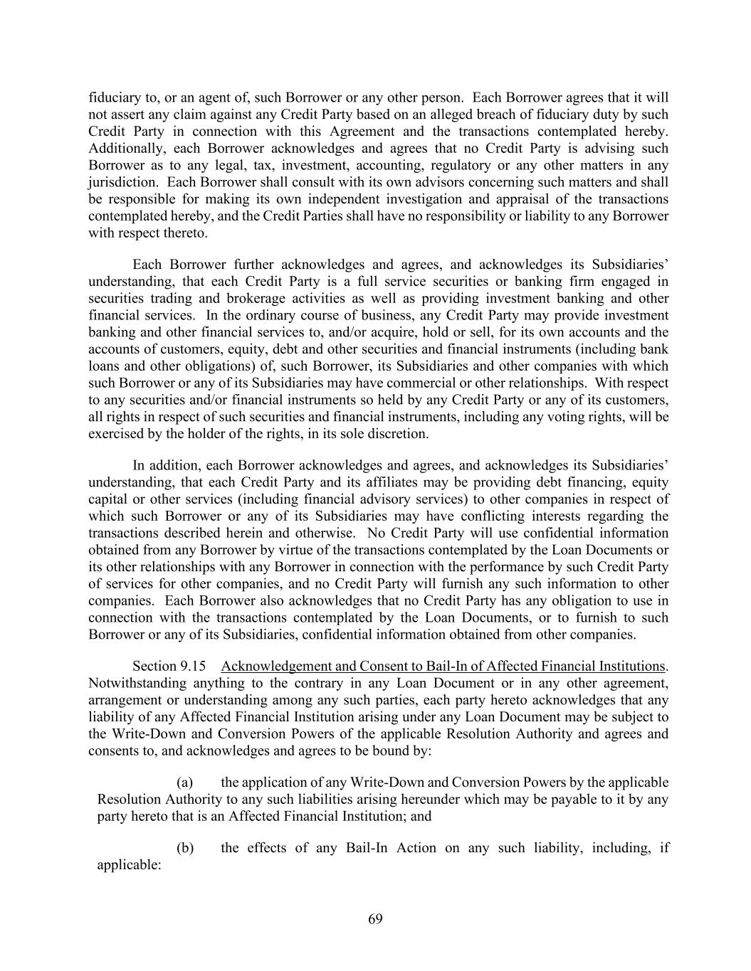 69 fiduciary to, or an agent of, such Borrower or any other person. Each Borrower agrees that it will not assert any claim against any Credit Party based on an alleged breach of fiduciary duty by such Credit Party in connection with this Agreement and the transactions contemplated hereby. Additionally, each Borrower acknowledges and agrees that no Credit Party is advising such Borrower as to any legal, tax, investment, accounting, regulatory or any other matters in any jurisdiction. Each Borrower shall consult with its own advisors concerning such matters and shall be responsible for making its own independent investigation and appraisal of the transactions contemplated hereby, and the Credit Parties shall have no responsibility or liability to any Borrower with respect thereto. Each Borrower further acknowledges and agrees, and acknowledges its Subsidiaries’ understanding, that each Credit Party is a full service securities or banking firm engaged in securities trading and brokerage activities as well as providing investment banking and other financial services. In the ordinary course of business, any Credit Party may provide investment banking and other financial services to, and/or acquire, hold or sell, for its own accounts and the accounts of customers, equity, debt and other securities and financial instruments (including bank loans and other obligations) of, such Borrower, its Subsidiaries and other companies with which such Borrower or any of its Subsidiaries may have commercial or other relationships. With respect to any securities and/or financial instruments so held by any Credit Party or any of its customers, all rights in respect of such securities and financial instruments, including any voting rights, will be exercised by the holder of the rights, in its sole discretion. In addition, each Borrower acknowledges and agrees, and acknowledges its Subsidiaries’ understanding, that each Credit Party and its affiliates may be providing debt financing, equity capital or other services (including financial advisory services) to other companies in respect of which such Borrower or any of its Subsidiaries may have conflicting interests regarding the transactions described herein and otherwise. No Credit Party will use confidential information obtained from any Borrower by virtue of the transactions contemplated by the Loan Documents or its other relationships with any Borrower in connection with the performance by such Credit Party of services for other companies, and no Credit Party will furnish any such information to other companies. Each Borrower also acknowledges that no Credit Party has any obligation to use in connection with the transactions contemplated by the Loan Documents, or to furnish to such Borrower or any of its Subsidiaries, confidential information obtained from other companies. Section 9.15 Acknowledgement and Consent to Bail-In of Affected Financial Institutions. Notwithstanding anything to the contrary in any Loan Document or in any other agreement, arrangement or understanding among any such parties, each party hereto acknowledges that any liability of any Affected Financial Institution arising under any Loan Document may be subject to the Write-Down and Conversion Powers of the applicable Resolution Authority and agrees and consents to, and acknowledges and agrees to be bound by: (a) the application of any Write-Down and Conversion Powers by the applicable Resolution Authority to any such liabilities arising hereunder which may be payable to it by any party hereto that is an Affected Financial Institution; and (b) the effects of any Bail-In Action on any such liability, including, if applicable: