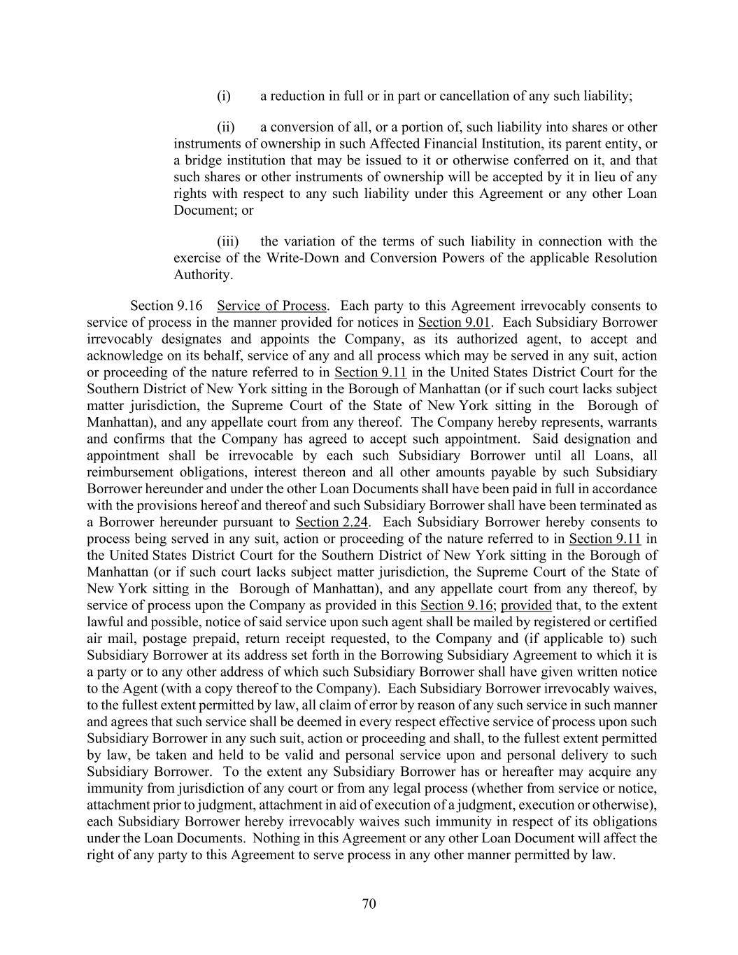 70 (i) a reduction in full or in part or cancellation of any such liability; (ii) a conversion of all, or a portion of, such liability into shares or other instruments of ownership in such Affected Financial Institution, its parent entity, or a bridge institution that may be issued to it or otherwise conferred on it, and that such shares or other instruments of ownership will be accepted by it in lieu of any rights with respect to any such liability under this Agreement or any other Loan Document; or (iii) the variation of the terms of such liability in connection with the exercise of the Write-Down and Conversion Powers of the applicable Resolution Authority. Section 9.16 Service of Process. Each party to this Agreement irrevocably consents to service of process in the manner provided for notices in Section 9.01. Each Subsidiary Borrower irrevocably designates and appoints the Company, as its authorized agent, to accept and acknowledge on its behalf, service of any and all process which may be served in any suit, action or proceeding of the nature referred to in Section 9.11 in the United States District Court for the Southern District of New York sitting in the Borough of Manhattan (or if such court lacks subject matter jurisdiction, the Supreme Court of the State of New York sitting in the Borough of Manhattan), and any appellate court from any thereof. The Company hereby represents, warrants and confirms that the Company has agreed to accept such appointment. Said designation and appointment shall be irrevocable by each such Subsidiary Borrower until all Loans, all reimbursement obligations, interest thereon and all other amounts payable by such Subsidiary Borrower hereunder and under the other Loan Documents shall have been paid in full in accordance with the provisions hereof and thereof and such Subsidiary Borrower shall have been terminated as a Borrower hereunder pursuant to Section 2.24. Each Subsidiary Borrower hereby consents to process being served in any suit, action or proceeding of the nature referred to in Section 9.11 in the United States District Court for the Southern District of New York sitting in the Borough of Manhattan (or if such court lacks subject matter jurisdiction, the Supreme Court of the State of New York sitting in the Borough of Manhattan), and any appellate court from any thereof, by service of process upon the Company as provided in this Section 9.16; provided that, to the extent lawful and possible, notice of said service upon such agent shall be mailed by registered or certified air mail, postage prepaid, return receipt requested, to the Company and (if applicable to) such Subsidiary Borrower at its address set forth in the Borrowing Subsidiary Agreement to which it is a party or to any other address of which such Subsidiary Borrower shall have given written notice to the Agent (with a copy thereof to the Company). Each Subsidiary Borrower irrevocably waives, to the fullest extent permitted by law, all claim of error by reason of any such service in such manner and agrees that such service shall be deemed in every respect effective service of process upon such Subsidiary Borrower in any such suit, action or proceeding and shall, to the fullest extent permitted by law, be taken and held to be valid and personal service upon and personal delivery to such Subsidiary Borrower. To the extent any Subsidiary Borrower has or hereafter may acquire any immunity from jurisdiction of any court or from any legal process (whether from service or notice, attachment prior to judgment, attachment in aid of execution of a judgment, execution or otherwise), each Subsidiary Borrower hereby irrevocably waives such immunity in respect of its obligations under the Loan Documents. Nothing in this Agreement or any other Loan Document will affect the right of any party to this Agreement to serve process in any other manner permitted by law.