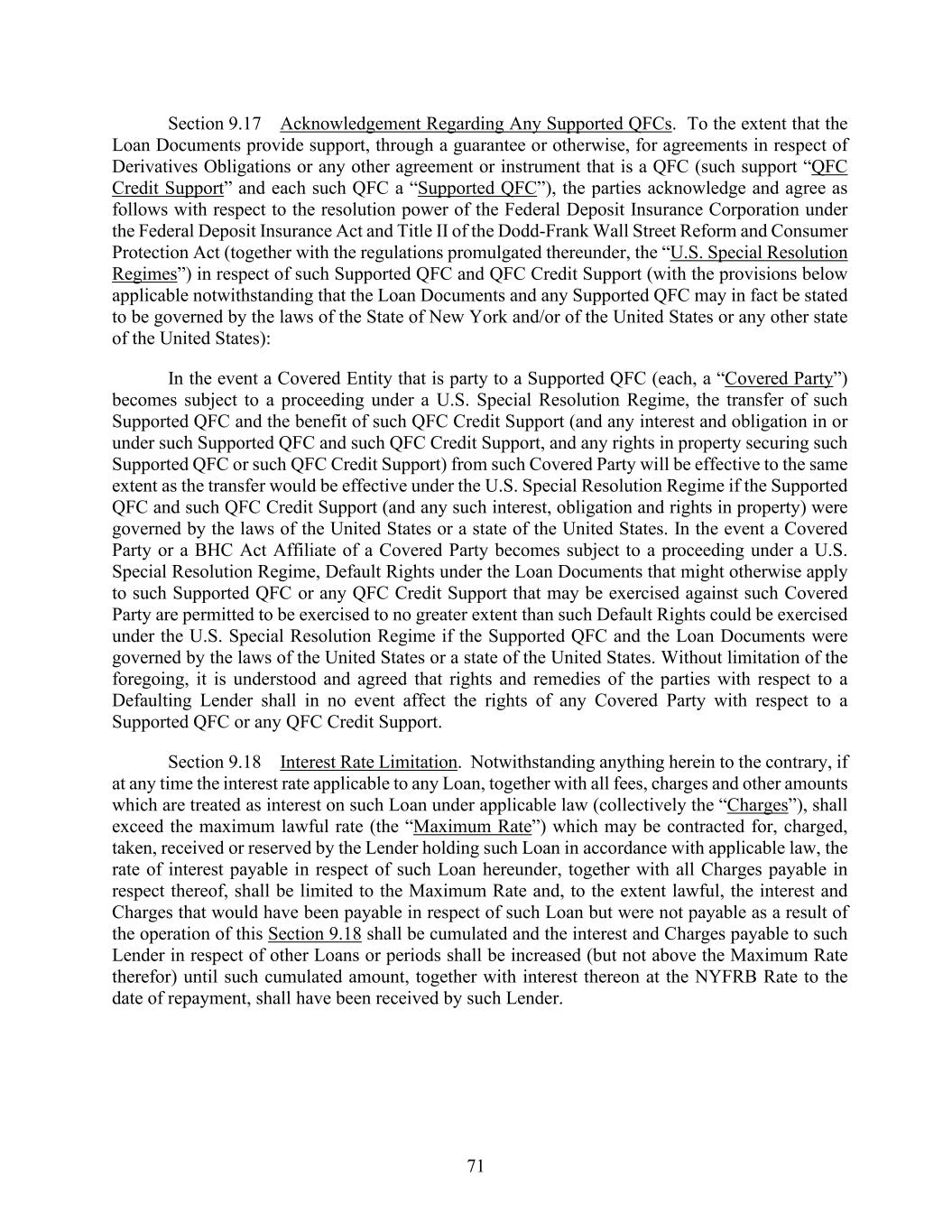 71 Section 9.17 Acknowledgement Regarding Any Supported QFCs. To the extent that the Loan Documents provide support, through a guarantee or otherwise, for agreements in respect of Derivatives Obligations or any other agreement or instrument that is a QFC (such support “QFC Credit Support” and each such QFC a “Supported QFC”), the parties acknowledge and agree as follows with respect to the resolution power of the Federal Deposit Insurance Corporation under the Federal Deposit Insurance Act and Title II of the Dodd-Frank Wall Street Reform and Consumer Protection Act (together with the regulations promulgated thereunder, the “U.S. Special Resolution Regimes”) in respect of such Supported QFC and QFC Credit Support (with the provisions below applicable notwithstanding that the Loan Documents and any Supported QFC may in fact be stated to be governed by the laws of the State of New York and/or of the United States or any other state of the United States): In the event a Covered Entity that is party to a Supported QFC (each, a “Covered Party”) becomes subject to a proceeding under a U.S. Special Resolution Regime, the transfer of such Supported QFC and the benefit of such QFC Credit Support (and any interest and obligation in or under such Supported QFC and such QFC Credit Support, and any rights in property securing such Supported QFC or such QFC Credit Support) from such Covered Party will be effective to the same extent as the transfer would be effective under the U.S. Special Resolution Regime if the Supported QFC and such QFC Credit Support (and any such interest, obligation and rights in property) were governed by the laws of the United States or a state of the United States. In the event a Covered Party or a BHC Act Affiliate of a Covered Party becomes subject to a proceeding under a U.S. Special Resolution Regime, Default Rights under the Loan Documents that might otherwise apply to such Supported QFC or any QFC Credit Support that may be exercised against such Covered Party are permitted to be exercised to no greater extent than such Default Rights could be exercised under the U.S. Special Resolution Regime if the Supported QFC and the Loan Documents were governed by the laws of the United States or a state of the United States. Without limitation of the foregoing, it is understood and agreed that rights and remedies of the parties with respect to a Defaulting Lender shall in no event affect the rights of any Covered Party with respect to a Supported QFC or any QFC Credit Support. Section 9.18 Interest Rate Limitation. Notwithstanding anything herein to the contrary, if at any time the interest rate applicable to any Loan, together with all fees, charges and other amounts which are treated as interest on such Loan under applicable law (collectively the “Charges”), shall exceed the maximum lawful rate (the “Maximum Rate”) which may be contracted for, charged, taken, received or reserved by the Lender holding such Loan in accordance with applicable law, the rate of interest payable in respect of such Loan hereunder, together with all Charges payable in respect thereof, shall be limited to the Maximum Rate and, to the extent lawful, the interest and Charges that would have been payable in respect of such Loan but were not payable as a result of the operation of this Section 9.18 shall be cumulated and the interest and Charges payable to such Lender in respect of other Loans or periods shall be increased (but not above the Maximum Rate therefor) until such cumulated amount, together with interest thereon at the NYFRB Rate to the date of repayment, shall have been received by such Lender.