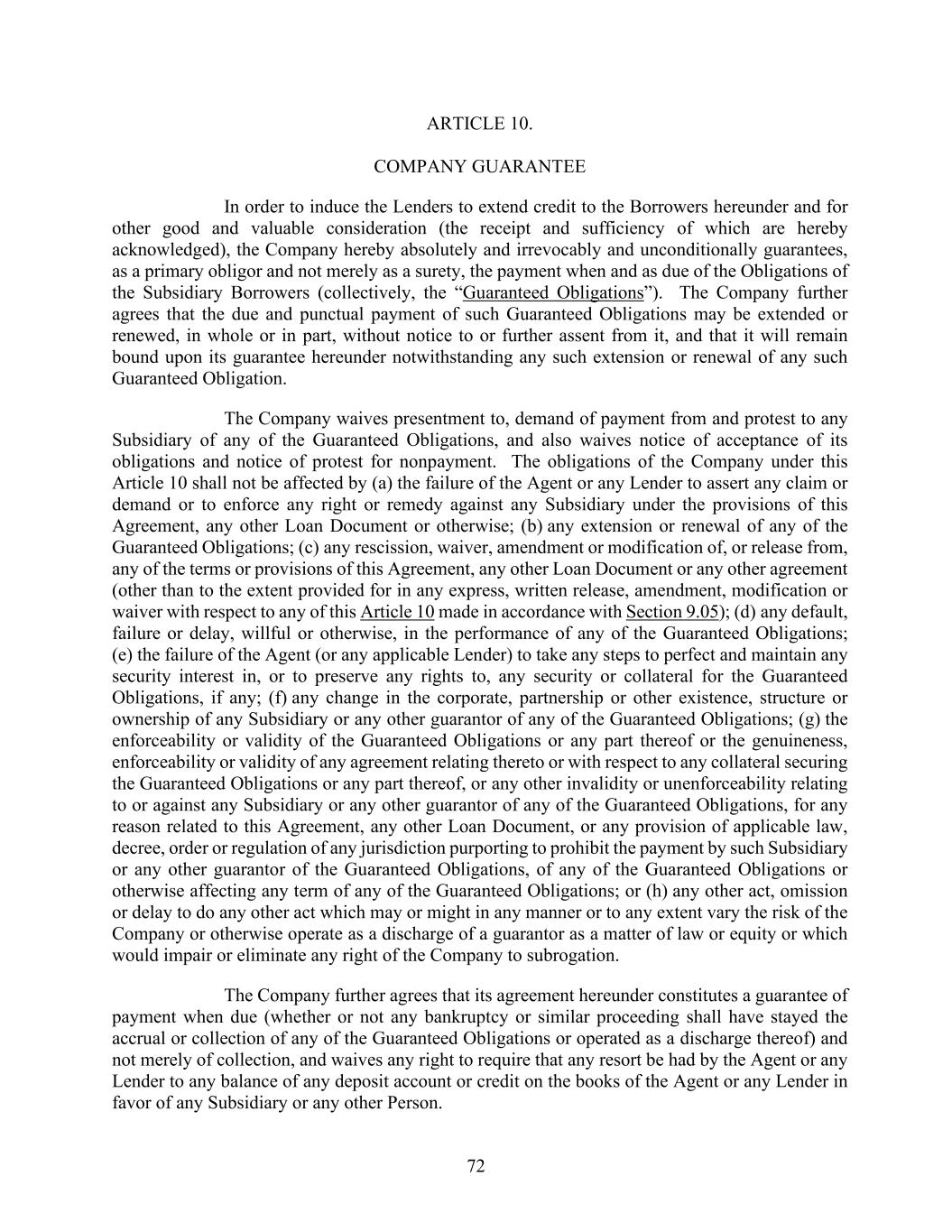72 ARTICLE 10. COMPANY GUARANTEE In order to induce the Lenders to extend credit to the Borrowers hereunder and for other good and valuable consideration (the receipt and sufficiency of which are hereby acknowledged), the Company hereby absolutely and irrevocably and unconditionally guarantees, as a primary obligor and not merely as a surety, the payment when and as due of the Obligations of the Subsidiary Borrowers (collectively, the “Guaranteed Obligations”). The Company further agrees that the due and punctual payment of such Guaranteed Obligations may be extended or renewed, in whole or in part, without notice to or further assent from it, and that it will remain bound upon its guarantee hereunder notwithstanding any such extension or renewal of any such Guaranteed Obligation. The Company waives presentment to, demand of payment from and protest to any Subsidiary of any of the Guaranteed Obligations, and also waives notice of acceptance of its obligations and notice of protest for nonpayment. The obligations of the Company under this Article 10 shall not be affected by (a) the failure of the Agent or any Lender to assert any claim or demand or to enforce any right or remedy against any Subsidiary under the provisions of this Agreement, any other Loan Document or otherwise; (b) any extension or renewal of any of the Guaranteed Obligations; (c) any rescission, waiver, amendment or modification of, or release from, any of the terms or provisions of this Agreement, any other Loan Document or any other agreement (other than to the extent provided for in any express, written release, amendment, modification or waiver with respect to any of this Article 10 made in accordance with Section 9.05); (d) any default, failure or delay, willful or otherwise, in the performance of any of the Guaranteed Obligations; (e) the failure of the Agent (or any applicable Lender) to take any steps to perfect and maintain any security interest in, or to preserve any rights to, any security or collateral for the Guaranteed Obligations, if any; (f) any change in the corporate, partnership or other existence, structure or ownership of any Subsidiary or any other guarantor of any of the Guaranteed Obligations; (g) the enforceability or validity of the Guaranteed Obligations or any part thereof or the genuineness, enforceability or validity of any agreement relating thereto or with respect to any collateral securing the Guaranteed Obligations or any part thereof, or any other invalidity or unenforceability relating to or against any Subsidiary or any other guarantor of any of the Guaranteed Obligations, for any reason related to this Agreement, any other Loan Document, or any provision of applicable law, decree, order or regulation of any jurisdiction purporting to prohibit the payment by such Subsidiary or any other guarantor of the Guaranteed Obligations, of any of the Guaranteed Obligations or otherwise affecting any term of any of the Guaranteed Obligations; or (h) any other act, omission or delay to do any other act which may or might in any manner or to any extent vary the risk of the Company or otherwise operate as a discharge of a guarantor as a matter of law or equity or which would impair or eliminate any right of the Company to subrogation. The Company further agrees that its agreement hereunder constitutes a guarantee of payment when due (whether or not any bankruptcy or similar proceeding shall have stayed the accrual or collection of any of the Guaranteed Obligations or operated as a discharge thereof) and not merely of collection, and waives any right to require that any resort be had by the Agent or any Lender to any balance of any deposit account or credit on the books of the Agent or any Lender in favor of any Subsidiary or any other Person.