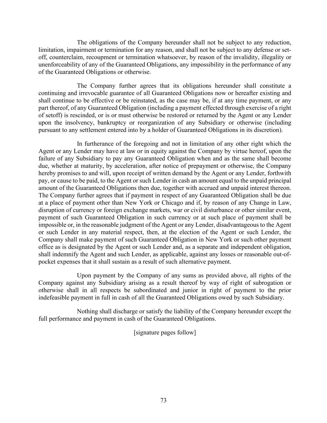 73 The obligations of the Company hereunder shall not be subject to any reduction, limitation, impairment or termination for any reason, and shall not be subject to any defense or set- off, counterclaim, recoupment or termination whatsoever, by reason of the invalidity, illegality or unenforceability of any of the Guaranteed Obligations, any impossibility in the performance of any of the Guaranteed Obligations or otherwise. The Company further agrees that its obligations hereunder shall constitute a continuing and irrevocable guarantee of all Guaranteed Obligations now or hereafter existing and shall continue to be effective or be reinstated, as the case may be, if at any time payment, or any part thereof, of any Guaranteed Obligation (including a payment effected through exercise of a right of setoff) is rescinded, or is or must otherwise be restored or returned by the Agent or any Lender upon the insolvency, bankruptcy or reorganization of any Subsidiary or otherwise (including pursuant to any settlement entered into by a holder of Guaranteed Obligations in its discretion). In furtherance of the foregoing and not in limitation of any other right which the Agent or any Lender may have at law or in equity against the Company by virtue hereof, upon the failure of any Subsidiary to pay any Guaranteed Obligation when and as the same shall become due, whether at maturity, by acceleration, after notice of prepayment or otherwise, the Company hereby promises to and will, upon receipt of written demand by the Agent or any Lender, forthwith pay, or cause to be paid, to the Agent or such Lender in cash an amount equal to the unpaid principal amount of the Guaranteed Obligations then due, together with accrued and unpaid interest thereon. The Company further agrees that if payment in respect of any Guaranteed Obligation shall be due at a place of payment other than New York or Chicago and if, by reason of any Change in Law, disruption of currency or foreign exchange markets, war or civil disturbance or other similar event, payment of such Guaranteed Obligation in such currency or at such place of payment shall be impossible or, in the reasonable judgment of the Agent or any Lender, disadvantageous to the Agent or such Lender in any material respect, then, at the election of the Agent or such Lender, the Company shall make payment of such Guaranteed Obligation in New York or such other payment office as is designated by the Agent or such Lender and, as a separate and independent obligation, shall indemnify the Agent and such Lender, as applicable, against any losses or reasonable out-of- pocket expenses that it shall sustain as a result of such alternative payment. Upon payment by the Company of any sums as provided above, all rights of the Company against any Subsidiary arising as a result thereof by way of right of subrogation or otherwise shall in all respects be subordinated and junior in right of payment to the prior indefeasible payment in full in cash of all the Guaranteed Obligations owed by such Subsidiary. Nothing shall discharge or satisfy the liability of the Company hereunder except the full performance and payment in cash of the Guaranteed Obligations. [signature pages follow]