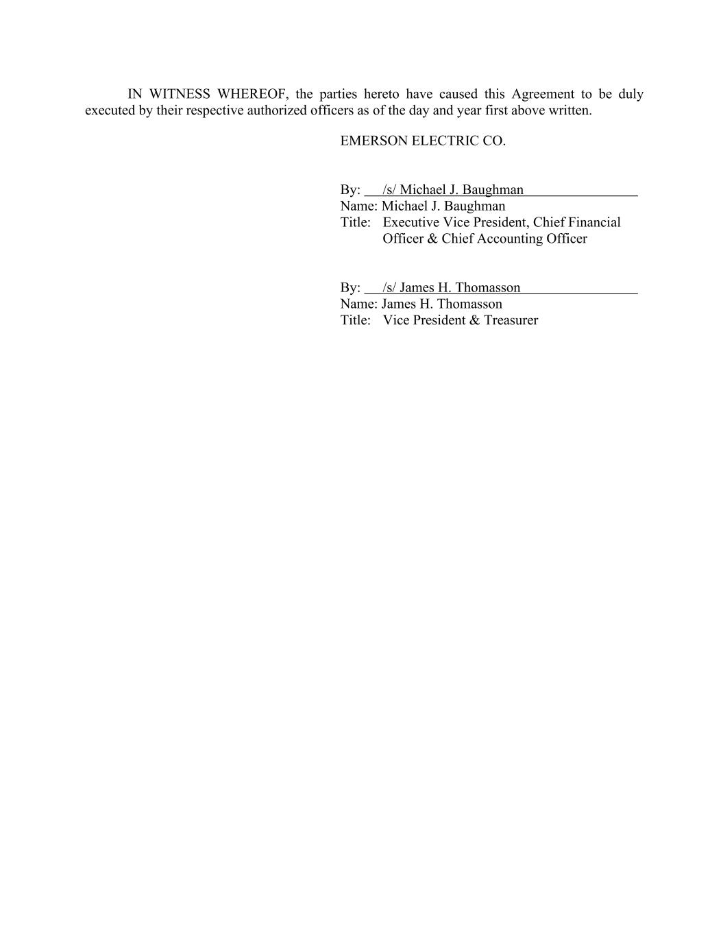 IN WITNESS WHEREOF, the parties hereto have caused this Agreement to be duly executed by their respective authorized officers as of the day and year first above written. EMERSON ELECTRIC CO. By: /s/ Michael J. Baughman Name: Michael J. Baughman Title: Executive Vice President, Chief Financial Officer & Chief Accounting Officer By: /s/ James H. Thomasson Name: James H. Thomasson Title: Vice President & Treasurer