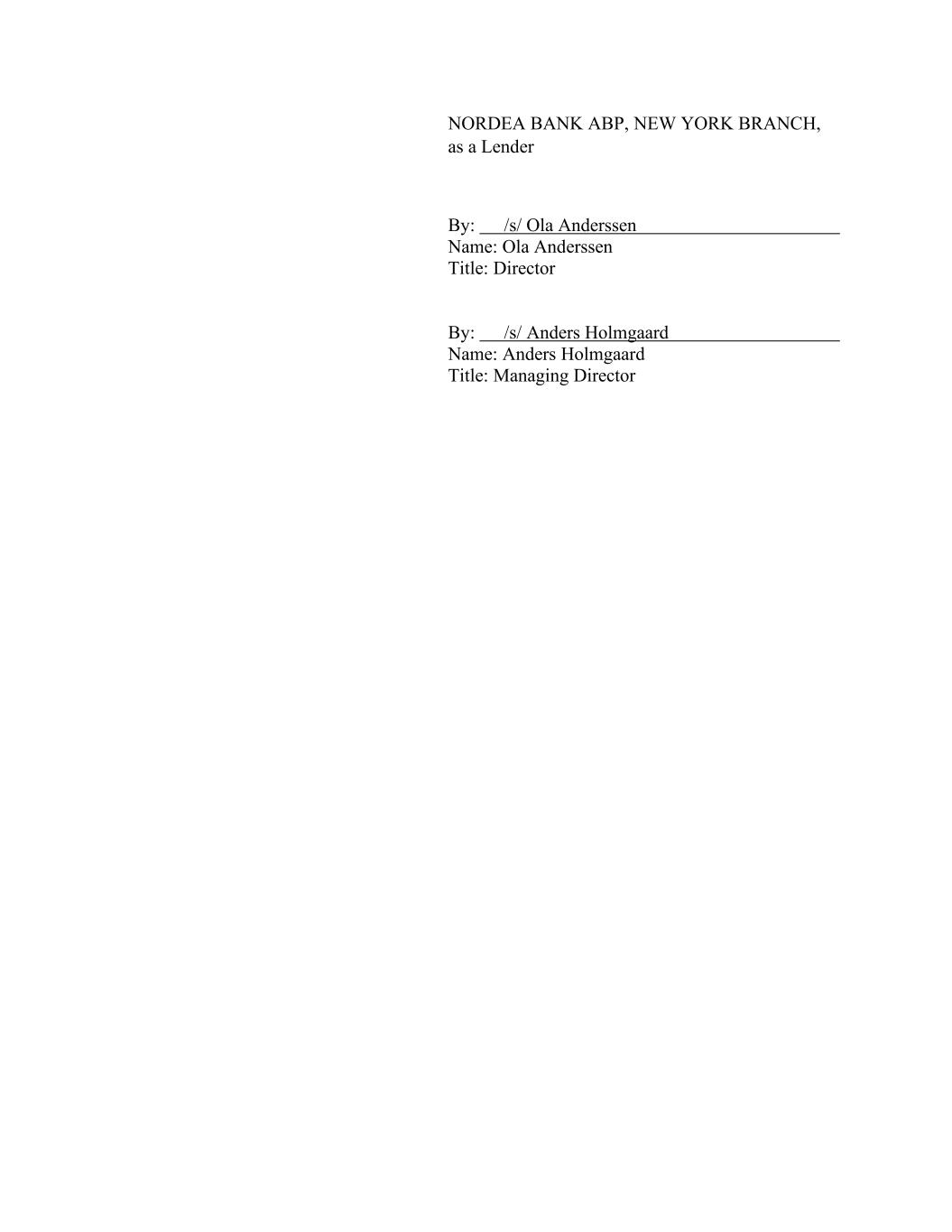 NORDEA BANK ABP, NEW YORK BRANCH, as a Lender By: /s/ Ola Anderssen Name: Ola Anderssen Title: Director By: /s/ Anders Holmgaard Name: Anders Holmgaard Title: Managing Director
