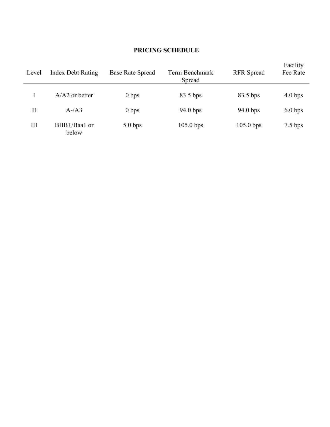 PRICING SCHEDULE Level Index Debt Rating Base Rate Spread Term Benchmark Spread RFR Spread Facility Fee Rate I A/A2 or better 0 bps 83.5 bps 83.5 bps 4.0 bps II A-/A3 0 bps 94.0 bps 94.0 bps 6.0 bps III BBB+/Baa1 or below 5.0 bps 105.0 bps 105.0 bps 7.5 bps
