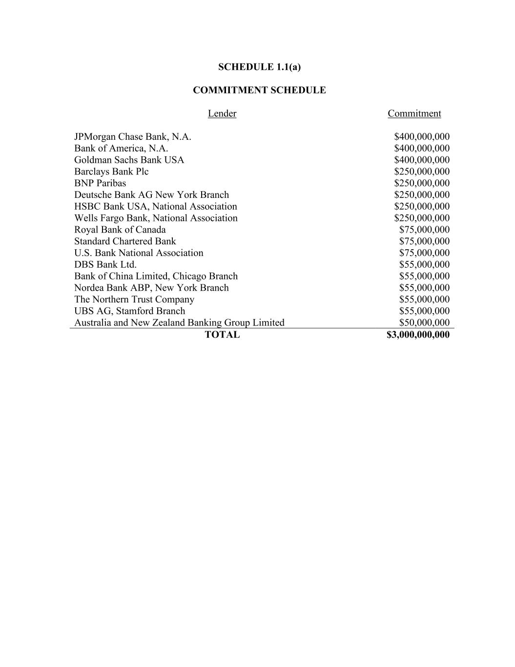 SCHEDULE 1.1(a) COMMITMENT SCHEDULE Lender Commitment JPMorgan Chase Bank, N.A. $400,000,000 Bank of America, N.A. $400,000,000 Goldman Sachs Bank USA $400,000,000 Barclays Bank Plc $250,000,000 BNP Paribas $250,000,000 Deutsche Bank AG New York Branch $250,000,000 HSBC Bank USA, National Association $250,000,000 Wells Fargo Bank, National Association $250,000,000 Royal Bank of Canada $75,000,000 Standard Chartered Bank $75,000,000 U.S. Bank National Association $75,000,000 DBS Bank Ltd. $55,000,000 Bank of China Limited, Chicago Branch $55,000,000 Nordea Bank ABP, New York Branch $55,000,000 The Northern Trust Company $55,000,000 UBS AG, Stamford Branch $55,000,000 Australia and New Zealand Banking Group Limited $50,000,000 TOTAL $3,000,000,000