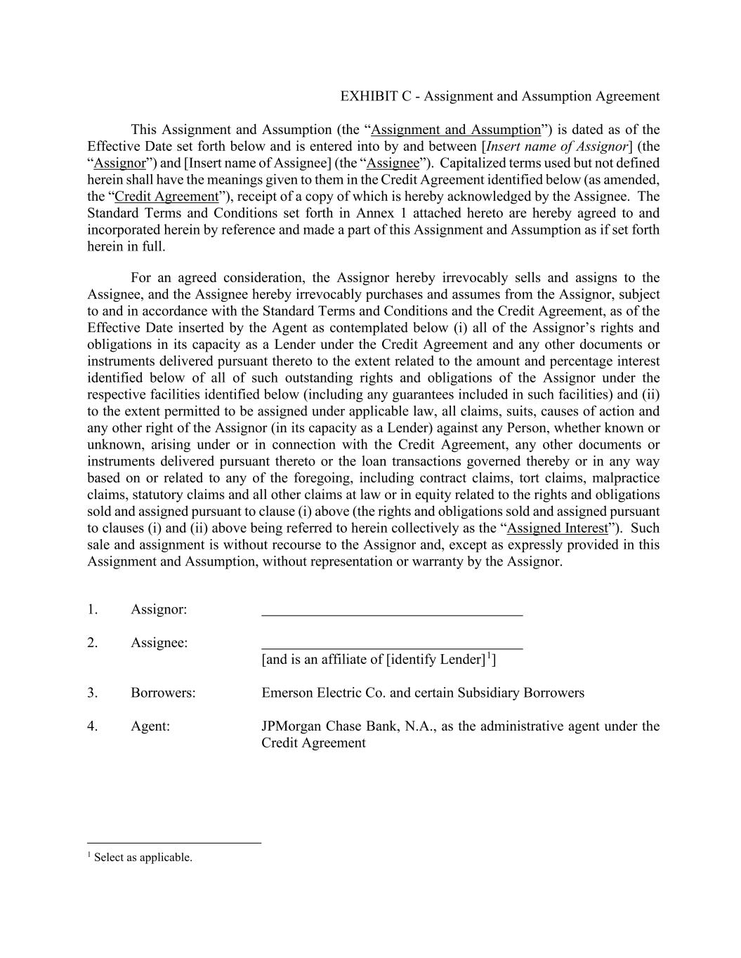 EXHIBIT C - Assignment and Assumption Agreement This Assignment and Assumption (the “Assignment and Assumption”) is dated as of the Effective Date set forth below and is entered into by and between [Insert name of Assignor] (the “Assignor”) and [Insert name of Assignee] (the “Assignee”). Capitalized terms used but not defined herein shall have the meanings given to them in the Credit Agreement identified below (as amended, the “Credit Agreement”), receipt of a copy of which is hereby acknowledged by the Assignee. The Standard Terms and Conditions set forth in Annex 1 attached hereto are hereby agreed to and incorporated herein by reference and made a part of this Assignment and Assumption as if set forth herein in full. For an agreed consideration, the Assignor hereby irrevocably sells and assigns to the Assignee, and the Assignee hereby irrevocably purchases and assumes from the Assignor, subject to and in accordance with the Standard Terms and Conditions and the Credit Agreement, as of the Effective Date inserted by the Agent as contemplated below (i) all of the Assignor’s rights and obligations in its capacity as a Lender under the Credit Agreement and any other documents or instruments delivered pursuant thereto to the extent related to the amount and percentage interest identified below of all of such outstanding rights and obligations of the Assignor under the respective facilities identified below (including any guarantees included in such facilities) and (ii) to the extent permitted to be assigned under applicable law, all claims, suits, causes of action and any other right of the Assignor (in its capacity as a Lender) against any Person, whether known or unknown, arising under or in connection with the Credit Agreement, any other documents or instruments delivered pursuant thereto or the loan transactions governed thereby or in any way based on or related to any of the foregoing, including contract claims, tort claims, malpractice claims, statutory claims and all other claims at law or in equity related to the rights and obligations sold and assigned pursuant to clause (i) above (the rights and obligations sold and assigned pursuant to clauses (i) and (ii) above being referred to herein collectively as the “Assigned Interest”). Such sale and assignment is without recourse to the Assignor and, except as expressly provided in this Assignment and Assumption, without representation or warranty by the Assignor. 1. Assignor: 2. Assignee: [and is an affiliate of [identify Lender]1] 3. Borrowers: Emerson Electric Co. and certain Subsidiary Borrowers 4. Agent: JPMorgan Chase Bank, N.A., as the administrative agent under the Credit Agreement 1 Select as applicable.