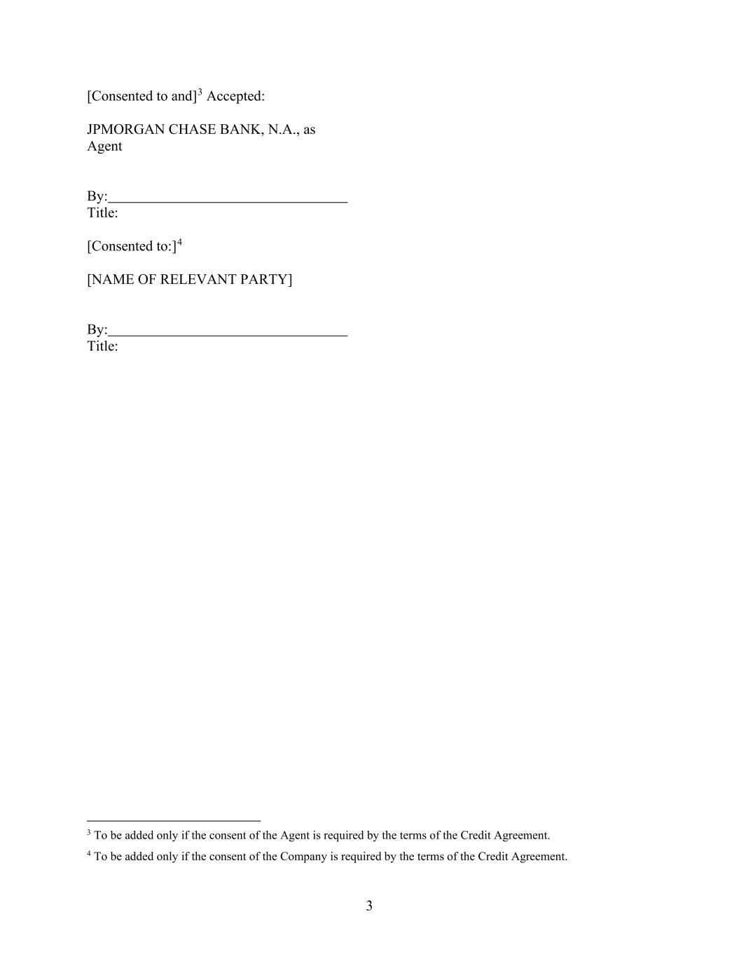 3 [Consented to and]3 Accepted: JPMORGAN CHASE BANK, N.A., as Agent By: Title: [Consented to:]4 [NAME OF RELEVANT PARTY] By: Title: 3 To be added only if the consent of the Agent is required by the terms of the Credit Agreement. 4 To be added only if the consent of the Company is required by the terms of the Credit Agreement.