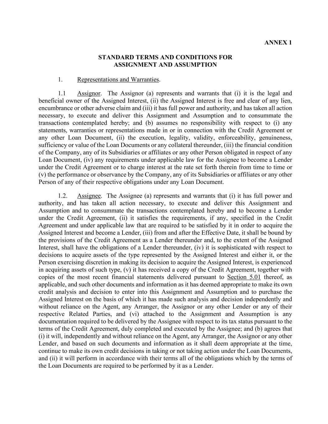 ANNEX 1 STANDARD TERMS AND CONDITIONS FOR ASSIGNMENT AND ASSUMPTION 1. Representations and Warranties. 1.1 Assignor. The Assignor (a) represents and warrants that (i) it is the legal and beneficial owner of the Assigned Interest, (ii) the Assigned Interest is free and clear of any lien, encumbrance or other adverse claim and (iii) it has full power and authority, and has taken all action necessary, to execute and deliver this Assignment and Assumption and to consummate the transactions contemplated hereby; and (b) assumes no responsibility with respect to (i) any statements, warranties or representations made in or in connection with the Credit Agreement or any other Loan Document, (ii) the execution, legality, validity, enforceability, genuineness, sufficiency or value of the Loan Documents or any collateral thereunder, (iii) the financial condition of the Company, any of its Subsidiaries or affiliates or any other Person obligated in respect of any Loan Document, (iv) any requirements under applicable law for the Assignee to become a Lender under the Credit Agreement or to charge interest at the rate set forth therein from time to time or (v) the performance or observance by the Company, any of its Subsidiaries or affiliates or any other Person of any of their respective obligations under any Loan Document. 1.2. Assignee. The Assignee (a) represents and warrants that (i) it has full power and authority, and has taken all action necessary, to execute and deliver this Assignment and Assumption and to consummate the transactions contemplated hereby and to become a Lender under the Credit Agreement, (ii) it satisfies the requirements, if any, specified in the Credit Agreement and under applicable law that are required to be satisfied by it in order to acquire the Assigned Interest and become a Lender, (iii) from and after the Effective Date, it shall be bound by the provisions of the Credit Agreement as a Lender thereunder and, to the extent of the Assigned Interest, shall have the obligations of a Lender thereunder, (iv) it is sophisticated with respect to decisions to acquire assets of the type represented by the Assigned Interest and either it, or the Person exercising discretion in making its decision to acquire the Assigned Interest, is experienced in acquiring assets of such type, (v) it has received a copy of the Credit Agreement, together with copies of the most recent financial statements delivered pursuant to Section 5.01 thereof, as applicable, and such other documents and information as it has deemed appropriate to make its own credit analysis and decision to enter into this Assignment and Assumption and to purchase the Assigned Interest on the basis of which it has made such analysis and decision independently and without reliance on the Agent, any Arranger, the Assignor or any other Lender or any of their respective Related Parties, and (vi) attached to the Assignment and Assumption is any documentation required to be delivered by the Assignee with respect to its tax status pursuant to the terms of the Credit Agreement, duly completed and executed by the Assignee; and (b) agrees that (i) it will, independently and without reliance on the Agent, any Arranger, the Assignor or any other Lender, and based on such documents and information as it shall deem appropriate at the time, continue to make its own credit decisions in taking or not taking action under the Loan Documents, and (ii) it will perform in accordance with their terms all of the obligations which by the terms of the Loan Documents are required to be performed by it as a Lender.