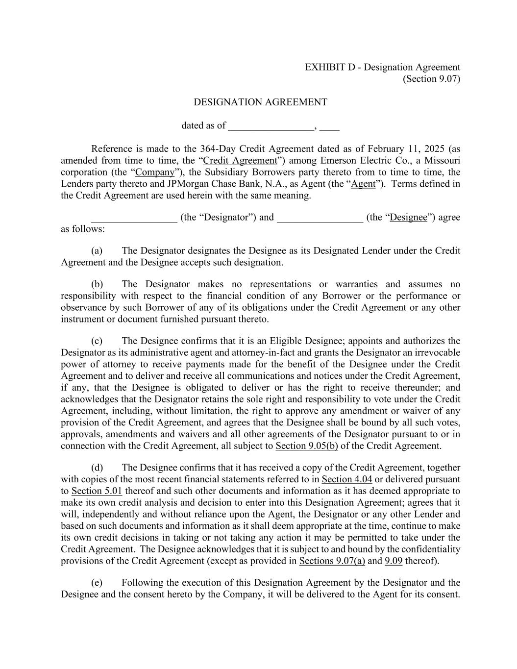 EXHIBIT D - Designation Agreement (Section 9.07) DESIGNATION AGREEMENT dated as of _________________, ____ Reference is made to the 364-Day Credit Agreement dated as of February 11, 2025 (as amended from time to time, the “Credit Agreement”) among Emerson Electric Co., a Missouri corporation (the “Company”), the Subsidiary Borrowers party thereto from to time to time, the Lenders party thereto and JPMorgan Chase Bank, N.A., as Agent (the “Agent”). Terms defined in the Credit Agreement are used herein with the same meaning. _________________ (the “Designator”) and _________________ (the “Designee”) agree as follows: (a) The Designator designates the Designee as its Designated Lender under the Credit Agreement and the Designee accepts such designation. (b) The Designator makes no representations or warranties and assumes no responsibility with respect to the financial condition of any Borrower or the performance or observance by such Borrower of any of its obligations under the Credit Agreement or any other instrument or document furnished pursuant thereto. (c) The Designee confirms that it is an Eligible Designee; appoints and authorizes the Designator as its administrative agent and attorney-in-fact and grants the Designator an irrevocable power of attorney to receive payments made for the benefit of the Designee under the Credit Agreement and to deliver and receive all communications and notices under the Credit Agreement, if any, that the Designee is obligated to deliver or has the right to receive thereunder; and acknowledges that the Designator retains the sole right and responsibility to vote under the Credit Agreement, including, without limitation, the right to approve any amendment or waiver of any provision of the Credit Agreement, and agrees that the Designee shall be bound by all such votes, approvals, amendments and waivers and all other agreements of the Designator pursuant to or in connection with the Credit Agreement, all subject to Section 9.05(b) of the Credit Agreement. (d) The Designee confirms that it has received a copy of the Credit Agreement, together with copies of the most recent financial statements referred to in Section 4.04 or delivered pursuant to Section 5.01 thereof and such other documents and information as it has deemed appropriate to make its own credit analysis and decision to enter into this Designation Agreement; agrees that it will, independently and without reliance upon the Agent, the Designator or any other Lender and based on such documents and information as it shall deem appropriate at the time, continue to make its own credit decisions in taking or not taking any action it may be permitted to take under the Credit Agreement. The Designee acknowledges that it is subject to and bound by the confidentiality provisions of the Credit Agreement (except as provided in Sections 9.07(a) and 9.09 thereof). (e) Following the execution of this Designation Agreement by the Designator and the Designee and the consent hereto by the Company, it will be delivered to the Agent for its consent.
