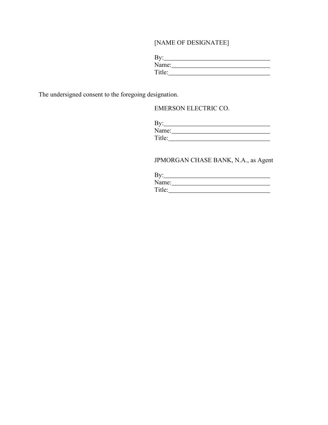 [NAME OF DESIGNATEE] By: Name: Title: The undersigned consent to the foregoing designation. EMERSON ELECTRIC CO. By: Name: Title: JPMORGAN CHASE BANK, N.A., as Agent By: Name: Title: