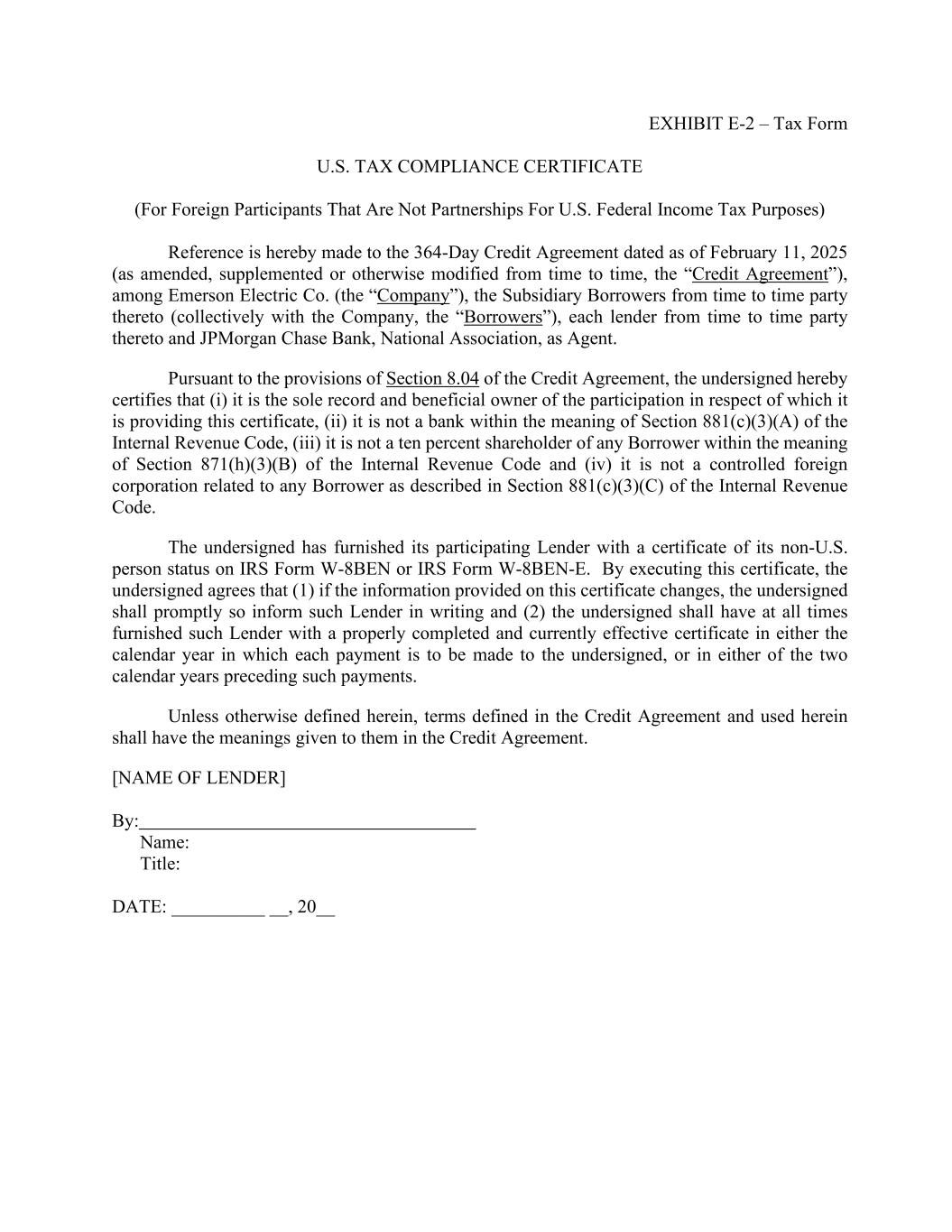 EXHIBIT E-2 – Tax Form U.S. TAX COMPLIANCE CERTIFICATE (For Foreign Participants That Are Not Partnerships For U.S. Federal Income Tax Purposes) Reference is hereby made to the 364-Day Credit Agreement dated as of February 11, 2025 (as amended, supplemented or otherwise modified from time to time, the “Credit Agreement”), among Emerson Electric Co. (the “Company”), the Subsidiary Borrowers from time to time party thereto (collectively with the Company, the “Borrowers”), each lender from time to time party thereto and JPMorgan Chase Bank, National Association, as Agent. Pursuant to the provisions of Section 8.04 of the Credit Agreement, the undersigned hereby certifies that (i) it is the sole record and beneficial owner of the participation in respect of which it is providing this certificate, (ii) it is not a bank within the meaning of Section 881(c)(3)(A) of the Internal Revenue Code, (iii) it is not a ten percent shareholder of any Borrower within the meaning of Section 871(h)(3)(B) of the Internal Revenue Code and (iv) it is not a controlled foreign corporation related to any Borrower as described in Section 881(c)(3)(C) of the Internal Revenue Code. The undersigned has furnished its participating Lender with a certificate of its non-U.S. person status on IRS Form W-8BEN or IRS Form W-8BEN-E. By executing this certificate, the undersigned agrees that (1) if the information provided on this certificate changes, the undersigned shall promptly so inform such Lender in writing and (2) the undersigned shall have at all times furnished such Lender with a properly completed and currently effective certificate in either the calendar year in which each payment is to be made to the undersigned, or in either of the two calendar years preceding such payments. Unless otherwise defined herein, terms defined in the Credit Agreement and used herein shall have the meanings given to them in the Credit Agreement. [NAME OF LENDER] By: Name: Title: DATE: __________ __, 20__