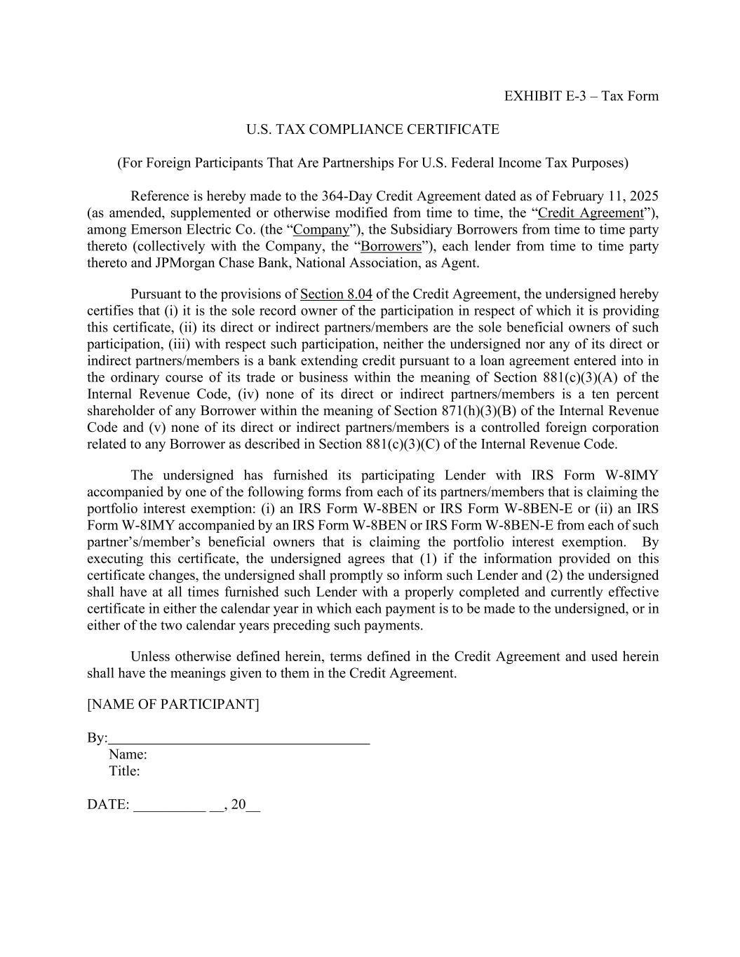 EXHIBIT E-3 – Tax Form U.S. TAX COMPLIANCE CERTIFICATE (For Foreign Participants That Are Partnerships For U.S. Federal Income Tax Purposes) Reference is hereby made to the 364-Day Credit Agreement dated as of February 11, 2025 (as amended, supplemented or otherwise modified from time to time, the “Credit Agreement”), among Emerson Electric Co. (the “Company”), the Subsidiary Borrowers from time to time party thereto (collectively with the Company, the “Borrowers”), each lender from time to time party thereto and JPMorgan Chase Bank, National Association, as Agent. Pursuant to the provisions of Section 8.04 of the Credit Agreement, the undersigned hereby certifies that (i) it is the sole record owner of the participation in respect of which it is providing this certificate, (ii) its direct or indirect partners/members are the sole beneficial owners of such participation, (iii) with respect such participation, neither the undersigned nor any of its direct or indirect partners/members is a bank extending credit pursuant to a loan agreement entered into in the ordinary course of its trade or business within the meaning of Section 881(c)(3)(A) of the Internal Revenue Code, (iv) none of its direct or indirect partners/members is a ten percent shareholder of any Borrower within the meaning of Section 871(h)(3)(B) of the Internal Revenue Code and (v) none of its direct or indirect partners/members is a controlled foreign corporation related to any Borrower as described in Section 881(c)(3)(C) of the Internal Revenue Code. The undersigned has furnished its participating Lender with IRS Form W-8IMY accompanied by one of the following forms from each of its partners/members that is claiming the portfolio interest exemption: (i) an IRS Form W-8BEN or IRS Form W-8BEN-E or (ii) an IRS Form W-8IMY accompanied by an IRS Form W-8BEN or IRS Form W-8BEN-E from each of such partner’s/member’s beneficial owners that is claiming the portfolio interest exemption. By executing this certificate, the undersigned agrees that (1) if the information provided on this certificate changes, the undersigned shall promptly so inform such Lender and (2) the undersigned shall have at all times furnished such Lender with a properly completed and currently effective certificate in either the calendar year in which each payment is to be made to the undersigned, or in either of the two calendar years preceding such payments. Unless otherwise defined herein, terms defined in the Credit Agreement and used herein shall have the meanings given to them in the Credit Agreement. [NAME OF PARTICIPANT] By: Name: Title: DATE: __________ __, 20__