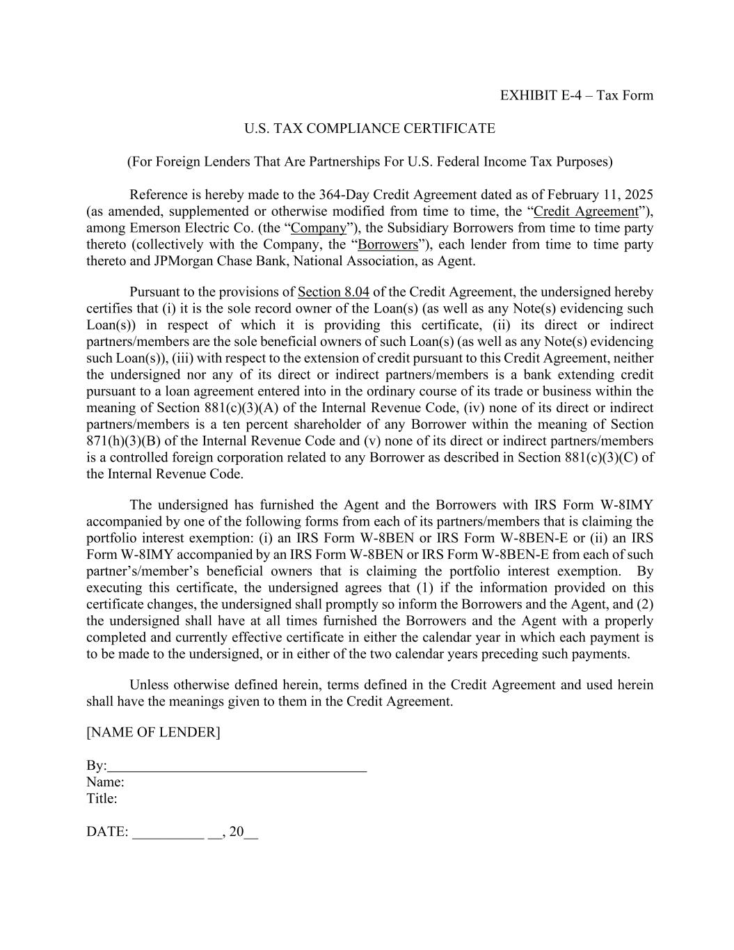 EXHIBIT E-4 – Tax Form U.S. TAX COMPLIANCE CERTIFICATE (For Foreign Lenders That Are Partnerships For U.S. Federal Income Tax Purposes) Reference is hereby made to the 364-Day Credit Agreement dated as of February 11, 2025 (as amended, supplemented or otherwise modified from time to time, the “Credit Agreement”), among Emerson Electric Co. (the “Company”), the Subsidiary Borrowers from time to time party thereto (collectively with the Company, the “Borrowers”), each lender from time to time party thereto and JPMorgan Chase Bank, National Association, as Agent. Pursuant to the provisions of Section 8.04 of the Credit Agreement, the undersigned hereby certifies that (i) it is the sole record owner of the Loan(s) (as well as any Note(s) evidencing such Loan(s)) in respect of which it is providing this certificate, (ii) its direct or indirect partners/members are the sole beneficial owners of such Loan(s) (as well as any Note(s) evidencing such Loan(s)), (iii) with respect to the extension of credit pursuant to this Credit Agreement, neither the undersigned nor any of its direct or indirect partners/members is a bank extending credit pursuant to a loan agreement entered into in the ordinary course of its trade or business within the meaning of Section 881(c)(3)(A) of the Internal Revenue Code, (iv) none of its direct or indirect partners/members is a ten percent shareholder of any Borrower within the meaning of Section 871(h)(3)(B) of the Internal Revenue Code and (v) none of its direct or indirect partners/members is a controlled foreign corporation related to any Borrower as described in Section 881(c)(3)(C) of the Internal Revenue Code. The undersigned has furnished the Agent and the Borrowers with IRS Form W-8IMY accompanied by one of the following forms from each of its partners/members that is claiming the portfolio interest exemption: (i) an IRS Form W-8BEN or IRS Form W-8BEN-E or (ii) an IRS Form W-8IMY accompanied by an IRS Form W-8BEN or IRS Form W-8BEN-E from each of such partner’s/member’s beneficial owners that is claiming the portfolio interest exemption. By executing this certificate, the undersigned agrees that (1) if the information provided on this certificate changes, the undersigned shall promptly so inform the Borrowers and the Agent, and (2) the undersigned shall have at all times furnished the Borrowers and the Agent with a properly completed and currently effective certificate in either the calendar year in which each payment is to be made to the undersigned, or in either of the two calendar years preceding such payments. Unless otherwise defined herein, terms defined in the Credit Agreement and used herein shall have the meanings given to them in the Credit Agreement. [NAME OF LENDER] By: Name: Title: DATE: __________ __, 20__