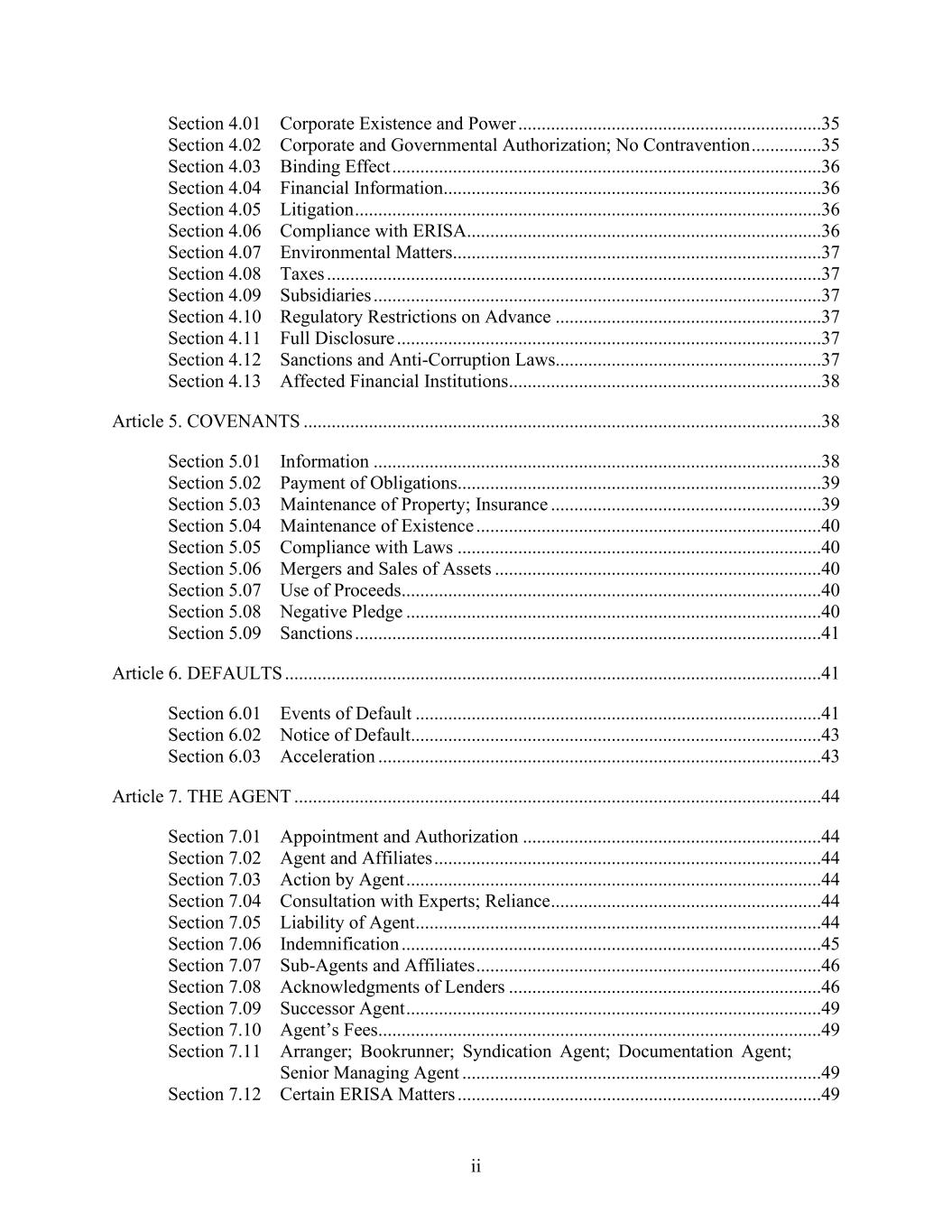 ii Section 4.01 Corporate Existence and Power .................................................................35 Section 4.02 Corporate and Governmental Authorization; No Contravention ...............35 Section 4.03 Binding Effect ............................................................................................36 Section 4.04 Financial Information.................................................................................36 Section 4.05 Litigation ....................................................................................................36 Section 4.06 Compliance with ERISA............................................................................36 Section 4.07 Environmental Matters...............................................................................37 Section 4.08 Taxes ..........................................................................................................37 Section 4.09 Subsidiaries ................................................................................................37 Section 4.10 Regulatory Restrictions on Advance .........................................................37 Section 4.11 Full Disclosure ...........................................................................................37 Section 4.12 Sanctions and Anti-Corruption Laws.........................................................37 Section 4.13 Affected Financial Institutions ...................................................................38 Article 5. COVENANTS ...............................................................................................................38 Section 5.01 Information ................................................................................................38 Section 5.02 Payment of Obligations..............................................................................39 Section 5.03 Maintenance of Property; Insurance ..........................................................39 Section 5.04 Maintenance of Existence ..........................................................................40 Section 5.05 Compliance with Laws ..............................................................................40 Section 5.06 Mergers and Sales of Assets ......................................................................40 Section 5.07 Use of Proceeds..........................................................................................40 Section 5.08 Negative Pledge .........................................................................................40 Section 5.09 Sanctions ....................................................................................................41 Article 6. DEFAULTS ...................................................................................................................41 Section 6.01 Events of Default .......................................................................................41 Section 6.02 Notice of Default........................................................................................43 Section 6.03 Acceleration ...............................................................................................43 Article 7. THE AGENT .................................................................................................................44 Section 7.01 Appointment and Authorization ................................................................44 Section 7.02 Agent and Affiliates ...................................................................................44 Section 7.03 Action by Agent .........................................................................................44 Section 7.04 Consultation with Experts; Reliance ..........................................................44 Section 7.05 Liability of Agent .......................................................................................44 Section 7.06 Indemnification ..........................................................................................45 Section 7.07 Sub-Agents and Affiliates ..........................................................................46 Section 7.08 Acknowledgments of Lenders ...................................................................46 Section 7.09 Successor Agent .........................................................................................49 Section 7.10 Agent’s Fees...............................................................................................49 Section 7.11 Arranger; Bookrunner; Syndication Agent; Documentation Agent; Senior Managing Agent .............................................................................49 Section 7.12 Certain ERISA Matters ..............................................................................49