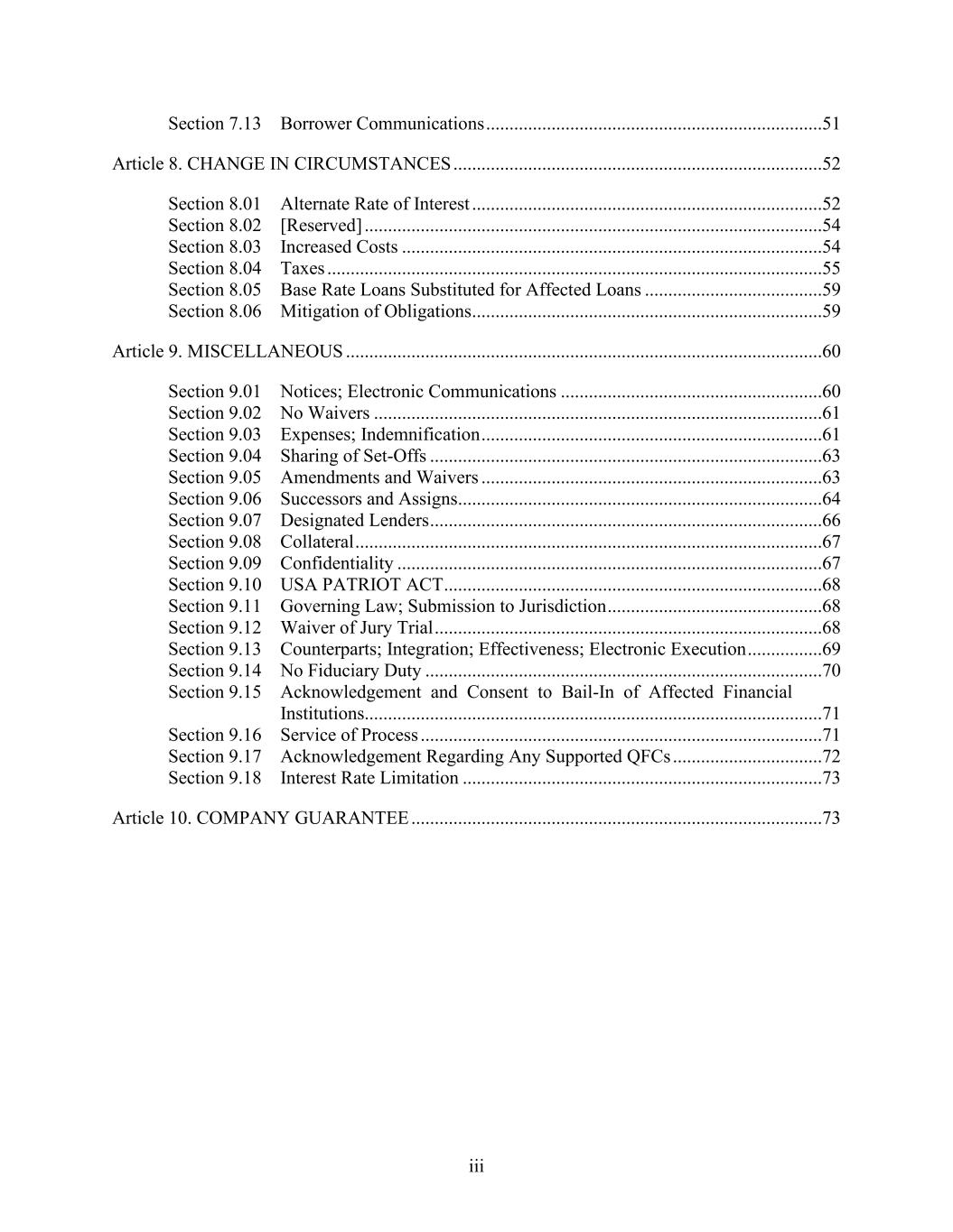 iii Section 7.13 Borrower Communications ........................................................................51 Article 8. CHANGE IN CIRCUMSTANCES ...............................................................................52 Section 8.01 Alternate Rate of Interest ...........................................................................52 Section 8.02 [Reserved] ..................................................................................................54 Section 8.03 Increased Costs ..........................................................................................54 Section 8.04 Taxes ..........................................................................................................55 Section 8.05 Base Rate Loans Substituted for Affected Loans ......................................59 Section 8.06 Mitigation of Obligations ...........................................................................59 Article 9. MISCELLANEOUS ......................................................................................................60 Section 9.01 Notices; Electronic Communications ........................................................60 Section 9.02 No Waivers ................................................................................................61 Section 9.03 Expenses; Indemnification .........................................................................61 Section 9.04 Sharing of Set-Offs ....................................................................................63 Section 9.05 Amendments and Waivers .........................................................................63 Section 9.06 Successors and Assigns..............................................................................64 Section 9.07 Designated Lenders ....................................................................................66 Section 9.08 Collateral ....................................................................................................67 Section 9.09 Confidentiality ...........................................................................................67 Section 9.10 USA PATRIOT ACT .................................................................................68 Section 9.11 Governing Law; Submission to Jurisdiction ..............................................68 Section 9.12 Waiver of Jury Trial ...................................................................................68 Section 9.13 Counterparts; Integration; Effectiveness; Electronic Execution ................69 Section 9.14 No Fiduciary Duty .....................................................................................70 Section 9.15 Acknowledgement and Consent to Bail-In of Affected Financial Institutions..................................................................................................71 Section 9.16 Service of Process ......................................................................................71 Section 9.17 Acknowledgement Regarding Any Supported QFCs ................................72 Section 9.18 Interest Rate Limitation .............................................................................73 Article 10. COMPANY GUARANTEE ........................................................................................73