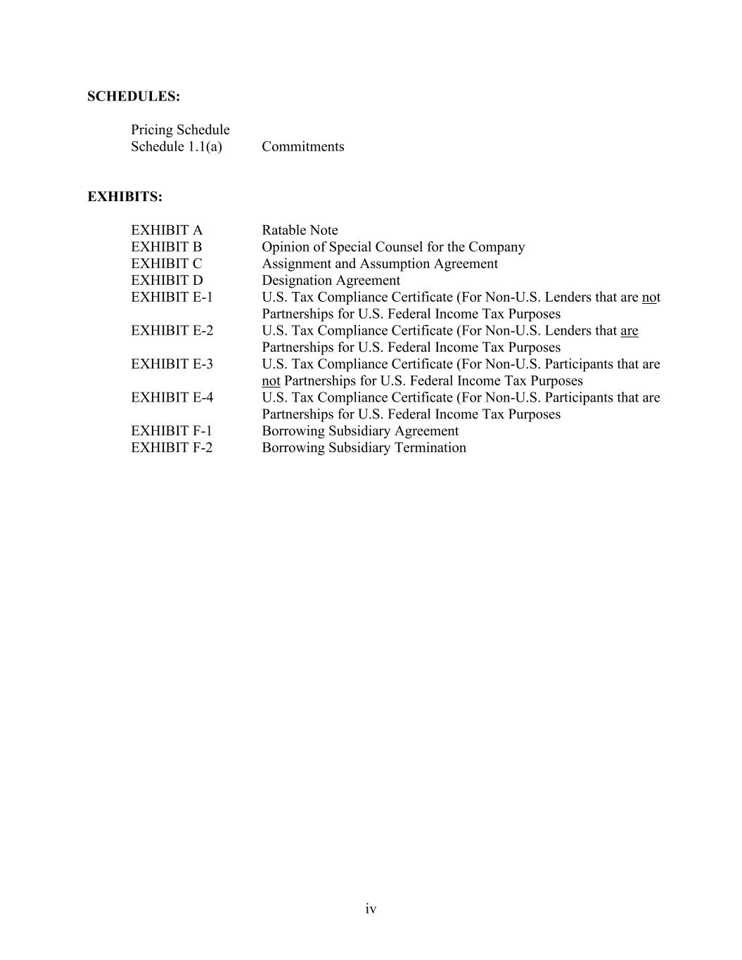 iv SCHEDULES: Pricing Schedule Schedule 1.1(a) Commitments EXHIBITS: EXHIBIT A Ratable Note EXHIBIT B Opinion of Special Counsel for the Company EXHIBIT C Assignment and Assumption Agreement EXHIBIT D Designation Agreement EXHIBIT E-1 U.S. Tax Compliance Certificate (For Non-U.S. Lenders that are not Partnerships for U.S. Federal Income Tax Purposes EXHIBIT E-2 U.S. Tax Compliance Certificate (For Non-U.S. Lenders that are Partnerships for U.S. Federal Income Tax Purposes EXHIBIT E-3 U.S. Tax Compliance Certificate (For Non-U.S. Participants that are not Partnerships for U.S. Federal Income Tax Purposes EXHIBIT E-4 U.S. Tax Compliance Certificate (For Non-U.S. Participants that are Partnerships for U.S. Federal Income Tax Purposes EXHIBIT F-1 Borrowing Subsidiary Agreement EXHIBIT F-2 Borrowing Subsidiary Termination
