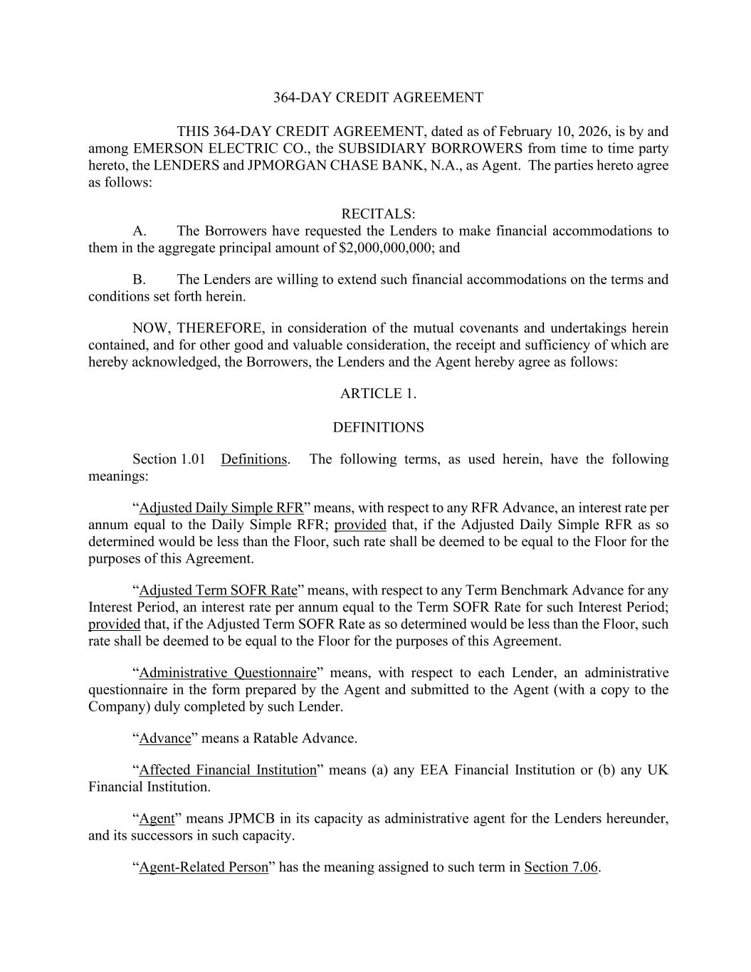 364-DAY CREDIT AGREEMENT THIS 364-DAY CREDIT AGREEMENT, dated as of February 10, 2026, is by and among EMERSON ELECTRIC CO., the SUBSIDIARY BORROWERS from time to time party hereto, the LENDERS and JPMORGAN CHASE BANK, N.A., as Agent. The parties hereto agree as follows: RECITALS: A. The Borrowers have requested the Lenders to make financial accommodations to them in the aggregate principal amount of $2,000,000,000; and B. The Lenders are willing to extend such financial accommodations on the terms and conditions set forth herein. NOW, THEREFORE, in consideration of the mutual covenants and undertakings herein contained, and for other good and valuable consideration, the receipt and sufficiency of which are hereby acknowledged, the Borrowers, the Lenders and the Agent hereby agree as follows: ARTICLE 1. DEFINITIONS Section 1.01 Definitions. The following terms, as used herein, have the following meanings: “Adjusted Daily Simple RFR” means, with respect to any RFR Advance, an interest rate per annum equal to the Daily Simple RFR; provided that, if the Adjusted Daily Simple RFR as so determined would be less than the Floor, such rate shall be deemed to be equal to the Floor for the purposes of this Agreement. “Adjusted Term SOFR Rate” means, with respect to any Term Benchmark Advance for any Interest Period, an interest rate per annum equal to the Term SOFR Rate for such Interest Period; provided that, if the Adjusted Term SOFR Rate as so determined would be less than the Floor, such rate shall be deemed to be equal to the Floor for the purposes of this Agreement. “Administrative Questionnaire” means, with respect to each Lender, an administrative questionnaire in the form prepared by the Agent and submitted to the Agent (with a copy to the Company) duly completed by such Lender. “Advance” means a Ratable Advance. “Affected Financial Institution” means (a) any EEA Financial Institution or (b) any UK Financial Institution. “Agent” means JPMCB in its capacity as administrative agent for the Lenders hereunder, and its successors in such capacity. “Agent-Related Person” has the meaning assigned to such term in Section 7.06.