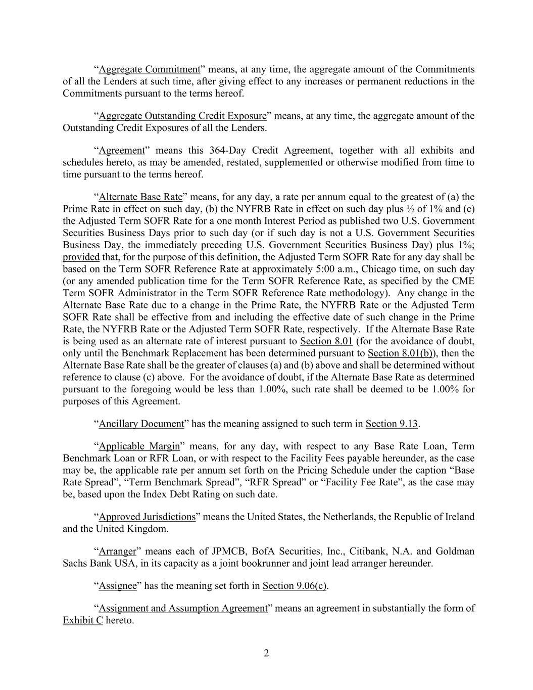 2 “Aggregate Commitment” means, at any time, the aggregate amount of the Commitments of all the Lenders at such time, after giving effect to any increases or permanent reductions in the Commitments pursuant to the terms hereof. “Aggregate Outstanding Credit Exposure” means, at any time, the aggregate amount of the Outstanding Credit Exposures of all the Lenders. “Agreement” means this 364-Day Credit Agreement, together with all exhibits and schedules hereto, as may be amended, restated, supplemented or otherwise modified from time to time pursuant to the terms hereof. “Alternate Base Rate” means, for any day, a rate per annum equal to the greatest of (a) the Prime Rate in effect on such day, (b) the NYFRB Rate in effect on such day plus ½ of 1% and (c) the Adjusted Term SOFR Rate for a one month Interest Period as published two U.S. Government Securities Business Days prior to such day (or if such day is not a U.S. Government Securities Business Day, the immediately preceding U.S. Government Securities Business Day) plus 1%; provided that, for the purpose of this definition, the Adjusted Term SOFR Rate for any day shall be based on the Term SOFR Reference Rate at approximately 5:00 a.m., Chicago time, on such day (or any amended publication time for the Term SOFR Reference Rate, as specified by the CME Term SOFR Administrator in the Term SOFR Reference Rate methodology). Any change in the Alternate Base Rate due to a change in the Prime Rate, the NYFRB Rate or the Adjusted Term SOFR Rate shall be effective from and including the effective date of such change in the Prime Rate, the NYFRB Rate or the Adjusted Term SOFR Rate, respectively. If the Alternate Base Rate is being used as an alternate rate of interest pursuant to Section 8.01 (for the avoidance of doubt, only until the Benchmark Replacement has been determined pursuant to Section 8.01(b)), then the Alternate Base Rate shall be the greater of clauses (a) and (b) above and shall be determined without reference to clause (c) above. For the avoidance of doubt, if the Alternate Base Rate as determined pursuant to the foregoing would be less than 1.00%, such rate shall be deemed to be 1.00% for purposes of this Agreement. “Ancillary Document” has the meaning assigned to such term in Section 9.13. “Applicable Margin” means, for any day, with respect to any Base Rate Loan, Term Benchmark Loan or RFR Loan, or with respect to the Facility Fees payable hereunder, as the case may be, the applicable rate per annum set forth on the Pricing Schedule under the caption “Base Rate Spread”, “Term Benchmark Spread”, “RFR Spread” or “Facility Fee Rate”, as the case may be, based upon the Index Debt Rating on such date. “Approved Jurisdictions” means the United States, the Netherlands, the Republic of Ireland and the United Kingdom. “Arranger” means each of JPMCB, BofA Securities, Inc., Citibank, N.A. and Goldman Sachs Bank USA, in its capacity as a joint bookrunner and joint lead arranger hereunder. “Assignee” has the meaning set forth in Section 9.06(c). “Assignment and Assumption Agreement” means an agreement in substantially the form of Exhibit C hereto.
