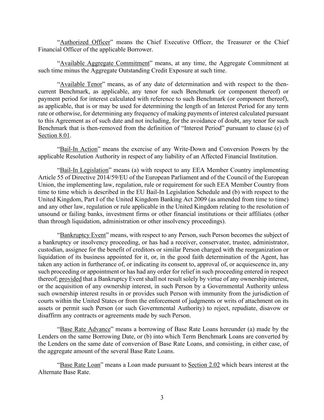 3 “Authorized Officer” means the Chief Executive Officer, the Treasurer or the Chief Financial Officer of the applicable Borrower. “Available Aggregate Commitment” means, at any time, the Aggregate Commitment at such time minus the Aggregate Outstanding Credit Exposure at such time. “Available Tenor” means, as of any date of determination and with respect to the then- current Benchmark, as applicable, any tenor for such Benchmark (or component thereof) or payment period for interest calculated with reference to such Benchmark (or component thereof), as applicable, that is or may be used for determining the length of an Interest Period for any term rate or otherwise, for determining any frequency of making payments of interest calculated pursuant to this Agreement as of such date and not including, for the avoidance of doubt, any tenor for such Benchmark that is then-removed from the definition of “Interest Period” pursuant to clause (e) of Section 8.01. “Bail-In Action” means the exercise of any Write-Down and Conversion Powers by the applicable Resolution Authority in respect of any liability of an Affected Financial Institution. “Bail-In Legislation” means (a) with respect to any EEA Member Country implementing Article 55 of Directive 2014/59/EU of the European Parliament and of the Council of the European Union, the implementing law, regulation, rule or requirement for such EEA Member Country from time to time which is described in the EU Bail-In Legislation Schedule and (b) with respect to the United Kingdom, Part I of the United Kingdom Banking Act 2009 (as amended from time to time) and any other law, regulation or rule applicable in the United Kingdom relating to the resolution of unsound or failing banks, investment firms or other financial institutions or their affiliates (other than through liquidation, administration or other insolvency proceedings). “Bankruptcy Event” means, with respect to any Person, such Person becomes the subject of a bankruptcy or insolvency proceeding, or has had a receiver, conservator, trustee, administrator, custodian, assignee for the benefit of creditors or similar Person charged with the reorganization or liquidation of its business appointed for it, or, in the good faith determination of the Agent, has taken any action in furtherance of, or indicating its consent to, approval of, or acquiescence in, any such proceeding or appointment or has had any order for relief in such proceeding entered in respect thereof; provided that a Bankruptcy Event shall not result solely by virtue of any ownership interest, or the acquisition of any ownership interest, in such Person by a Governmental Authority unless such ownership interest results in or provides such Person with immunity from the jurisdiction of courts within the United States or from the enforcement of judgments or writs of attachment on its assets or permit such Person (or such Governmental Authority) to reject, repudiate, disavow or disaffirm any contracts or agreements made by such Person. “Base Rate Advance” means a borrowing of Base Rate Loans hereunder (a) made by the Lenders on the same Borrowing Date, or (b) into which Term Benchmark Loans are converted by the Lenders on the same date of conversion of Base Rate Loans, and consisting, in either case, of the aggregate amount of the several Base Rate Loans. “Base Rate Loan” means a Loan made pursuant to Section 2.02 which bears interest at the Alternate Base Rate.