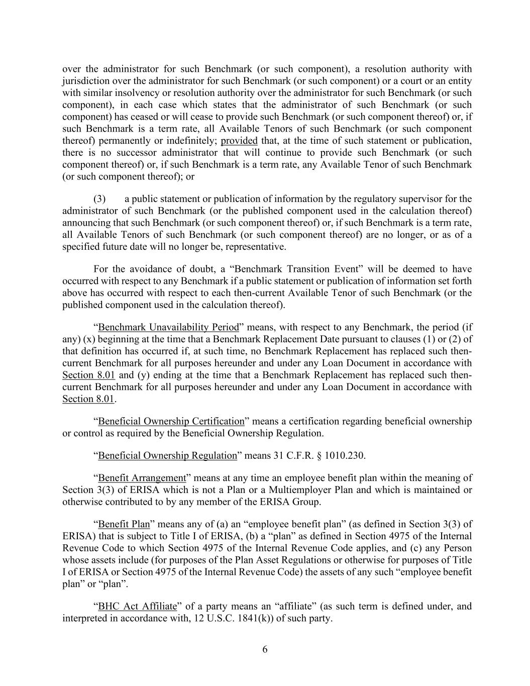 6 over the administrator for such Benchmark (or such component), a resolution authority with jurisdiction over the administrator for such Benchmark (or such component) or a court or an entity with similar insolvency or resolution authority over the administrator for such Benchmark (or such component), in each case which states that the administrator of such Benchmark (or such component) has ceased or will cease to provide such Benchmark (or such component thereof) or, if such Benchmark is a term rate, all Available Tenors of such Benchmark (or such component thereof) permanently or indefinitely; provided that, at the time of such statement or publication, there is no successor administrator that will continue to provide such Benchmark (or such component thereof) or, if such Benchmark is a term rate, any Available Tenor of such Benchmark (or such component thereof); or (3) a public statement or publication of information by the regulatory supervisor for the administrator of such Benchmark (or the published component used in the calculation thereof) announcing that such Benchmark (or such component thereof) or, if such Benchmark is a term rate, all Available Tenors of such Benchmark (or such component thereof) are no longer, or as of a specified future date will no longer be, representative. For the avoidance of doubt, a “Benchmark Transition Event” will be deemed to have occurred with respect to any Benchmark if a public statement or publication of information set forth above has occurred with respect to each then-current Available Tenor of such Benchmark (or the published component used in the calculation thereof). “Benchmark Unavailability Period” means, with respect to any Benchmark, the period (if any) (x) beginning at the time that a Benchmark Replacement Date pursuant to clauses (1) or (2) of that definition has occurred if, at such time, no Benchmark Replacement has replaced such then- current Benchmark for all purposes hereunder and under any Loan Document in accordance with Section 8.01 and (y) ending at the time that a Benchmark Replacement has replaced such then- current Benchmark for all purposes hereunder and under any Loan Document in accordance with Section 8.01. “Beneficial Ownership Certification” means a certification regarding beneficial ownership or control as required by the Beneficial Ownership Regulation. “Beneficial Ownership Regulation” means 31 C.F.R. § 1010.230. “Benefit Arrangement” means at any time an employee benefit plan within the meaning of Section 3(3) of ERISA which is not a Plan or a Multiemployer Plan and which is maintained or otherwise contributed to by any member of the ERISA Group. “Benefit Plan” means any of (a) an “employee benefit plan” (as defined in Section 3(3) of ERISA) that is subject to Title I of ERISA, (b) a “plan” as defined in Section 4975 of the Internal Revenue Code to which Section 4975 of the Internal Revenue Code applies, and (c) any Person whose assets include (for purposes of the Plan Asset Regulations or otherwise for purposes of Title I of ERISA or Section 4975 of the Internal Revenue Code) the assets of any such “employee benefit plan” or “plan”. “BHC Act Affiliate” of a party means an “affiliate” (as such term is defined under, and interpreted in accordance with, 12 U.S.C. 1841(k)) of such party.