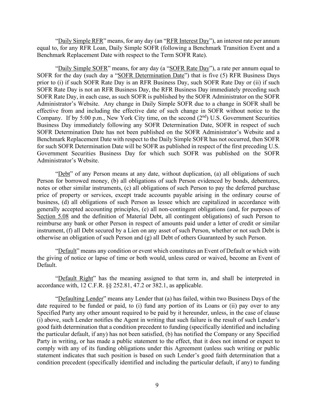 9 “Daily Simple RFR” means, for any day (an “RFR Interest Day”), an interest rate per annum equal to, for any RFR Loan, Daily Simple SOFR (following a Benchmark Transition Event and a Benchmark Replacement Date with respect to the Term SOFR Rate). “Daily Simple SOFR” means, for any day (a “SOFR Rate Day”), a rate per annum equal to SOFR for the day (such day a “SOFR Determination Date”) that is five (5) RFR Business Days prior to (i) if such SOFR Rate Day is an RFR Business Day, such SOFR Rate Day or (ii) if such SOFR Rate Day is not an RFR Business Day, the RFR Business Day immediately preceding such SOFR Rate Day, in each case, as such SOFR is published by the SOFR Administrator on the SOFR Administrator’s Website. Any change in Daily Simple SOFR due to a change in SOFR shall be effective from and including the effective date of such change in SOFR without notice to the Company. If by 5:00 p.m., New York City time, on the second (2nd) U.S. Government Securities Business Day immediately following any SOFR Determination Date, SOFR in respect of such SOFR Determination Date has not been published on the SOFR Administrator’s Website and a Benchmark Replacement Date with respect to the Daily Simple SOFR has not occurred, then SOFR for such SOFR Determination Date will be SOFR as published in respect of the first preceding U.S. Government Securities Business Day for which such SOFR was published on the SOFR Administrator’s Website. “Debt” of any Person means at any date, without duplication, (a) all obligations of such Person for borrowed money, (b) all obligations of such Person evidenced by bonds, debentures, notes or other similar instruments, (c) all obligations of such Person to pay the deferred purchase price of property or services, except trade accounts payable arising in the ordinary course of business, (d) all obligations of such Person as lessee which are capitalized in accordance with generally accepted accounting principles, (e) all non-contingent obligations (and, for purposes of Section 5.08 and the definition of Material Debt, all contingent obligations) of such Person to reimburse any bank or other Person in respect of amounts paid under a letter of credit or similar instrument, (f) all Debt secured by a Lien on any asset of such Person, whether or not such Debt is otherwise an obligation of such Person and (g) all Debt of others Guaranteed by such Person. “Default” means any condition or event which constitutes an Event of Default or which with the giving of notice or lapse of time or both would, unless cured or waived, become an Event of Default. “Default Right” has the meaning assigned to that term in, and shall be interpreted in accordance with, 12 C.F.R. §§ 252.81, 47.2 or 382.1, as applicable. “Defaulting Lender” means any Lender that (a) has failed, within two Business Days of the date required to be funded or paid, to (i) fund any portion of its Loans or (ii) pay over to any Specified Party any other amount required to be paid by it hereunder, unless, in the case of clause (i) above, such Lender notifies the Agent in writing that such failure is the result of such Lender’s good faith determination that a condition precedent to funding (specifically identified and including the particular default, if any) has not been satisfied, (b) has notified the Company or any Specified Party in writing, or has made a public statement to the effect, that it does not intend or expect to comply with any of its funding obligations under this Agreement (unless such writing or public statement indicates that such position is based on such Lender’s good faith determination that a condition precedent (specifically identified and including the particular default, if any) to funding
