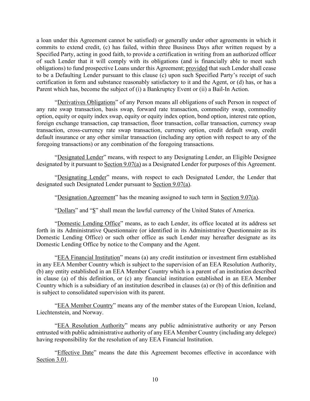 10 a loan under this Agreement cannot be satisfied) or generally under other agreements in which it commits to extend credit, (c) has failed, within three Business Days after written request by a Specified Party, acting in good faith, to provide a certification in writing from an authorized officer of such Lender that it will comply with its obligations (and is financially able to meet such obligations) to fund prospective Loans under this Agreement; provided that such Lender shall cease to be a Defaulting Lender pursuant to this clause (c) upon such Specified Party’s receipt of such certification in form and substance reasonably satisfactory to it and the Agent, or (d) has, or has a Parent which has, become the subject of (i) a Bankruptcy Event or (ii) a Bail-In Action. “Derivatives Obligations” of any Person means all obligations of such Person in respect of any rate swap transaction, basis swap, forward rate transaction, commodity swap, commodity option, equity or equity index swap, equity or equity index option, bond option, interest rate option, foreign exchange transaction, cap transaction, floor transaction, collar transaction, currency swap transaction, cross-currency rate swap transaction, currency option, credit default swap, credit default insurance or any other similar transaction (including any option with respect to any of the foregoing transactions) or any combination of the foregoing transactions. “Designated Lender” means, with respect to any Designating Lender, an Eligible Designee designated by it pursuant to Section 9.07(a) as a Designated Lender for purposes of this Agreement. “Designating Lender” means, with respect to each Designated Lender, the Lender that designated such Designated Lender pursuant to Section 9.07(a). “Designation Agreement” has the meaning assigned to such term in Section 9.07(a). “Dollars” and “$” shall mean the lawful currency of the United States of America. “Domestic Lending Office” means, as to each Lender, its office located at its address set forth in its Administrative Questionnaire (or identified in its Administrative Questionnaire as its Domestic Lending Office) or such other office as such Lender may hereafter designate as its Domestic Lending Office by notice to the Company and the Agent. “EEA Financial Institution” means (a) any credit institution or investment firm established in any EEA Member Country which is subject to the supervision of an EEA Resolution Authority, (b) any entity established in an EEA Member Country which is a parent of an institution described in clause (a) of this definition, or (c) any financial institution established in an EEA Member Country which is a subsidiary of an institution described in clauses (a) or (b) of this definition and is subject to consolidated supervision with its parent. “EEA Member Country” means any of the member states of the European Union, Iceland, Liechtenstein, and Norway. “EEA Resolution Authority” means any public administrative authority or any Person entrusted with public administrative authority of any EEA Member Country (including any delegee) having responsibility for the resolution of any EEA Financial Institution. “Effective Date” means the date this Agreement becomes effective in accordance with Section 3.01.