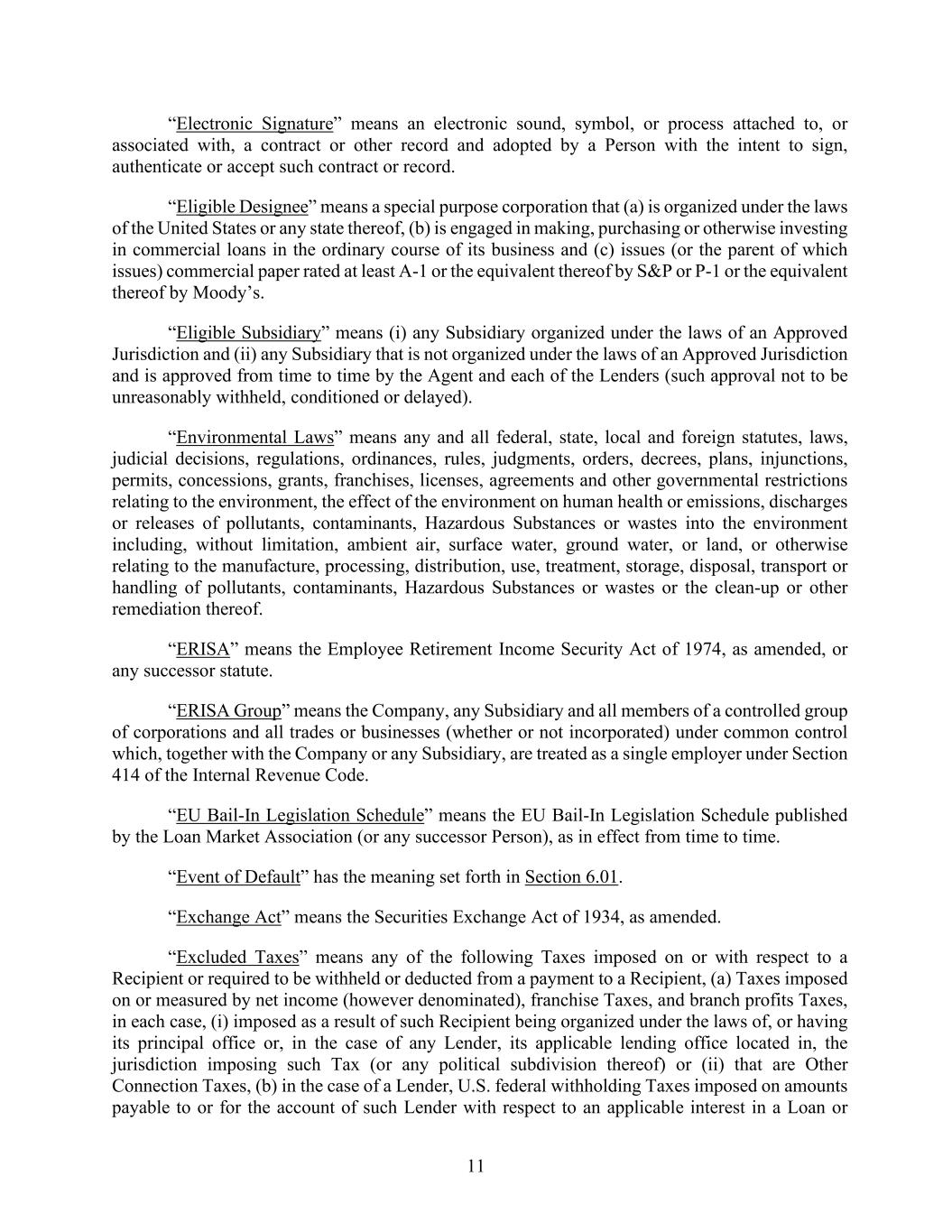 11 “Electronic Signature” means an electronic sound, symbol, or process attached to, or associated with, a contract or other record and adopted by a Person with the intent to sign, authenticate or accept such contract or record. “Eligible Designee” means a special purpose corporation that (a) is organized under the laws of the United States or any state thereof, (b) is engaged in making, purchasing or otherwise investing in commercial loans in the ordinary course of its business and (c) issues (or the parent of which issues) commercial paper rated at least A-1 or the equivalent thereof by S&P or P-1 or the equivalent thereof by Moody’s. “Eligible Subsidiary” means (i) any Subsidiary organized under the laws of an Approved Jurisdiction and (ii) any Subsidiary that is not organized under the laws of an Approved Jurisdiction and is approved from time to time by the Agent and each of the Lenders (such approval not to be unreasonably withheld, conditioned or delayed). “Environmental Laws” means any and all federal, state, local and foreign statutes, laws, judicial decisions, regulations, ordinances, rules, judgments, orders, decrees, plans, injunctions, permits, concessions, grants, franchises, licenses, agreements and other governmental restrictions relating to the environment, the effect of the environment on human health or emissions, discharges or releases of pollutants, contaminants, Hazardous Substances or wastes into the environment including, without limitation, ambient air, surface water, ground water, or land, or otherwise relating to the manufacture, processing, distribution, use, treatment, storage, disposal, transport or handling of pollutants, contaminants, Hazardous Substances or wastes or the clean-up or other remediation thereof. “ERISA” means the Employee Retirement Income Security Act of 1974, as amended, or any successor statute. “ERISA Group” means the Company, any Subsidiary and all members of a controlled group of corporations and all trades or businesses (whether or not incorporated) under common control which, together with the Company or any Subsidiary, are treated as a single employer under Section 414 of the Internal Revenue Code. “EU Bail-In Legislation Schedule” means the EU Bail-In Legislation Schedule published by the Loan Market Association (or any successor Person), as in effect from time to time. “Event of Default” has the meaning set forth in Section 6.01. “Exchange Act” means the Securities Exchange Act of 1934, as amended. “Excluded Taxes” means any of the following Taxes imposed on or with respect to a Recipient or required to be withheld or deducted from a payment to a Recipient, (a) Taxes imposed on or measured by net income (however denominated), franchise Taxes, and branch profits Taxes, in each case, (i) imposed as a result of such Recipient being organized under the laws of, or having its principal office or, in the case of any Lender, its applicable lending office located in, the jurisdiction imposing such Tax (or any political subdivision thereof) or (ii) that are Other Connection Taxes, (b) in the case of a Lender, U.S. federal withholding Taxes imposed on amounts payable to or for the account of such Lender with respect to an applicable interest in a Loan or