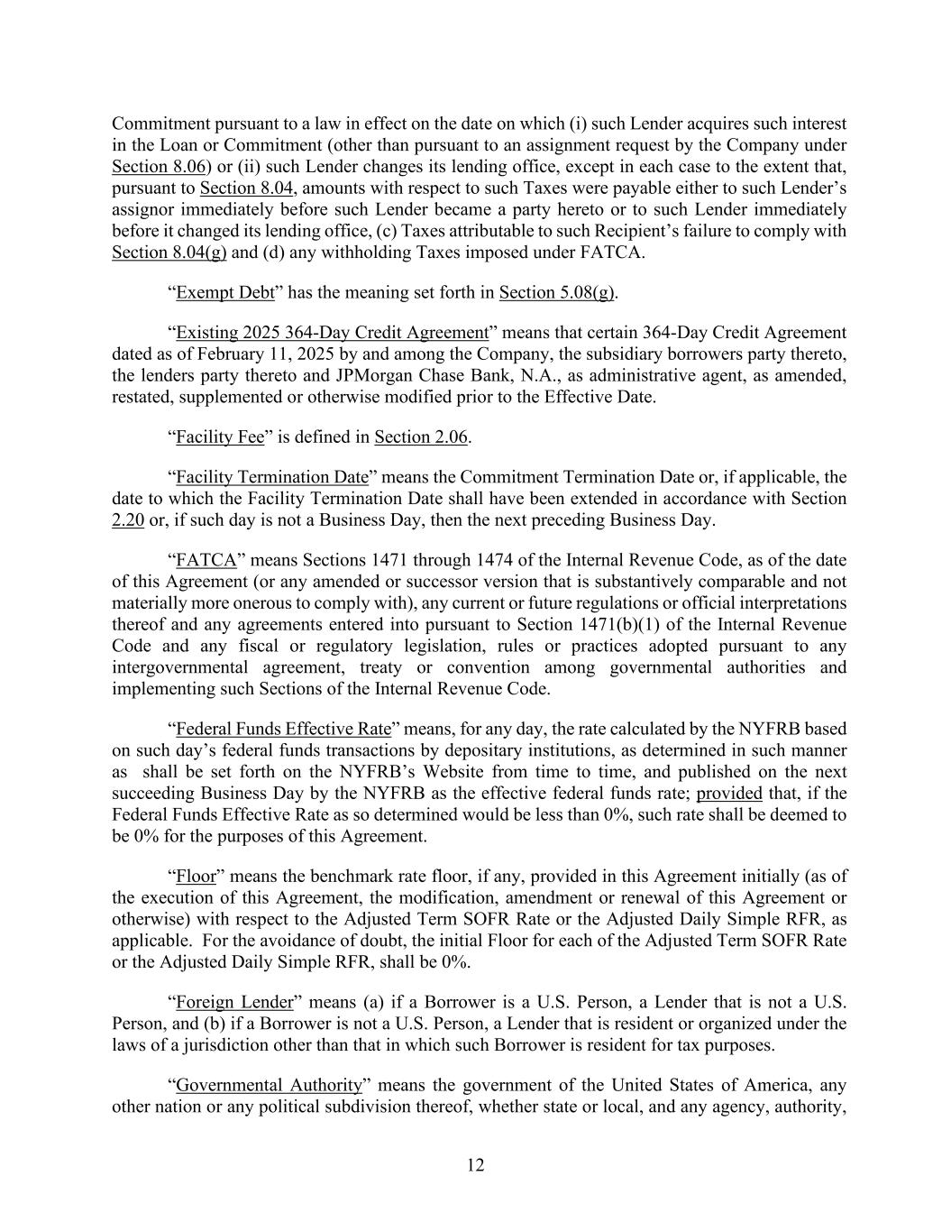 12 Commitment pursuant to a law in effect on the date on which (i) such Lender acquires such interest in the Loan or Commitment (other than pursuant to an assignment request by the Company under Section 8.06) or (ii) such Lender changes its lending office, except in each case to the extent that, pursuant to Section 8.04, amounts with respect to such Taxes were payable either to such Lender’s assignor immediately before such Lender became a party hereto or to such Lender immediately before it changed its lending office, (c) Taxes attributable to such Recipient’s failure to comply with Section 8.04(g) and (d) any withholding Taxes imposed under FATCA. “Exempt Debt” has the meaning set forth in Section 5.08(g). “Existing 2025 364-Day Credit Agreement” means that certain 364-Day Credit Agreement dated as of February 11, 2025 by and among the Company, the subsidiary borrowers party thereto, the lenders party thereto and JPMorgan Chase Bank, N.A., as administrative agent, as amended, restated, supplemented or otherwise modified prior to the Effective Date. “Facility Fee” is defined in Section 2.06. “Facility Termination Date” means the Commitment Termination Date or, if applicable, the date to which the Facility Termination Date shall have been extended in accordance with Section 2.20 or, if such day is not a Business Day, then the next preceding Business Day. “FATCA” means Sections 1471 through 1474 of the Internal Revenue Code, as of the date of this Agreement (or any amended or successor version that is substantively comparable and not materially more onerous to comply with), any current or future regulations or official interpretations thereof and any agreements entered into pursuant to Section 1471(b)(1) of the Internal Revenue Code and any fiscal or regulatory legislation, rules or practices adopted pursuant to any intergovernmental agreement, treaty or convention among governmental authorities and implementing such Sections of the Internal Revenue Code. “Federal Funds Effective Rate” means, for any day, the rate calculated by the NYFRB based on such day’s federal funds transactions by depositary institutions, as determined in such manner as shall be set forth on the NYFRB’s Website from time to time, and published on the next succeeding Business Day by the NYFRB as the effective federal funds rate; provided that, if the Federal Funds Effective Rate as so determined would be less than 0%, such rate shall be deemed to be 0% for the purposes of this Agreement. “Floor” means the benchmark rate floor, if any, provided in this Agreement initially (as of the execution of this Agreement, the modification, amendment or renewal of this Agreement or otherwise) with respect to the Adjusted Term SOFR Rate or the Adjusted Daily Simple RFR, as applicable. For the avoidance of doubt, the initial Floor for each of the Adjusted Term SOFR Rate or the Adjusted Daily Simple RFR, shall be 0%. “Foreign Lender” means (a) if a Borrower is a U.S. Person, a Lender that is not a U.S. Person, and (b) if a Borrower is not a U.S. Person, a Lender that is resident or organized under the laws of a jurisdiction other than that in which such Borrower is resident for tax purposes. “Governmental Authority” means the government of the United States of America, any other nation or any political subdivision thereof, whether state or local, and any agency, authority,