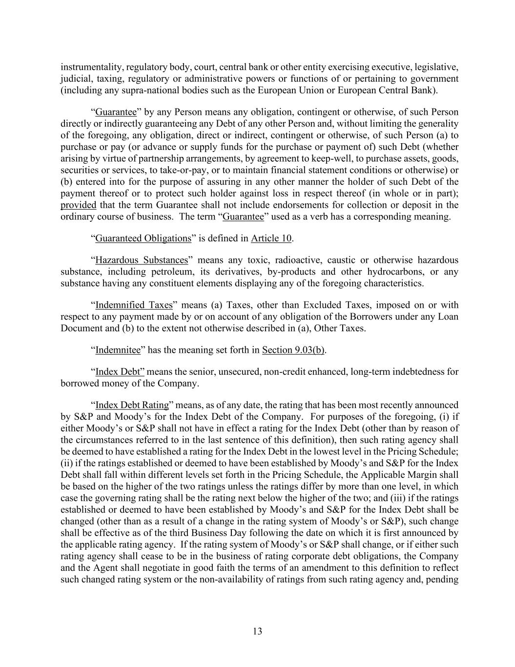 13 instrumentality, regulatory body, court, central bank or other entity exercising executive, legislative, judicial, taxing, regulatory or administrative powers or functions of or pertaining to government (including any supra-national bodies such as the European Union or European Central Bank). “Guarantee” by any Person means any obligation, contingent or otherwise, of such Person directly or indirectly guaranteeing any Debt of any other Person and, without limiting the generality of the foregoing, any obligation, direct or indirect, contingent or otherwise, of such Person (a) to purchase or pay (or advance or supply funds for the purchase or payment of) such Debt (whether arising by virtue of partnership arrangements, by agreement to keep-well, to purchase assets, goods, securities or services, to take-or-pay, or to maintain financial statement conditions or otherwise) or (b) entered into for the purpose of assuring in any other manner the holder of such Debt of the payment thereof or to protect such holder against loss in respect thereof (in whole or in part); provided that the term Guarantee shall not include endorsements for collection or deposit in the ordinary course of business. The term “Guarantee” used as a verb has a corresponding meaning. “Guaranteed Obligations” is defined in Article 10. “Hazardous Substances” means any toxic, radioactive, caustic or otherwise hazardous substance, including petroleum, its derivatives, by-products and other hydrocarbons, or any substance having any constituent elements displaying any of the foregoing characteristics. “Indemnified Taxes” means (a) Taxes, other than Excluded Taxes, imposed on or with respect to any payment made by or on account of any obligation of the Borrowers under any Loan Document and (b) to the extent not otherwise described in (a), Other Taxes. “Indemnitee” has the meaning set forth in Section 9.03(b). “Index Debt” means the senior, unsecured, non-credit enhanced, long-term indebtedness for borrowed money of the Company. “Index Debt Rating” means, as of any date, the rating that has been most recently announced by S&P and Moody’s for the Index Debt of the Company. For purposes of the foregoing, (i) if either Moody’s or S&P shall not have in effect a rating for the Index Debt (other than by reason of the circumstances referred to in the last sentence of this definition), then such rating agency shall be deemed to have established a rating for the Index Debt in the lowest level in the Pricing Schedule; (ii) if the ratings established or deemed to have been established by Moody’s and S&P for the Index Debt shall fall within different levels set forth in the Pricing Schedule, the Applicable Margin shall be based on the higher of the two ratings unless the ratings differ by more than one level, in which case the governing rating shall be the rating next below the higher of the two; and (iii) if the ratings established or deemed to have been established by Moody’s and S&P for the Index Debt shall be changed (other than as a result of a change in the rating system of Moody’s or S&P), such change shall be effective as of the third Business Day following the date on which it is first announced by the applicable rating agency. If the rating system of Moody’s or S&P shall change, or if either such rating agency shall cease to be in the business of rating corporate debt obligations, the Company and the Agent shall negotiate in good faith the terms of an amendment to this definition to reflect such changed rating system or the non-availability of ratings from such rating agency and, pending