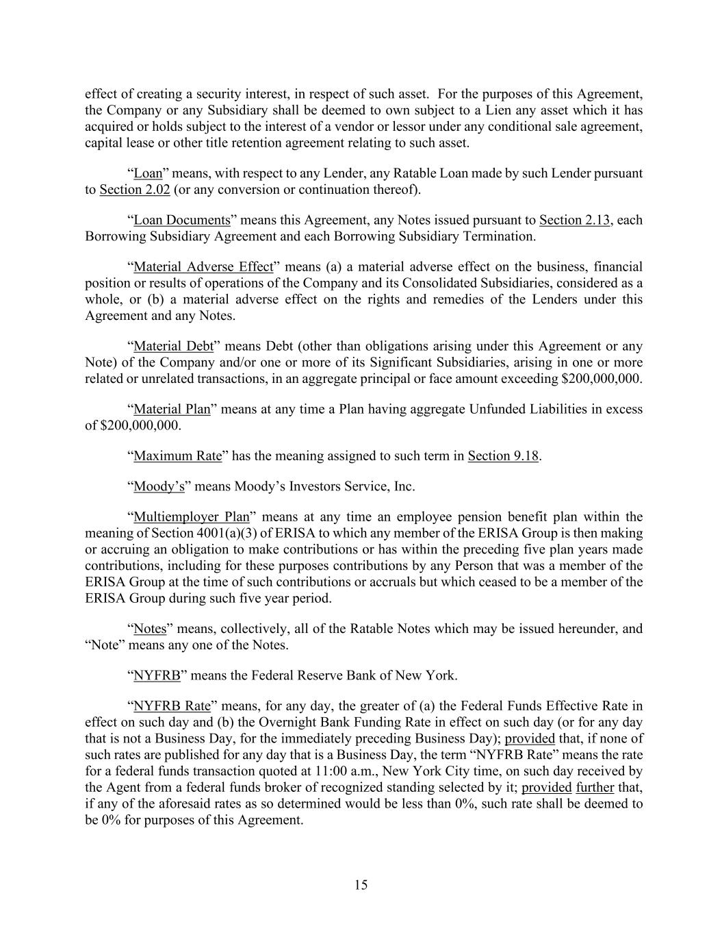 15 effect of creating a security interest, in respect of such asset. For the purposes of this Agreement, the Company or any Subsidiary shall be deemed to own subject to a Lien any asset which it has acquired or holds subject to the interest of a vendor or lessor under any conditional sale agreement, capital lease or other title retention agreement relating to such asset. “Loan” means, with respect to any Lender, any Ratable Loan made by such Lender pursuant to Section 2.02 (or any conversion or continuation thereof). “Loan Documents” means this Agreement, any Notes issued pursuant to Section 2.13, each Borrowing Subsidiary Agreement and each Borrowing Subsidiary Termination. “Material Adverse Effect” means (a) a material adverse effect on the business, financial position or results of operations of the Company and its Consolidated Subsidiaries, considered as a whole, or (b) a material adverse effect on the rights and remedies of the Lenders under this Agreement and any Notes. “Material Debt” means Debt (other than obligations arising under this Agreement or any Note) of the Company and/or one or more of its Significant Subsidiaries, arising in one or more related or unrelated transactions, in an aggregate principal or face amount exceeding $200,000,000. “Material Plan” means at any time a Plan having aggregate Unfunded Liabilities in excess of $200,000,000. “Maximum Rate” has the meaning assigned to such term in Section 9.18. “Moody’s” means Moody’s Investors Service, Inc. “Multiemployer Plan” means at any time an employee pension benefit plan within the meaning of Section 4001(a)(3) of ERISA to which any member of the ERISA Group is then making or accruing an obligation to make contributions or has within the preceding five plan years made contributions, including for these purposes contributions by any Person that was a member of the ERISA Group at the time of such contributions or accruals but which ceased to be a member of the ERISA Group during such five year period. “Notes” means, collectively, all of the Ratable Notes which may be issued hereunder, and “Note” means any one of the Notes. “NYFRB” means the Federal Reserve Bank of New York. “NYFRB Rate” means, for any day, the greater of (a) the Federal Funds Effective Rate in effect on such day and (b) the Overnight Bank Funding Rate in effect on such day (or for any day that is not a Business Day, for the immediately preceding Business Day); provided that, if none of such rates are published for any day that is a Business Day, the term “NYFRB Rate” means the rate for a federal funds transaction quoted at 11:00 a.m., New York City time, on such day received by the Agent from a federal funds broker of recognized standing selected by it; provided further that, if any of the aforesaid rates as so determined would be less than 0%, such rate shall be deemed to be 0% for purposes of this Agreement.