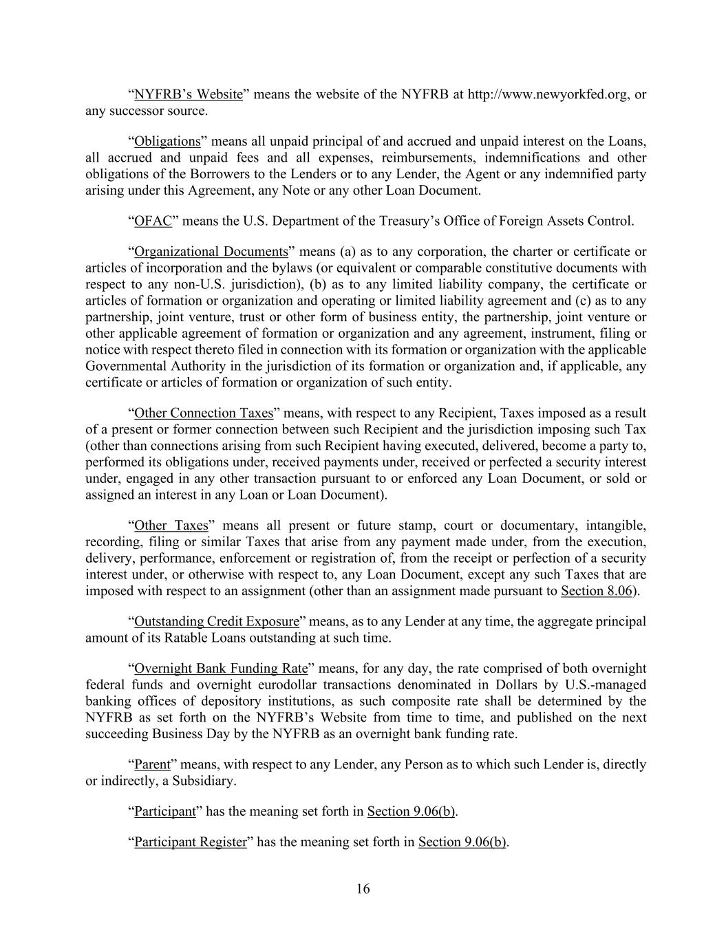 16 “NYFRB’s Website” means the website of the NYFRB at http://www.newyorkfed.org, or any successor source. “Obligations” means all unpaid principal of and accrued and unpaid interest on the Loans, all accrued and unpaid fees and all expenses, reimbursements, indemnifications and other obligations of the Borrowers to the Lenders or to any Lender, the Agent or any indemnified party arising under this Agreement, any Note or any other Loan Document. “OFAC” means the U.S. Department of the Treasury’s Office of Foreign Assets Control. “Organizational Documents” means (a) as to any corporation, the charter or certificate or articles of incorporation and the bylaws (or equivalent or comparable constitutive documents with respect to any non-U.S. jurisdiction), (b) as to any limited liability company, the certificate or articles of formation or organization and operating or limited liability agreement and (c) as to any partnership, joint venture, trust or other form of business entity, the partnership, joint venture or other applicable agreement of formation or organization and any agreement, instrument, filing or notice with respect thereto filed in connection with its formation or organization with the applicable Governmental Authority in the jurisdiction of its formation or organization and, if applicable, any certificate or articles of formation or organization of such entity. “Other Connection Taxes” means, with respect to any Recipient, Taxes imposed as a result of a present or former connection between such Recipient and the jurisdiction imposing such Tax (other than connections arising from such Recipient having executed, delivered, become a party to, performed its obligations under, received payments under, received or perfected a security interest under, engaged in any other transaction pursuant to or enforced any Loan Document, or sold or assigned an interest in any Loan or Loan Document). “Other Taxes” means all present or future stamp, court or documentary, intangible, recording, filing or similar Taxes that arise from any payment made under, from the execution, delivery, performance, enforcement or registration of, from the receipt or perfection of a security interest under, or otherwise with respect to, any Loan Document, except any such Taxes that are imposed with respect to an assignment (other than an assignment made pursuant to Section 8.06). “Outstanding Credit Exposure” means, as to any Lender at any time, the aggregate principal amount of its Ratable Loans outstanding at such time. “Overnight Bank Funding Rate” means, for any day, the rate comprised of both overnight federal funds and overnight eurodollar transactions denominated in Dollars by U.S.-managed banking offices of depository institutions, as such composite rate shall be determined by the NYFRB as set forth on the NYFRB’s Website from time to time, and published on the next succeeding Business Day by the NYFRB as an overnight bank funding rate. “Parent” means, with respect to any Lender, any Person as to which such Lender is, directly or indirectly, a Subsidiary. “Participant” has the meaning set forth in Section 9.06(b). “Participant Register” has the meaning set forth in Section 9.06(b).