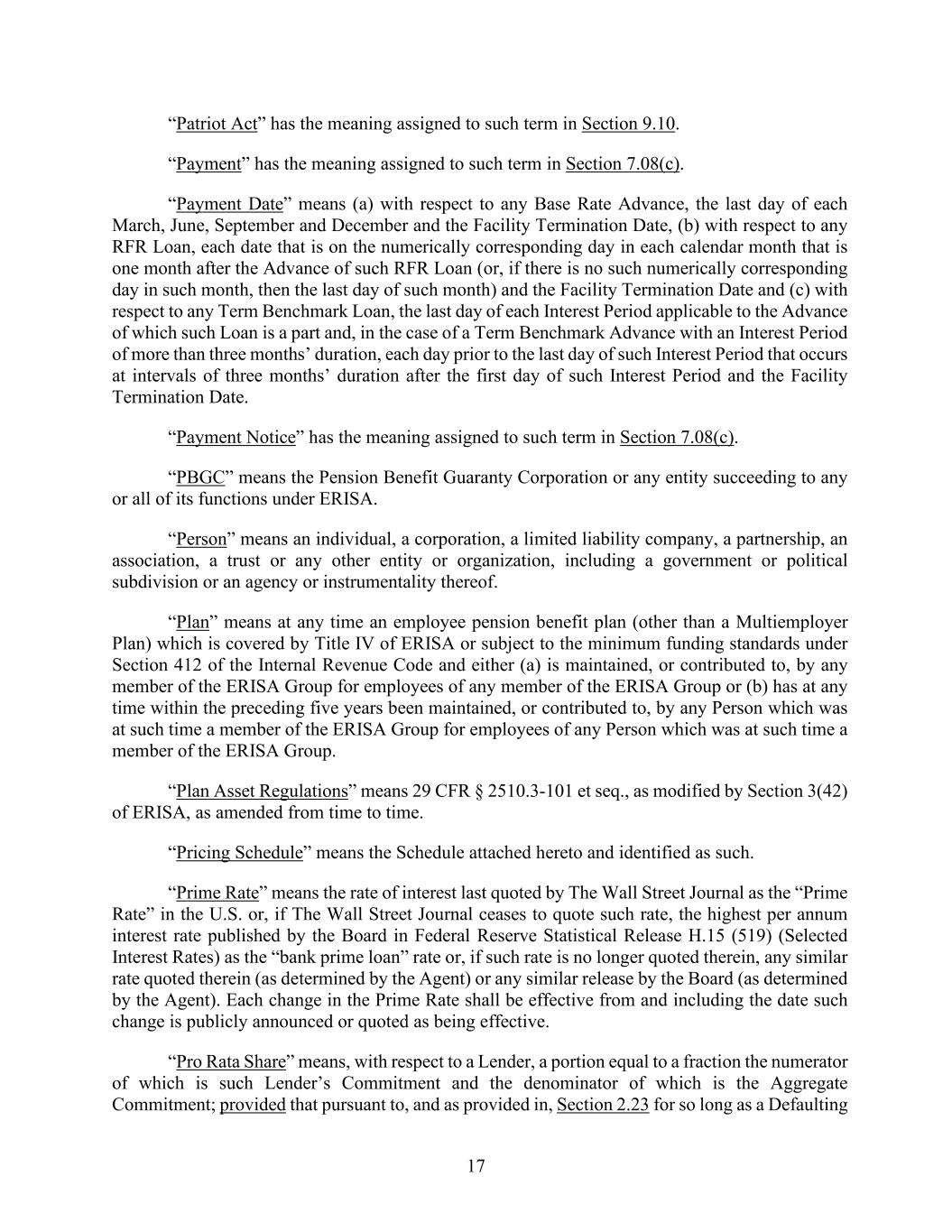 17 “Patriot Act” has the meaning assigned to such term in Section 9.10. “Payment” has the meaning assigned to such term in Section 7.08(c). “Payment Date” means (a) with respect to any Base Rate Advance, the last day of each March, June, September and December and the Facility Termination Date, (b) with respect to any RFR Loan, each date that is on the numerically corresponding day in each calendar month that is one month after the Advance of such RFR Loan (or, if there is no such numerically corresponding day in such month, then the last day of such month) and the Facility Termination Date and (c) with respect to any Term Benchmark Loan, the last day of each Interest Period applicable to the Advance of which such Loan is a part and, in the case of a Term Benchmark Advance with an Interest Period of more than three months’ duration, each day prior to the last day of such Interest Period that occurs at intervals of three months’ duration after the first day of such Interest Period and the Facility Termination Date. “Payment Notice” has the meaning assigned to such term in Section 7.08(c). “PBGC” means the Pension Benefit Guaranty Corporation or any entity succeeding to any or all of its functions under ERISA. “Person” means an individual, a corporation, a limited liability company, a partnership, an association, a trust or any other entity or organization, including a government or political subdivision or an agency or instrumentality thereof. “Plan” means at any time an employee pension benefit plan (other than a Multiemployer Plan) which is covered by Title IV of ERISA or subject to the minimum funding standards under Section 412 of the Internal Revenue Code and either (a) is maintained, or contributed to, by any member of the ERISA Group for employees of any member of the ERISA Group or (b) has at any time within the preceding five years been maintained, or contributed to, by any Person which was at such time a member of the ERISA Group for employees of any Person which was at such time a member of the ERISA Group. “Plan Asset Regulations” means 29 CFR § 2510.3-101 et seq., as modified by Section 3(42) of ERISA, as amended from time to time. “Pricing Schedule” means the Schedule attached hereto and identified as such. “Prime Rate” means the rate of interest last quoted by The Wall Street Journal as the “Prime Rate” in the U.S. or, if The Wall Street Journal ceases to quote such rate, the highest per annum interest rate published by the Board in Federal Reserve Statistical Release H.15 (519) (Selected Interest Rates) as the “bank prime loan” rate or, if such rate is no longer quoted therein, any similar rate quoted therein (as determined by the Agent) or any similar release by the Board (as determined by the Agent). Each change in the Prime Rate shall be effective from and including the date such change is publicly announced or quoted as being effective. “Pro Rata Share” means, with respect to a Lender, a portion equal to a fraction the numerator of which is such Lender’s Commitment and the denominator of which is the Aggregate Commitment; provided that pursuant to, and as provided in, Section 2.23 for so long as a Defaulting
